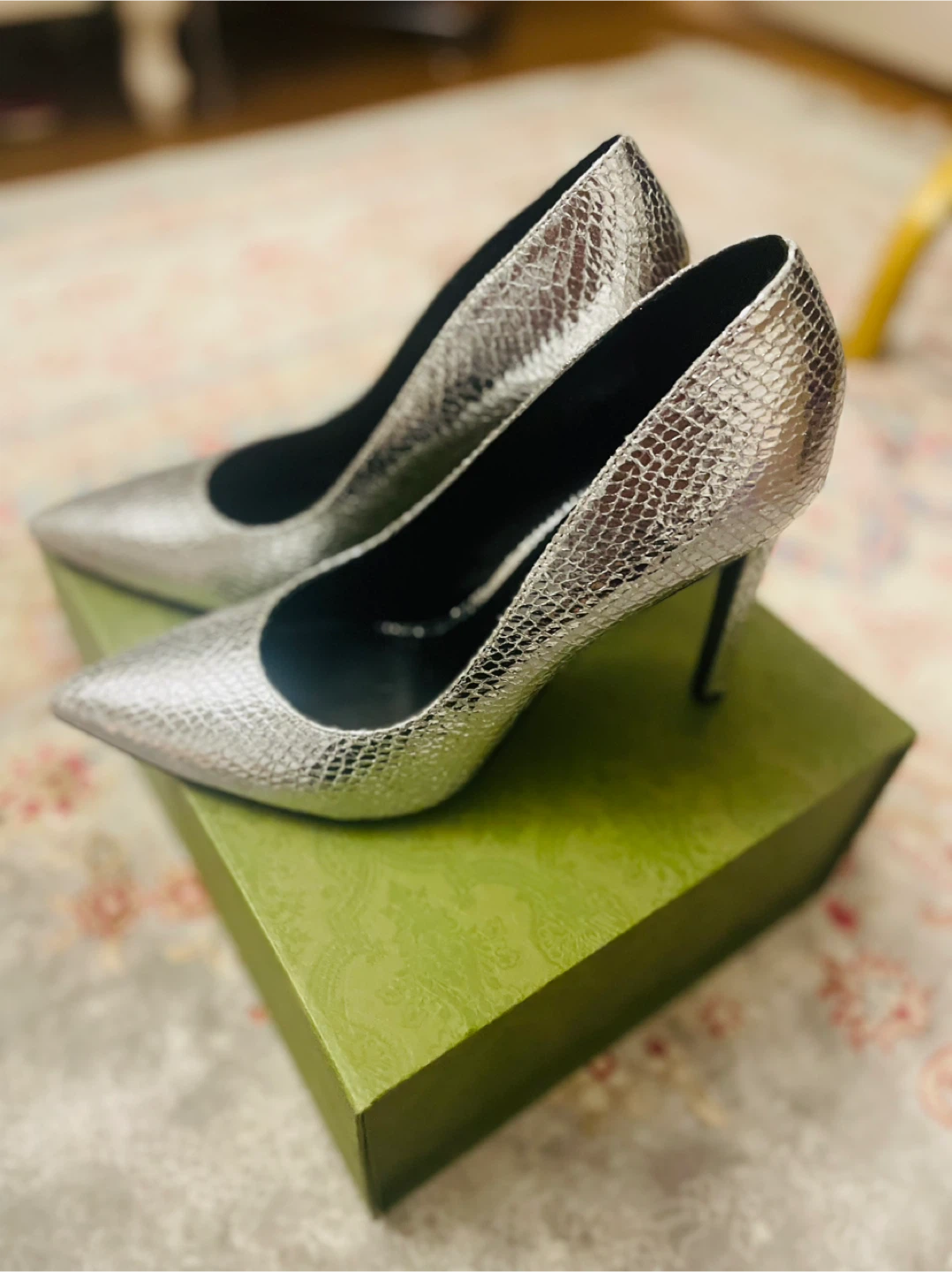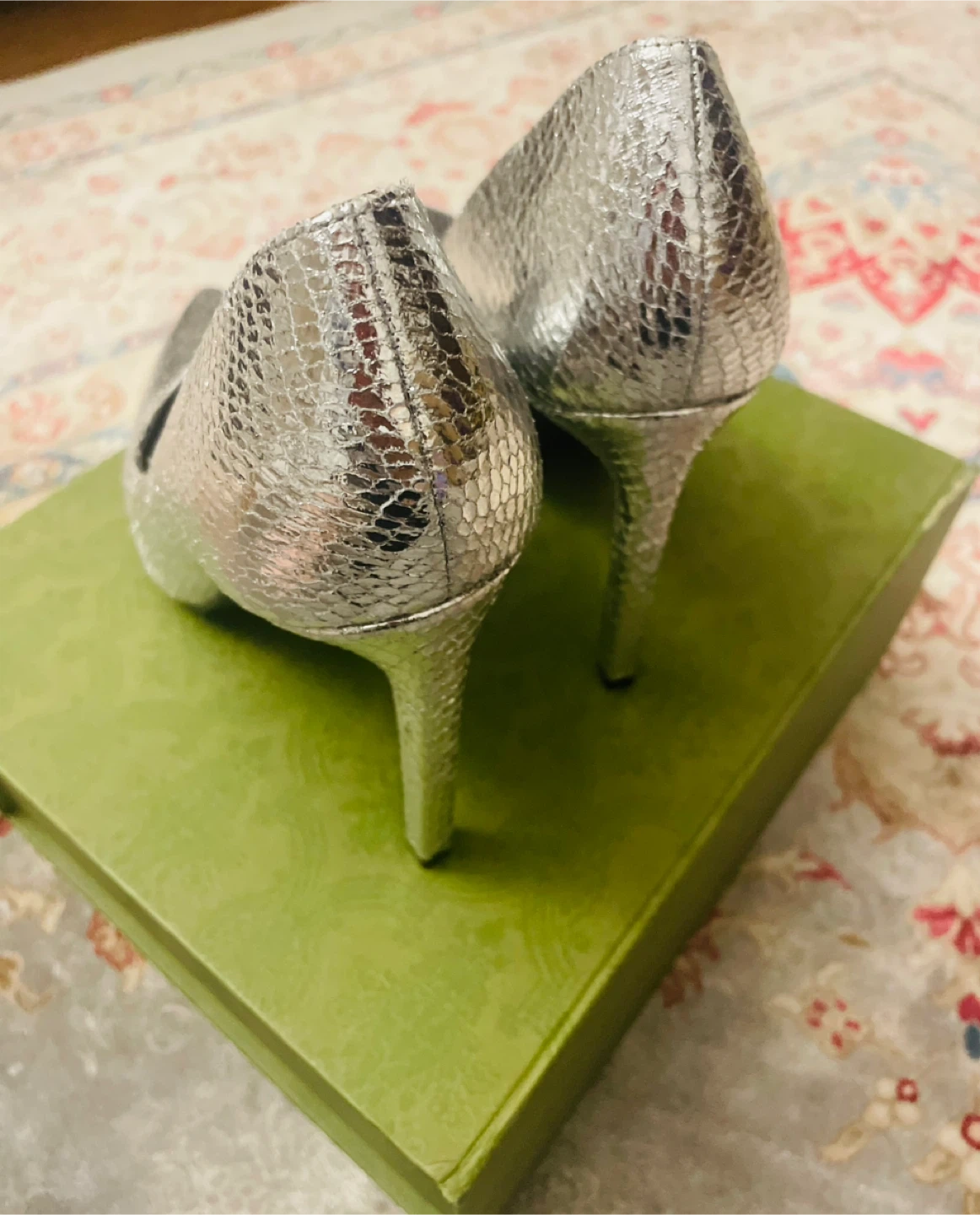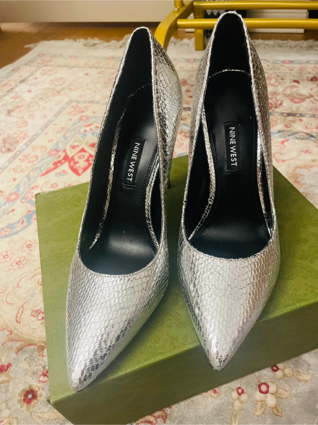 These are some silver heels from Nine West! They have a snakeskin-like texture, chic beautiful ready for new owner size US 7.5