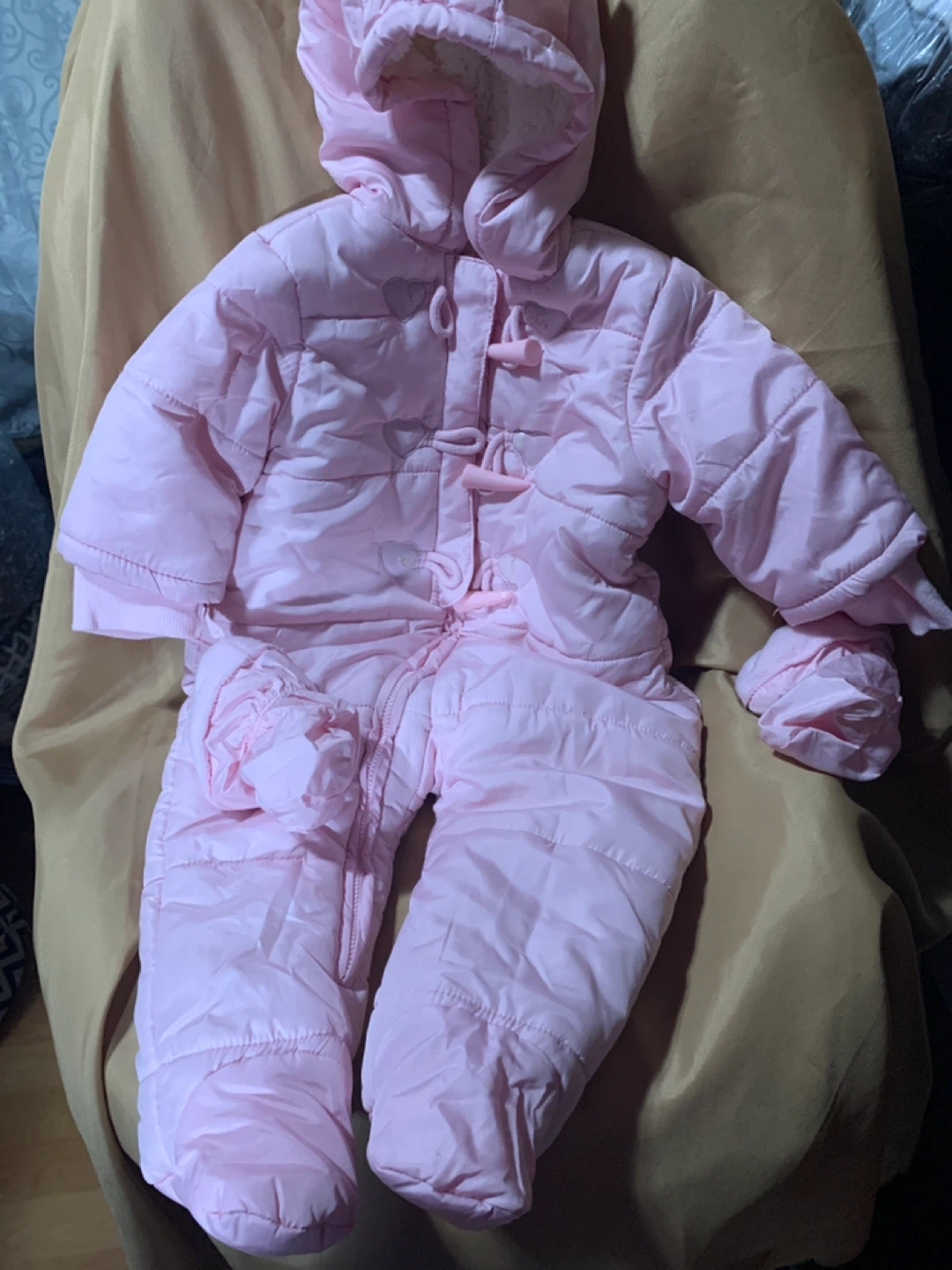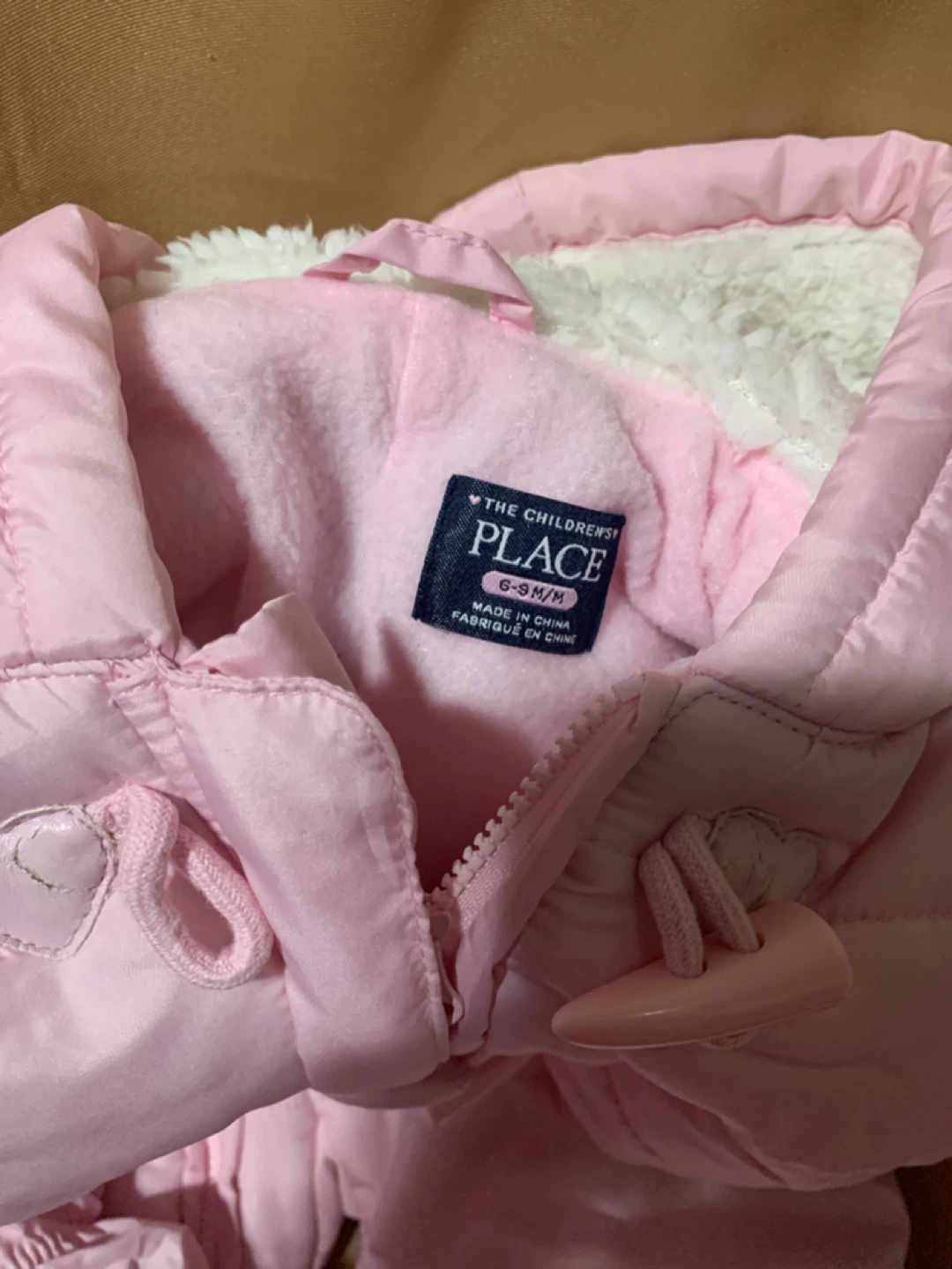 A super cute and warm snowsuit from The Children's Place! It's pink and size 6-9 months. Perfect for keeping your little one cozy this winter