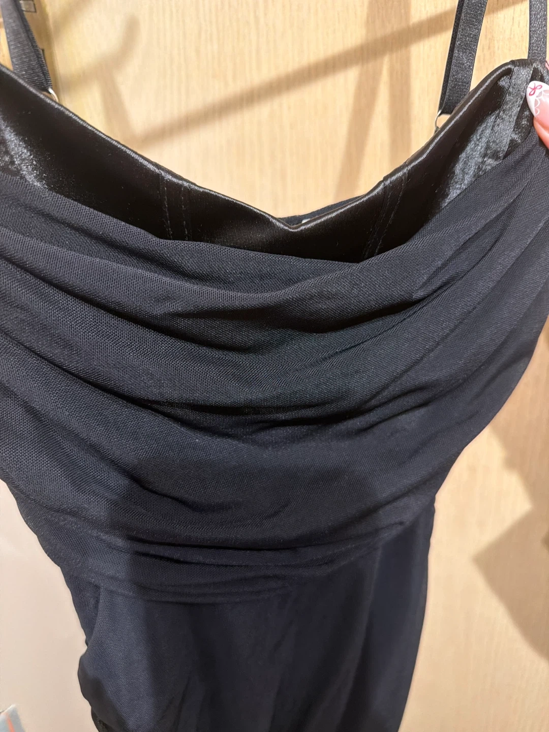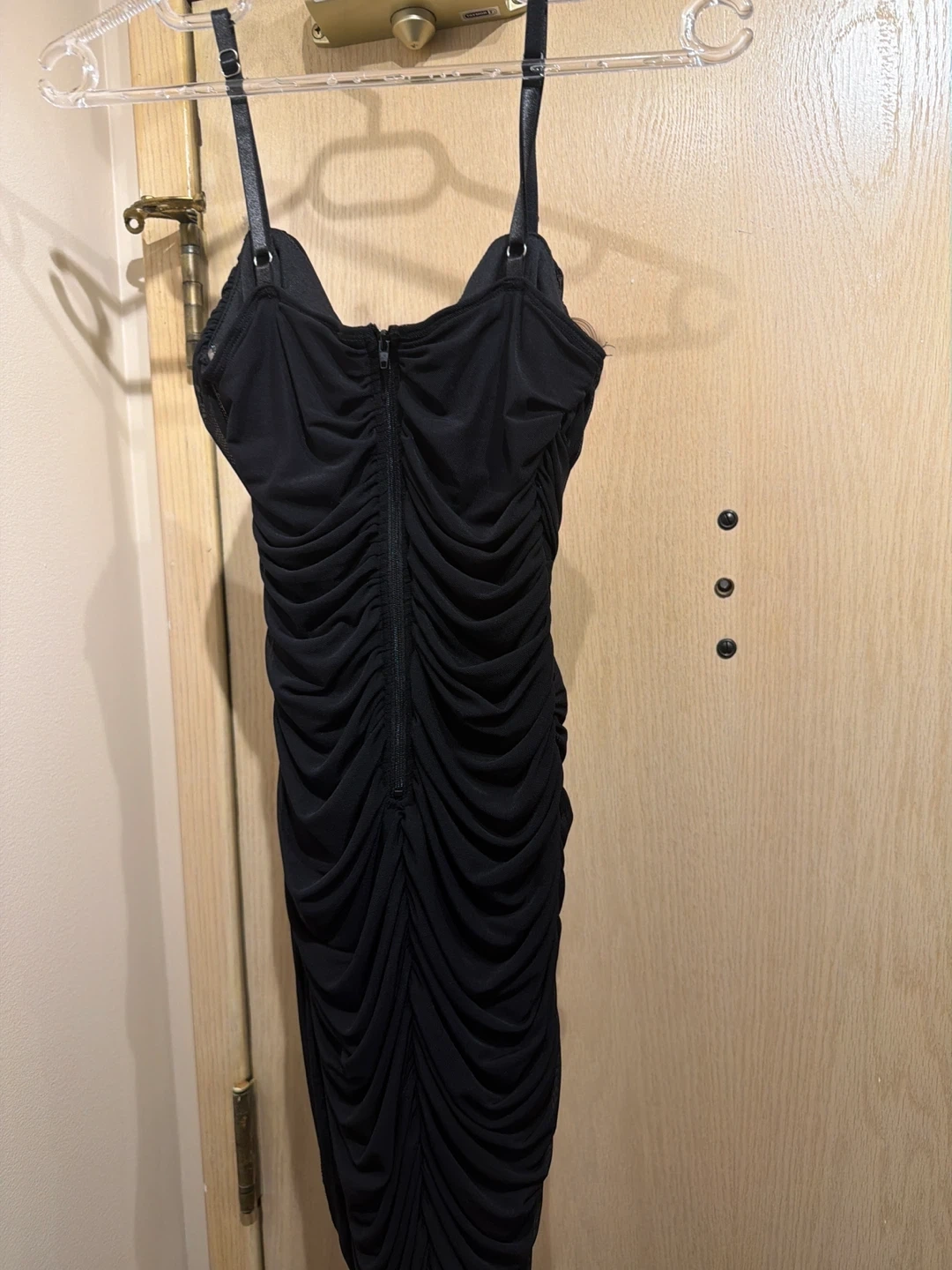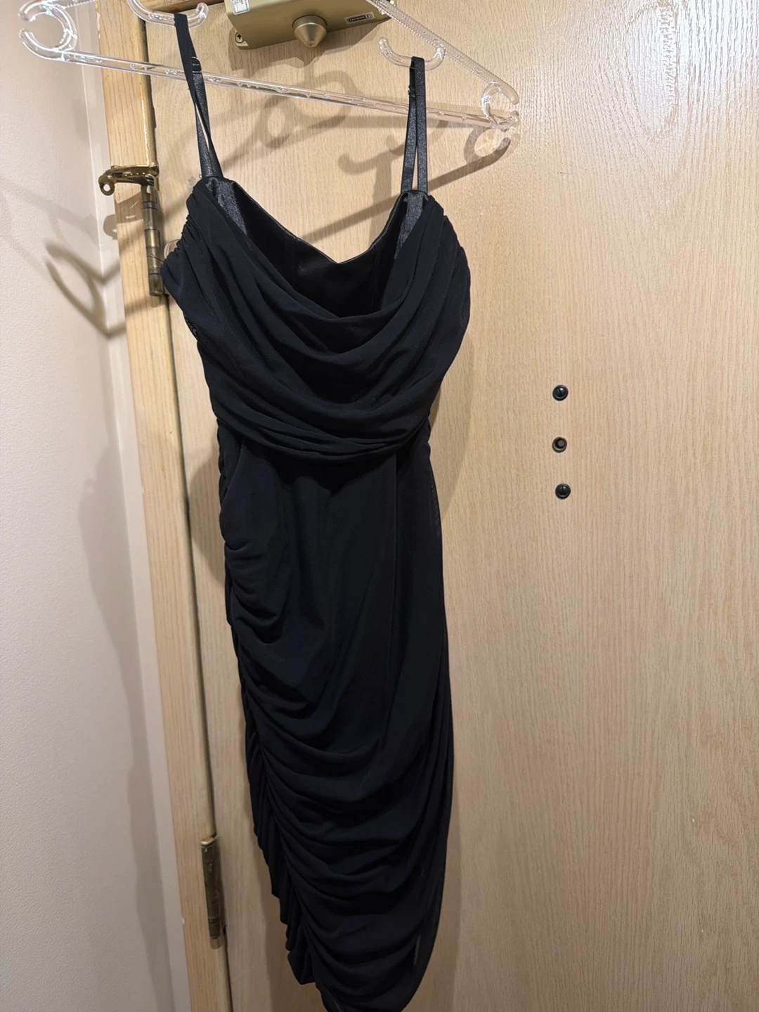 Selling a stylish black dress with a ruched design. It's in great condition and ready for a new owner!