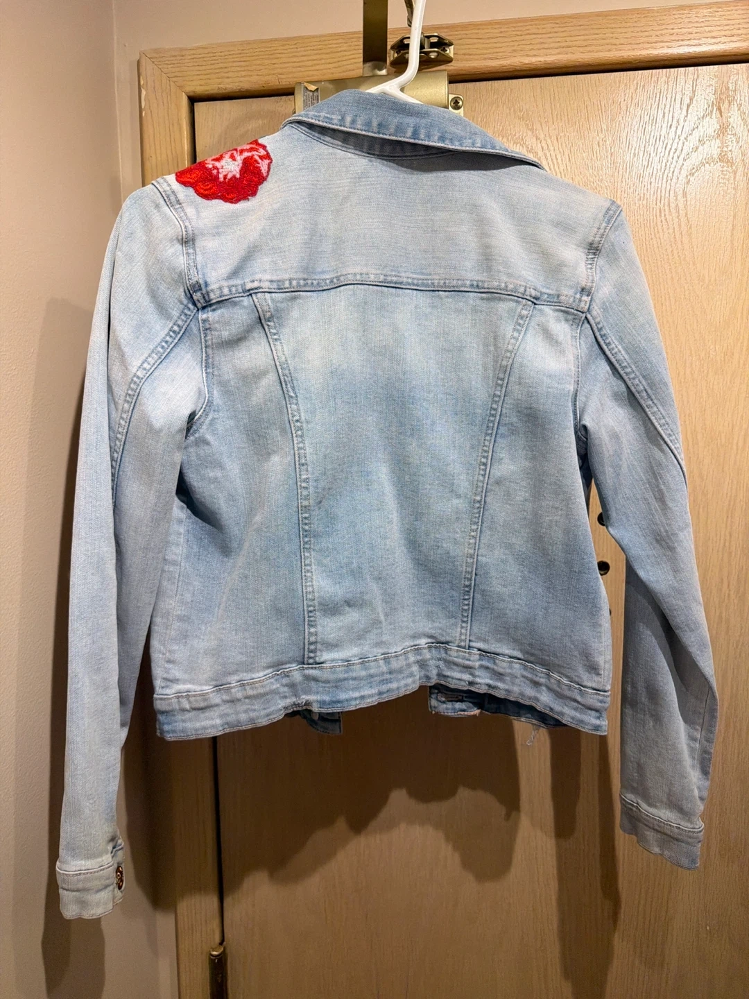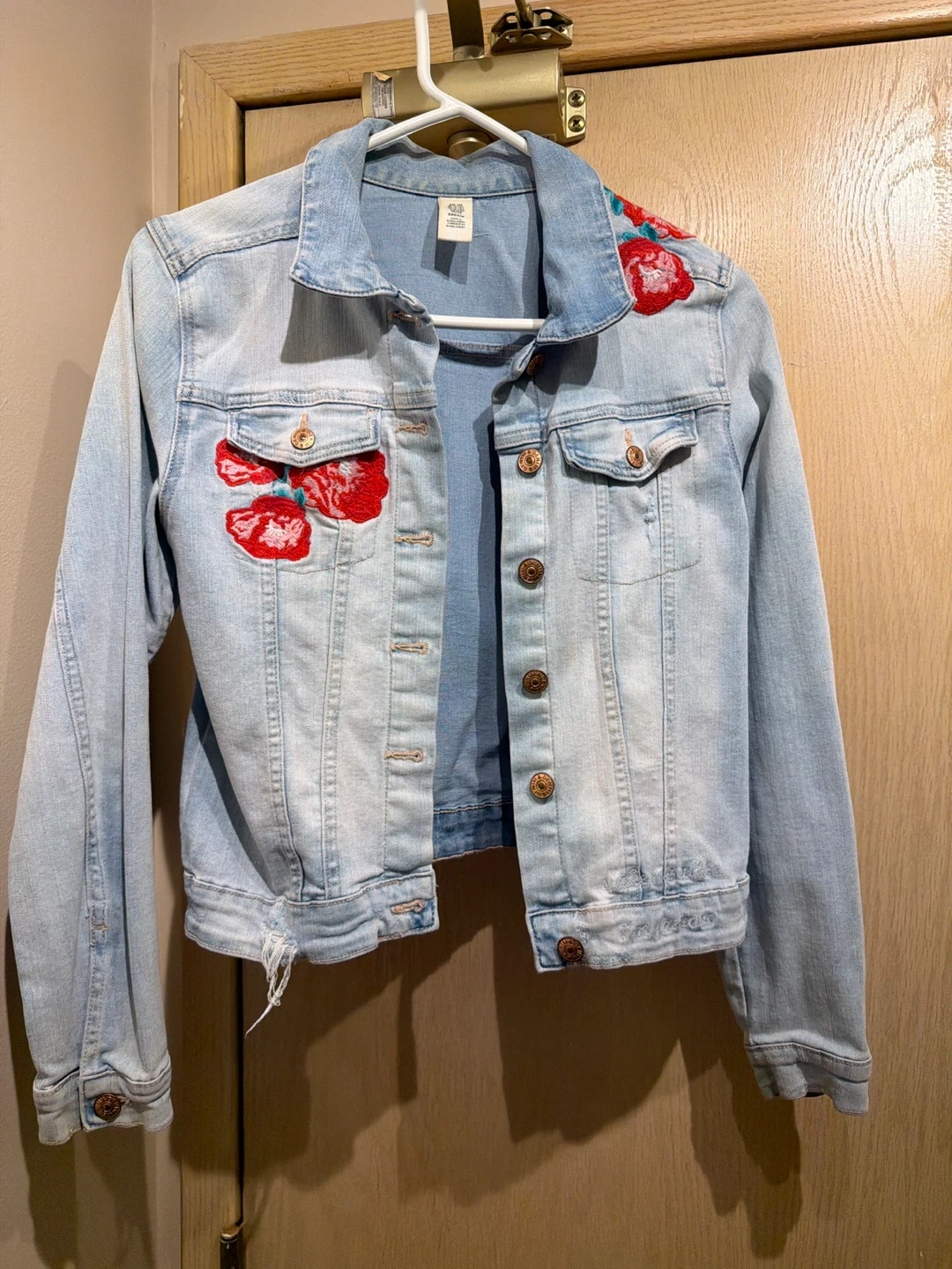 Selling a cute denim jacket from H&M! It's a light wash denim with red floral embroidery on the front and shoulder. It's a size small and in great condition, ready for a new home!