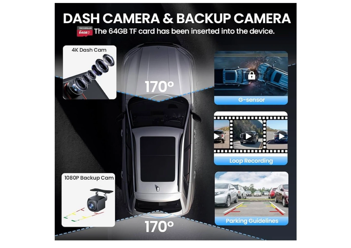 Selling a Tecxerllon dash camera and backup camera combo! It features a 4K dash cam and a 1080P backup camera. A 64GB TF card is included. It also features G-sensor and loop recording.
