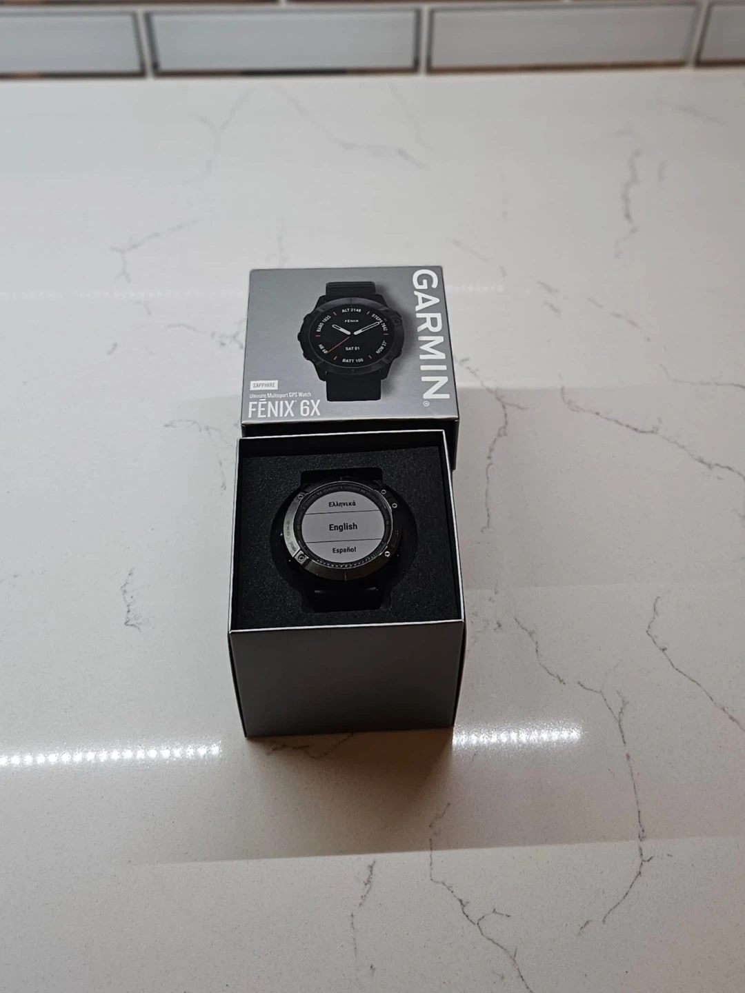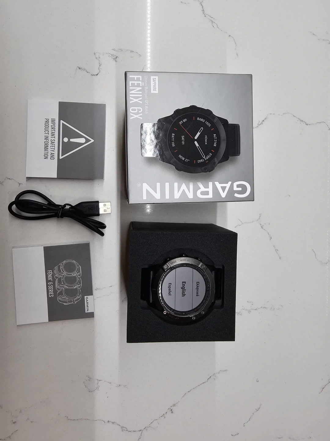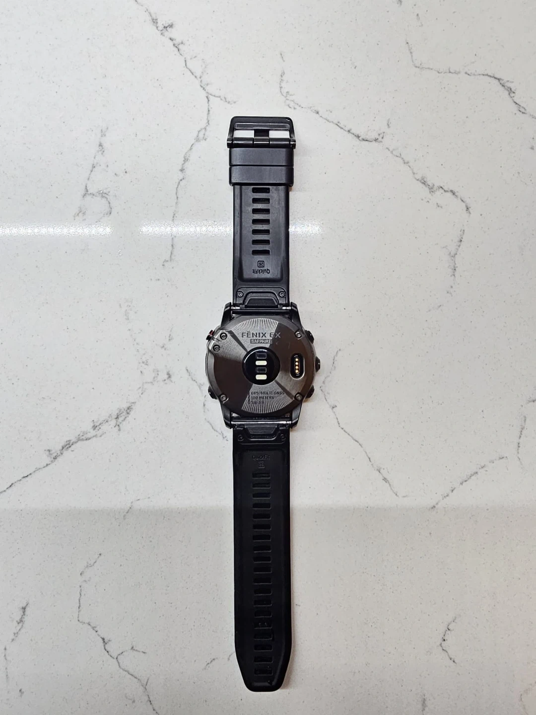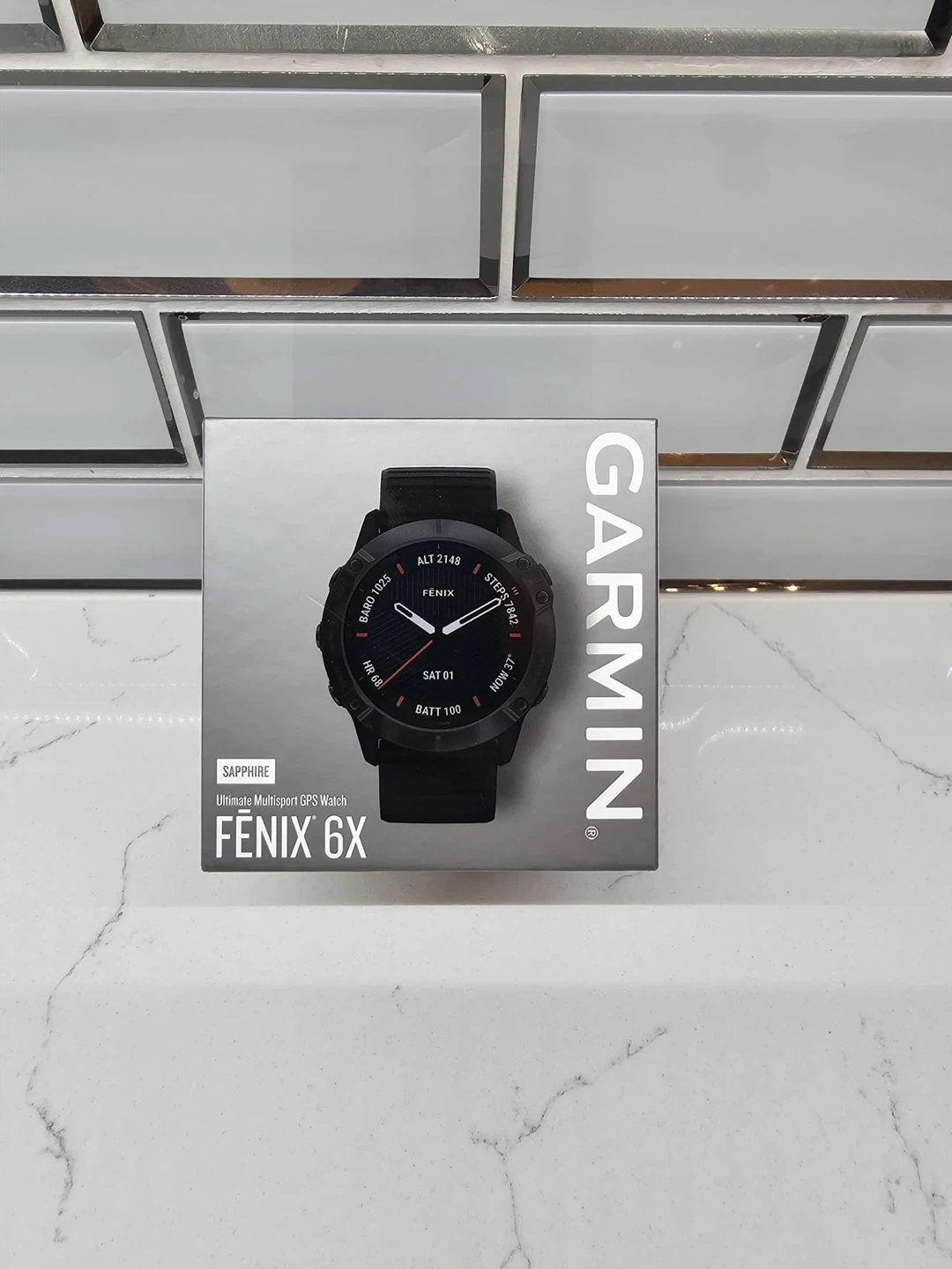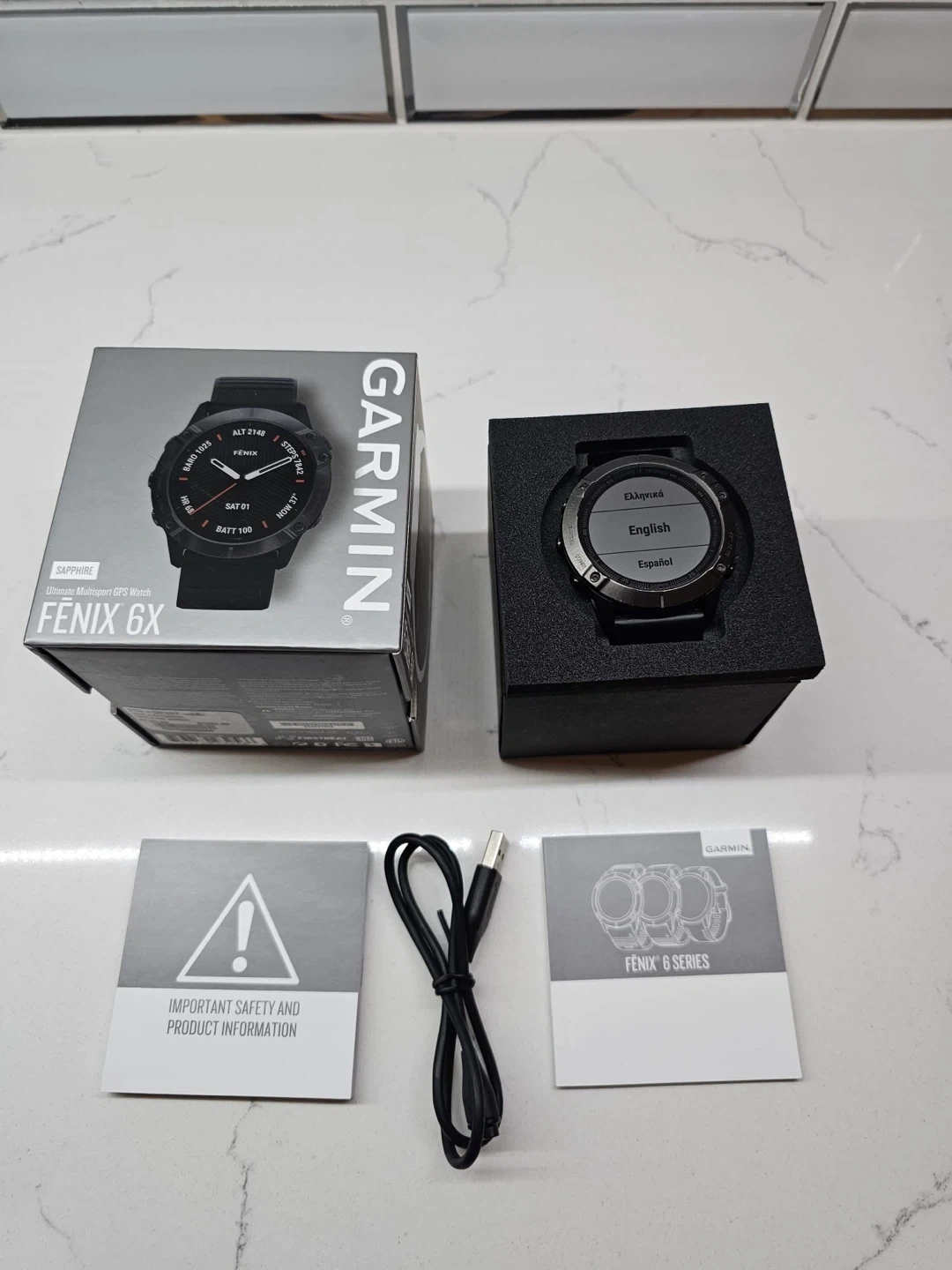 Garmin Fenix 6X Sapphire multisport GPS watch for sale. Pristine condition and gently used, fully functional with no issues. Sapphire glass is scratch-resistant and looks fantastic.