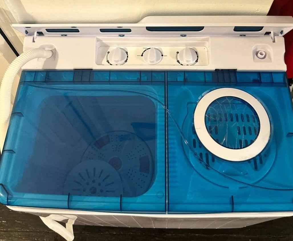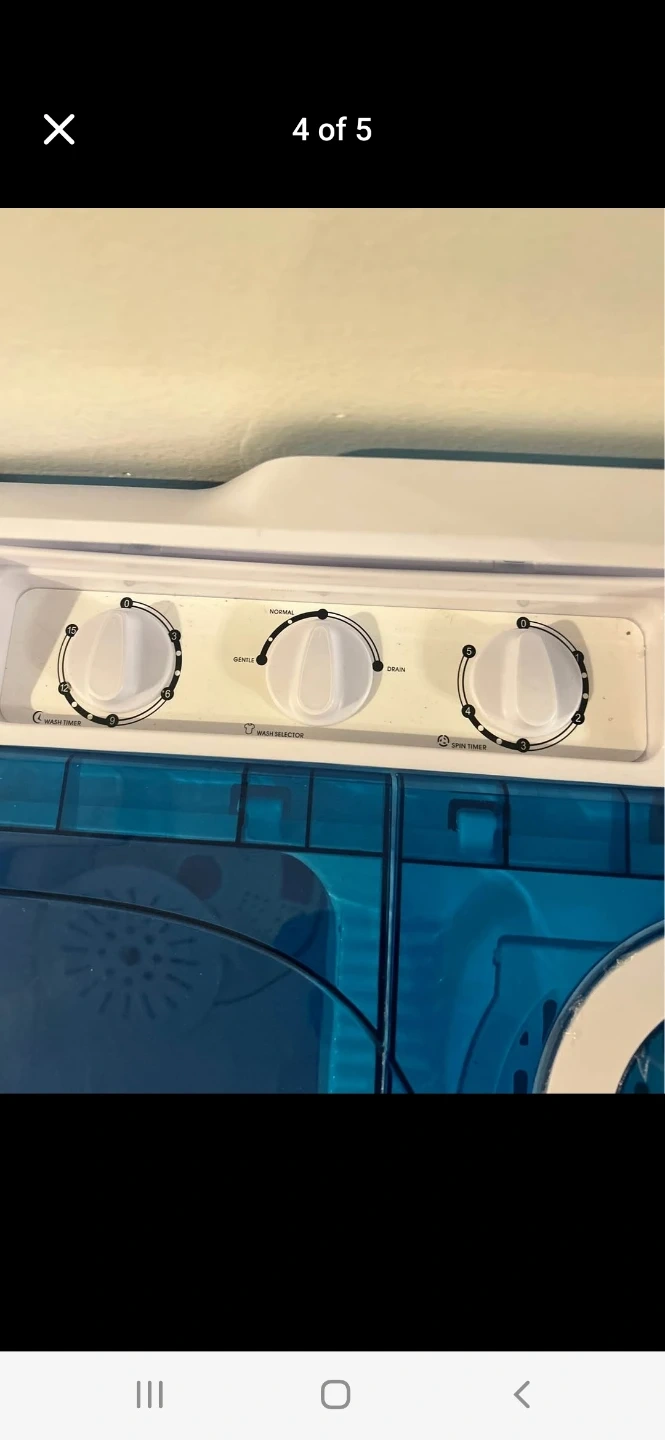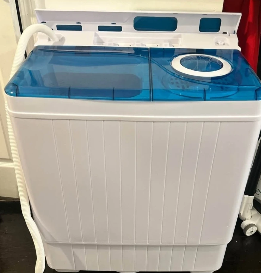 Selling a portable washing machine in blue and white. It's great for small spaces and easy to use. Perfect for apartments, dorms, or camping!great work.barly use almost 3 times.cash only