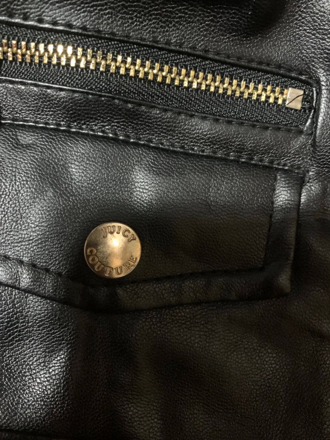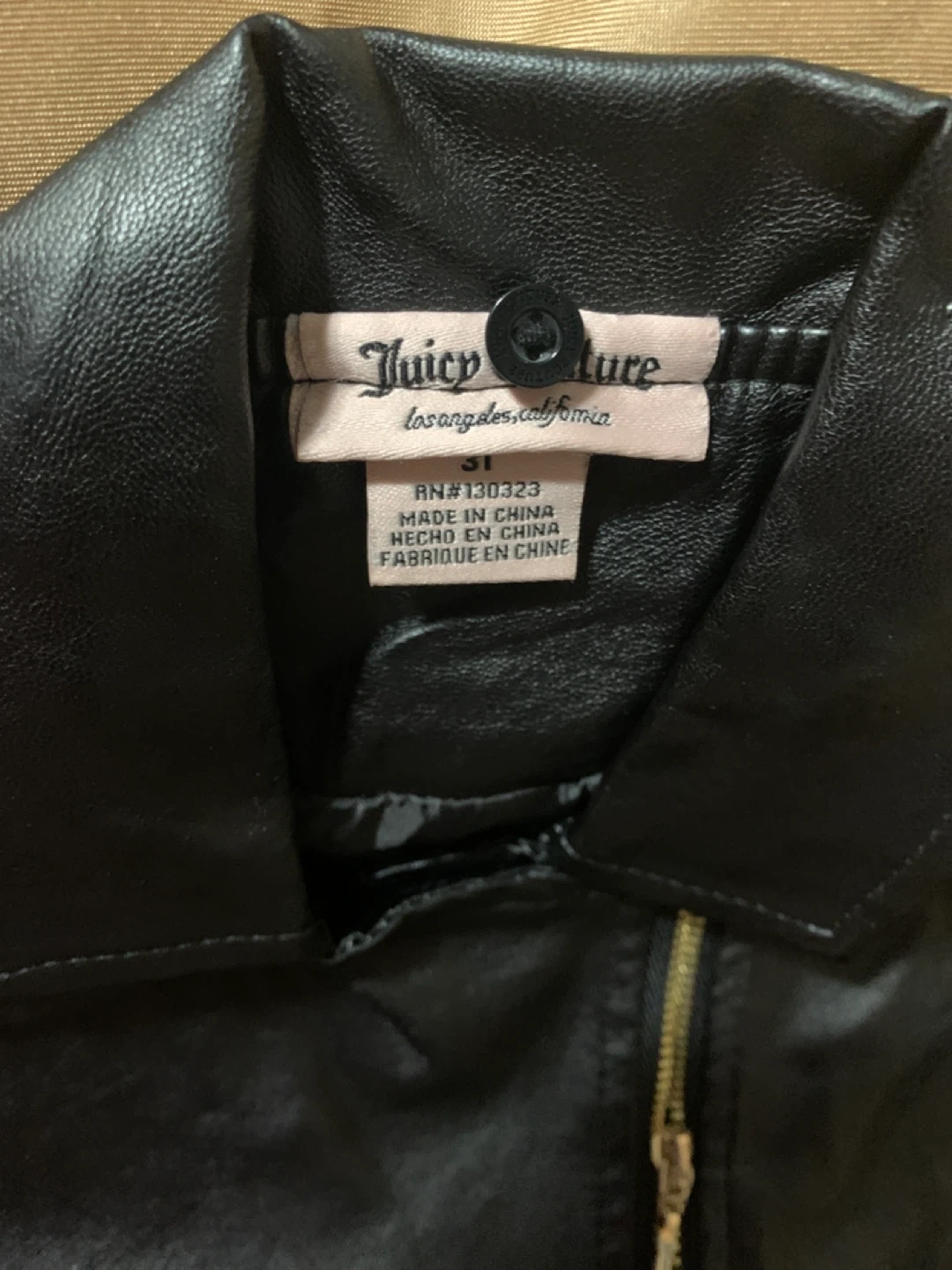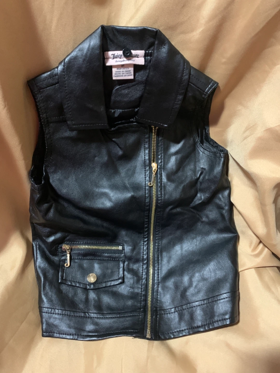 Here's a cute Juicy Couture vest made of black faux leather for your little one! It's in great condition and features a zipper closure and a small pocket detail. The size is 3T.