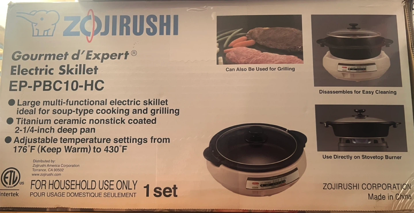 I'm selling a Zojirushi Gourmet d'Expert Electric Skillet, model EP-PBC10-HC. It's a large, multi-functional electric skillet perfect for soup-type cooking and grilling. It features a titanium ceramic nonstick coated 2-1/4-inch deep pan and adjustable temperature settings from 176°F (Keep Warm) to 430°F. It can also be used for grilling and disassembles for easy cleaning! The skillet can be used directly on a stovetop burner as well. Comes in the original box!