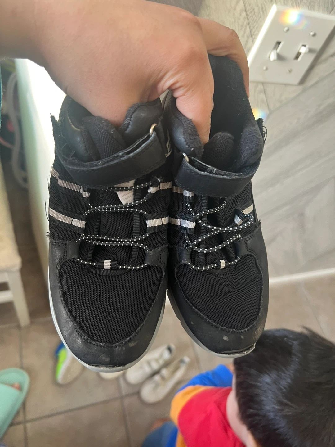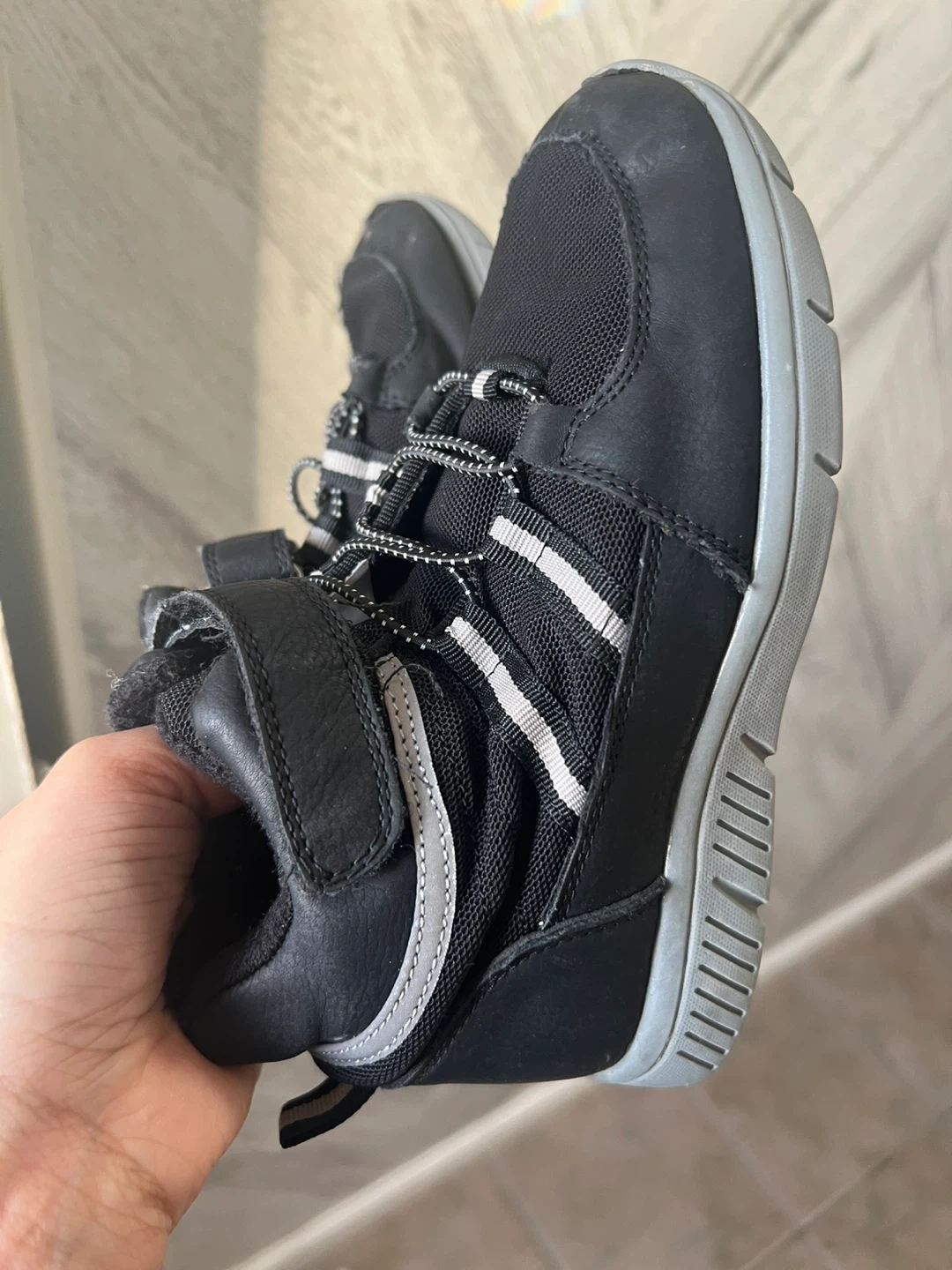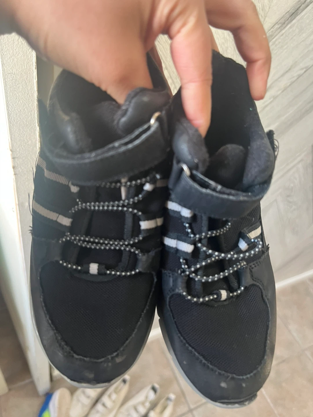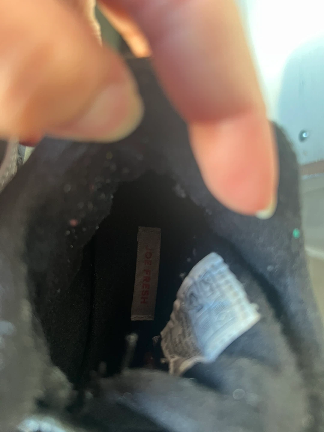 Selling a pair of Joe Fresh kids' boots in black. They have a lace-up design with a velcro strap for easy wear. Perfect for everyday adventures!