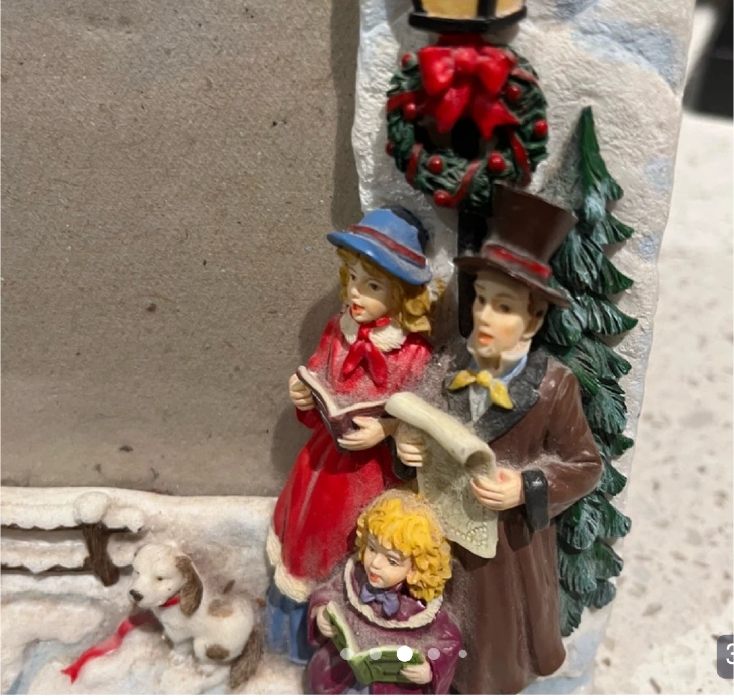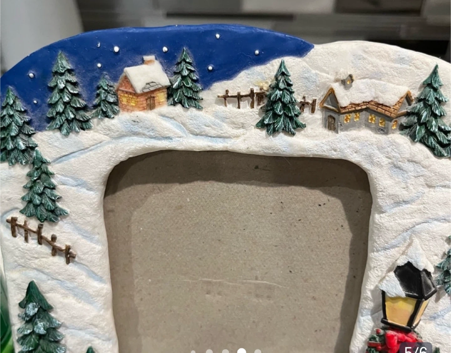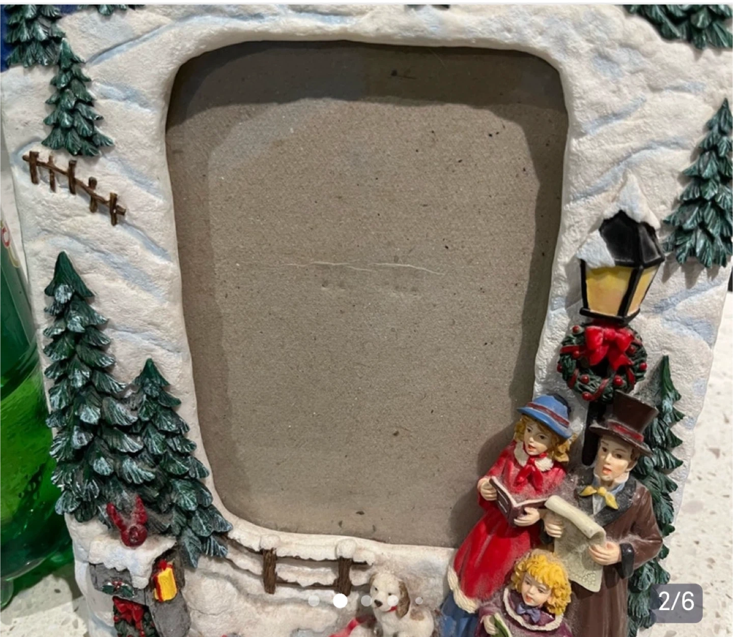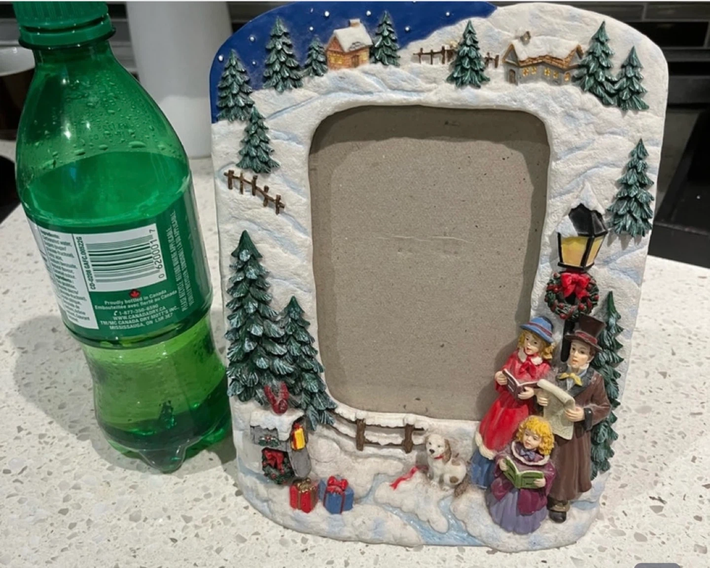 A cute picture frame with a winter scene! Perfect for displaying your favourite holiday photos. It features carolers, snowy houses, and Christmas trees