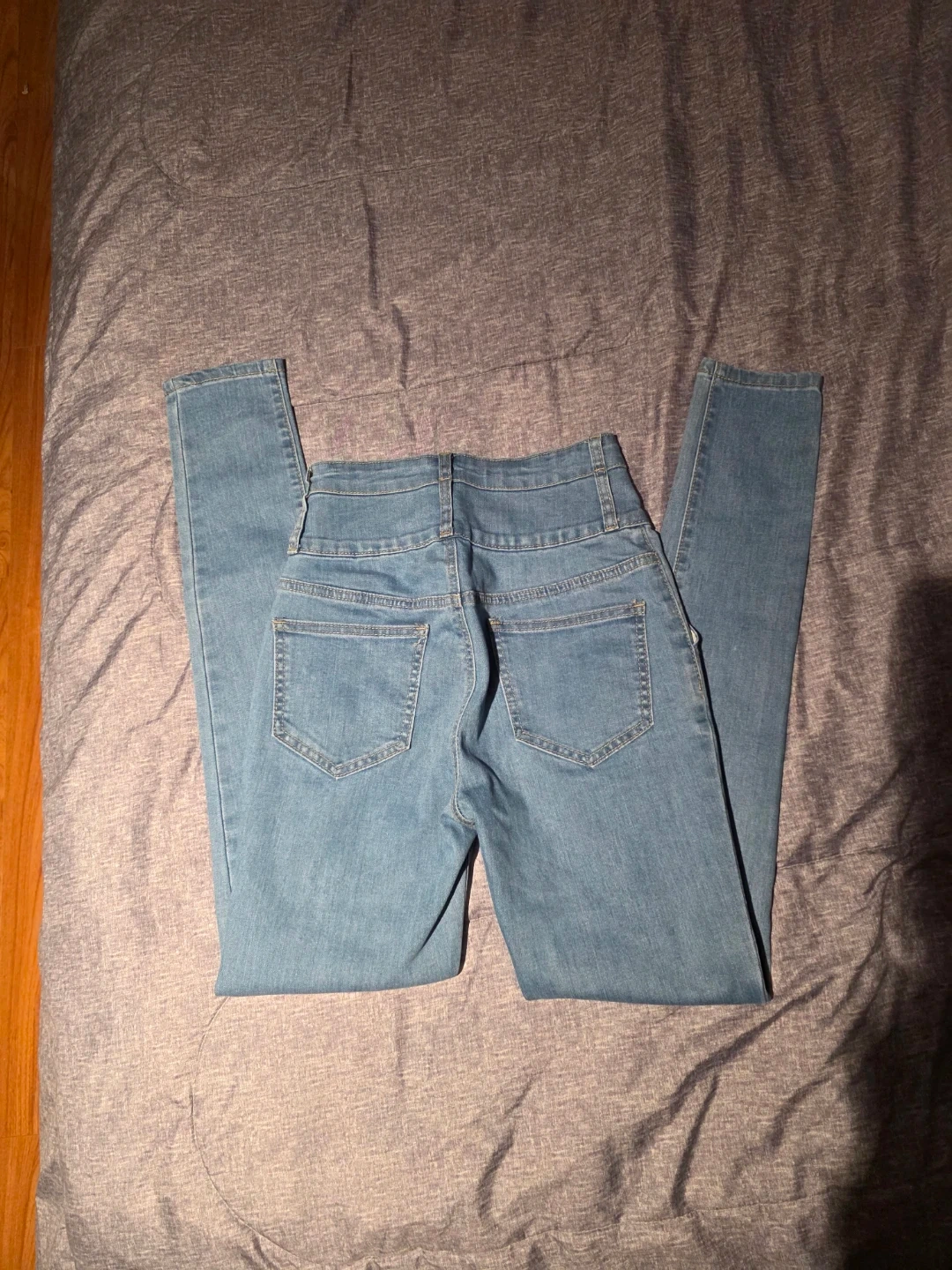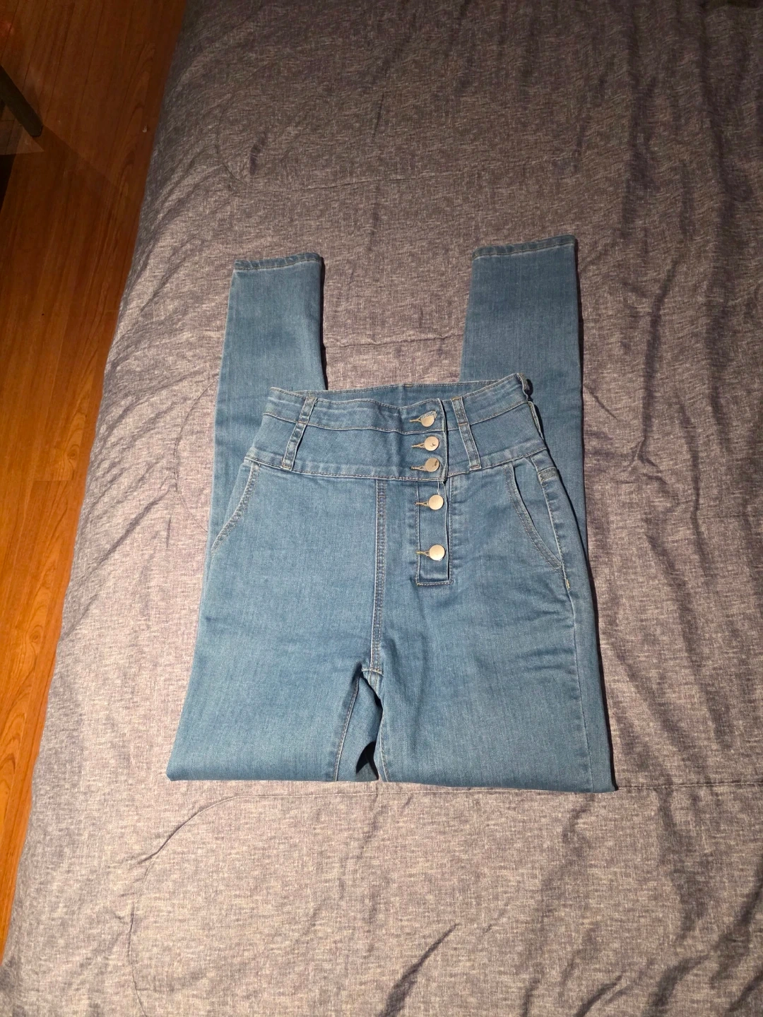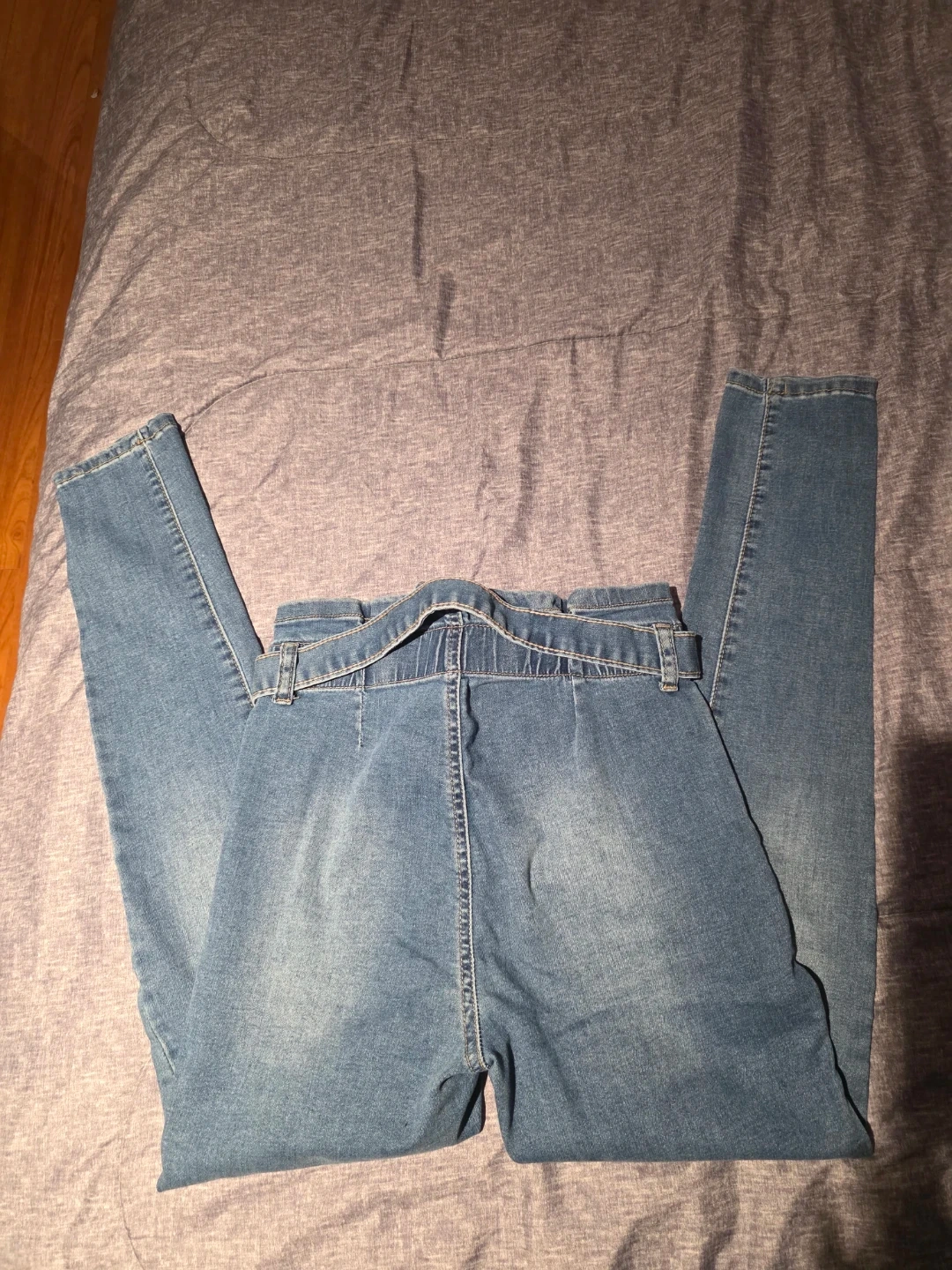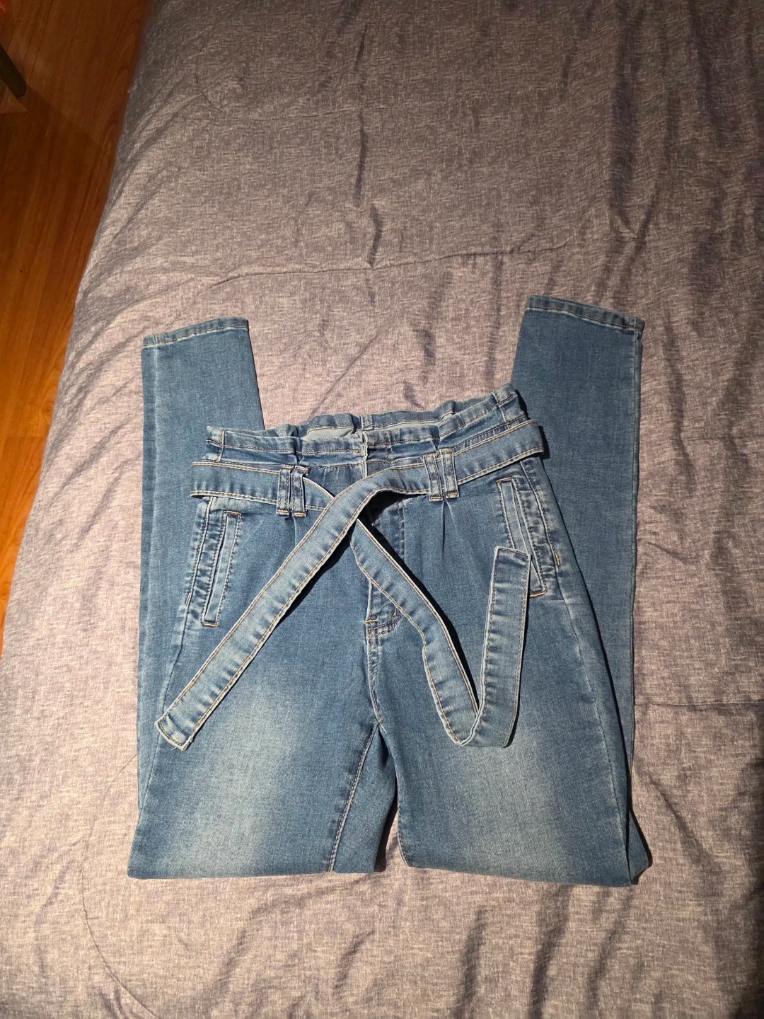 Selling a pair of high waisted denim jeans. They are in great condition and ready for a new owner! They feature a stylish belted waist and a comfortable fit. Perfect for everyday wear!