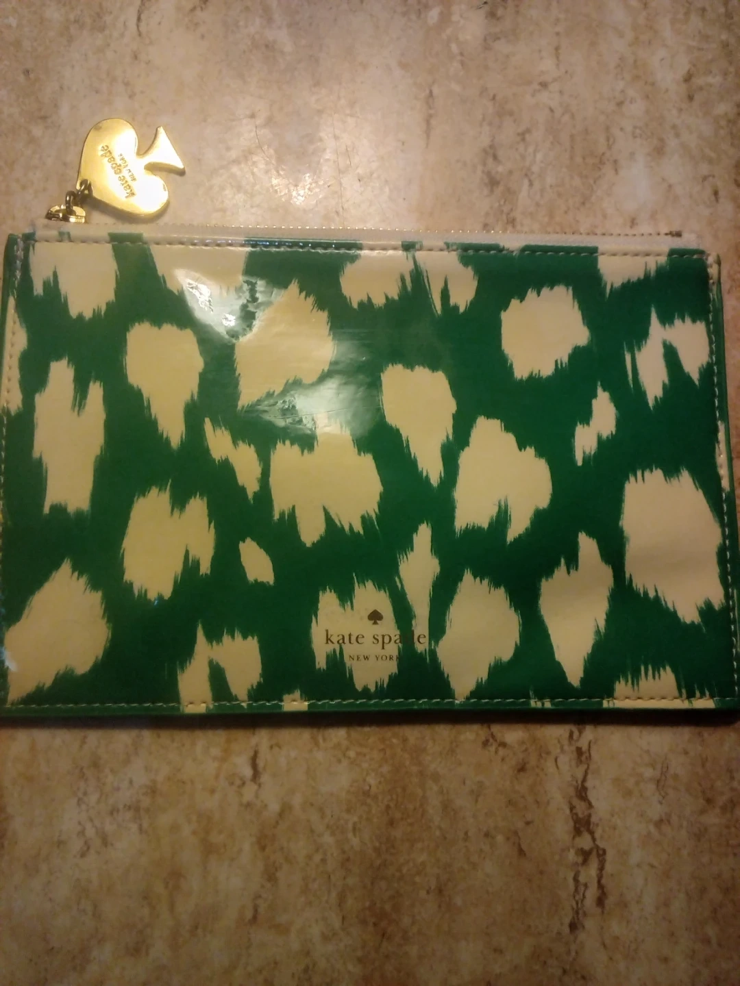 Selling a Kate Spade wallet in a green and cream pattern. It's in great condition and perfect for carrying your essentials! The wallet features a zipper closure and a heart-shaped charm.