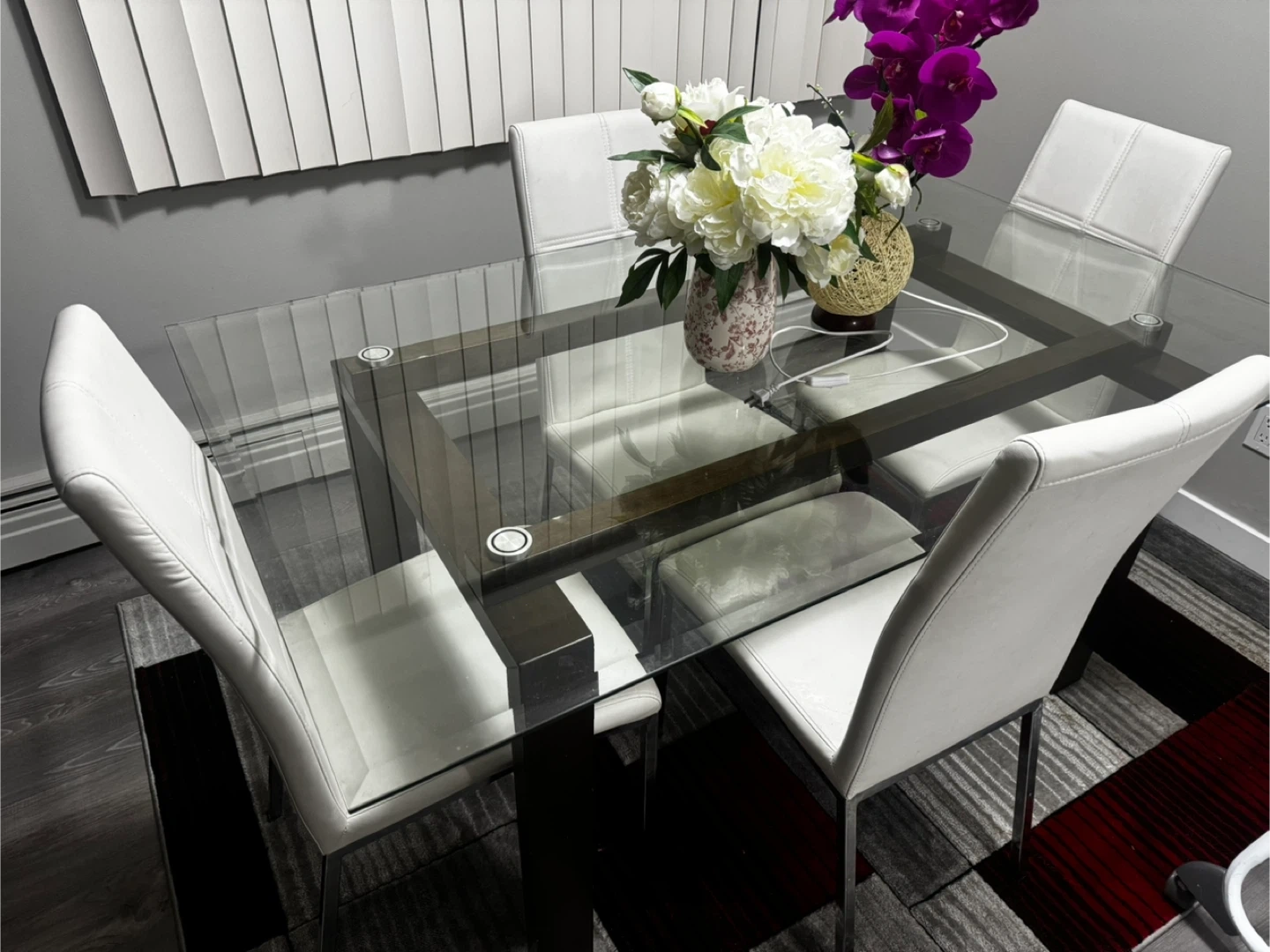 Selling a dining table with a glass top and four chairs. The chairs are white and have a modern look. The table is in good condition and would be great for a small dining area or kitchen!