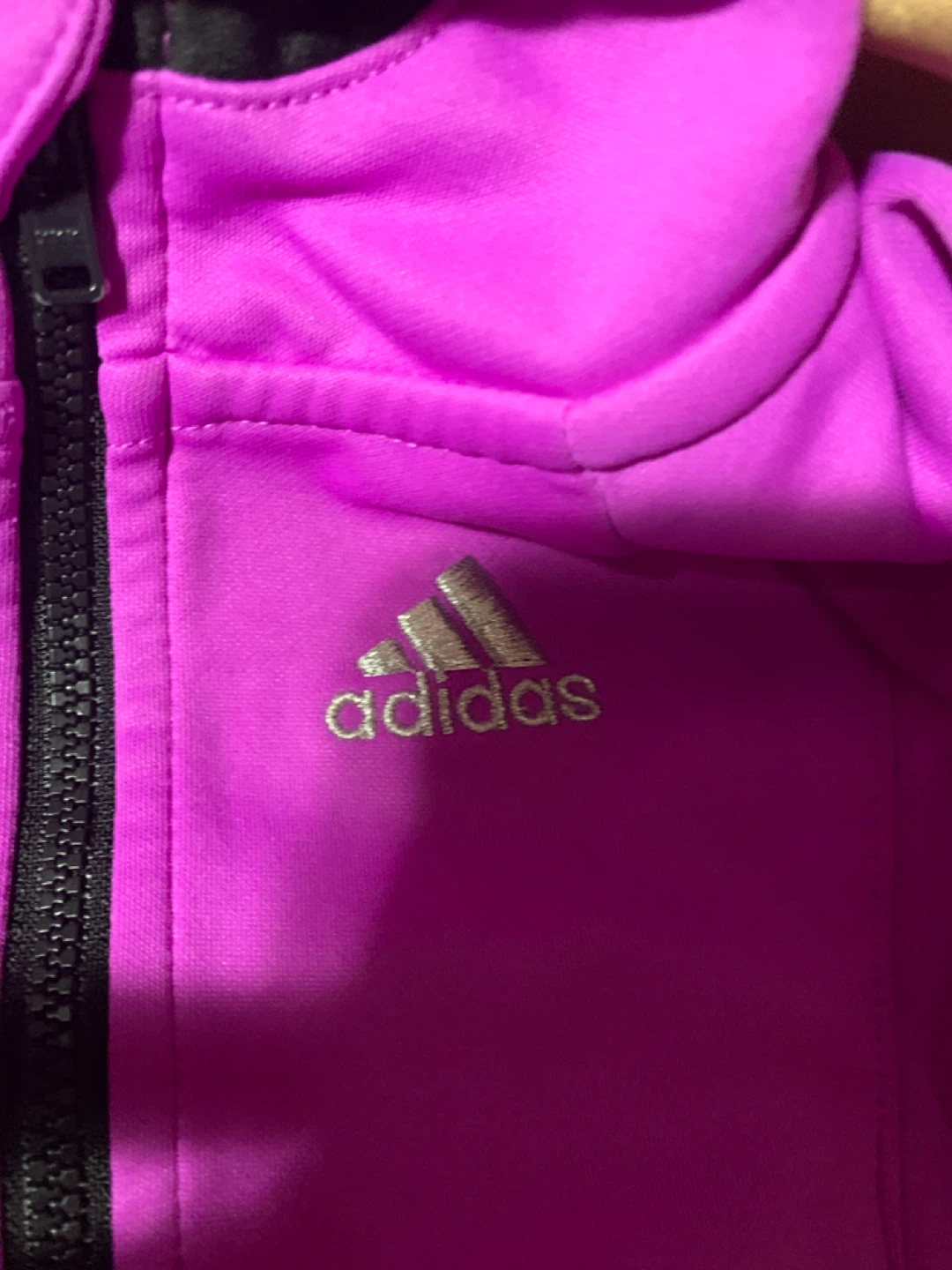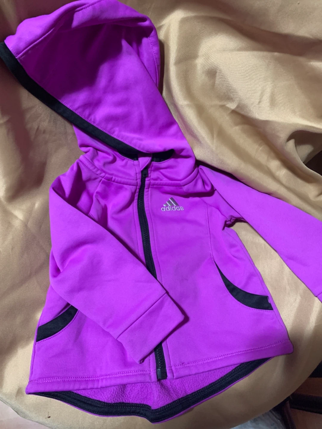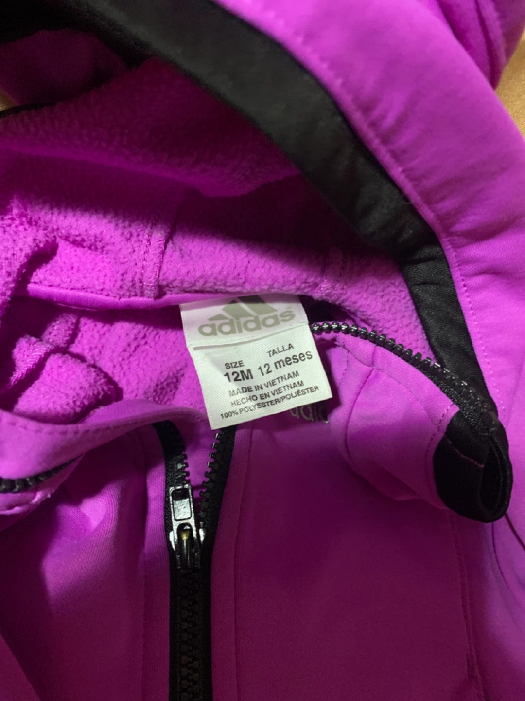Here's a cute Adidas jacket for a little one! It's in a vibrant purple colour with black detailing. The size is 12M, perfect for a baby or toddler.