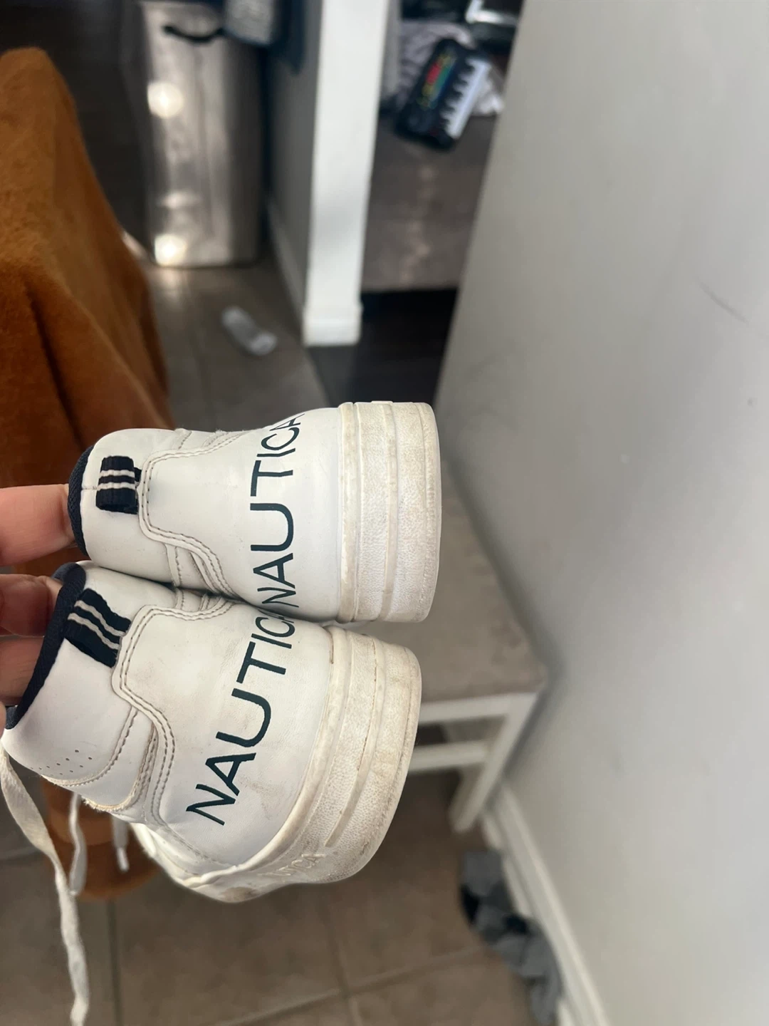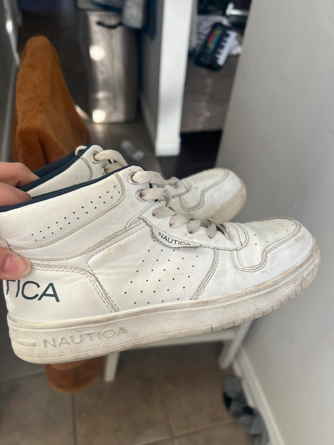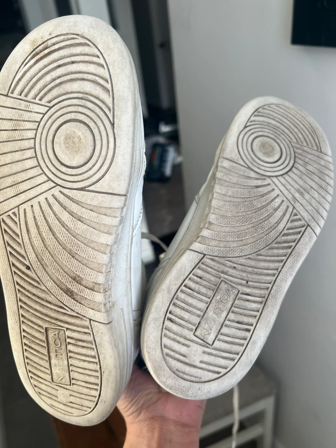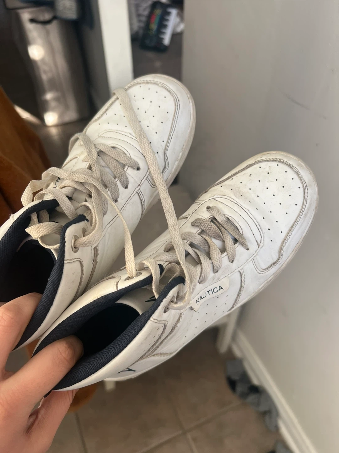 Selling a pair of Nautica white leather sneakers. They show signs of wear, as you can see in the photos. Still lots of life left in them!