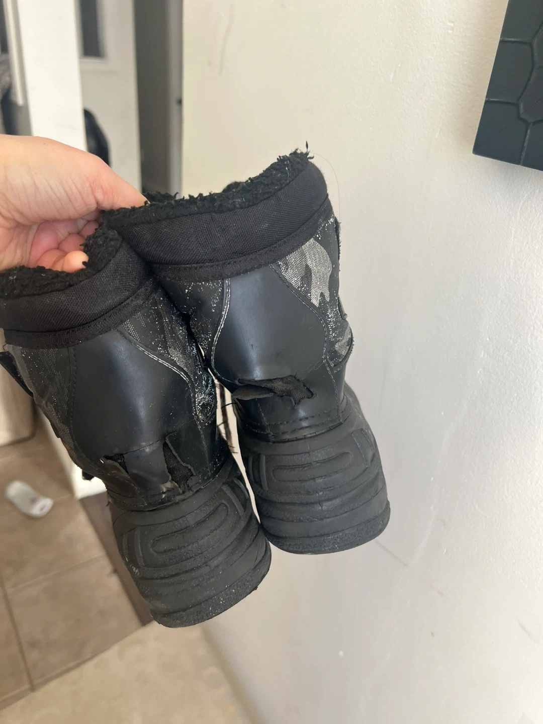 Selling a pair of used black winter boots in size 2. They have some wear and tear, as shown in the photos, but still have plenty of life left for keeping little feet warm this winter