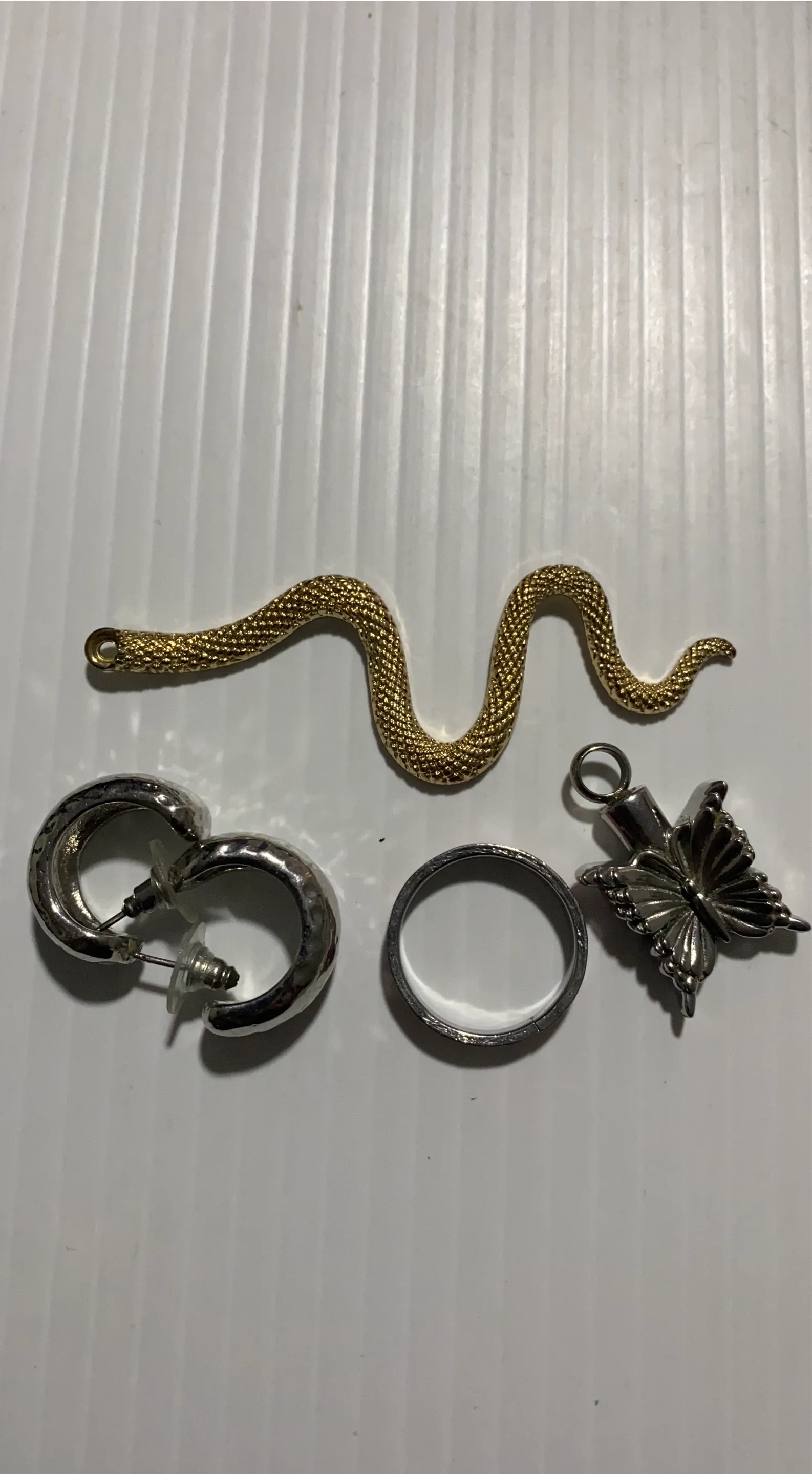 Selling a collection of assorted jewellery pieces. Includes a gold-toned snake pendant, a silver-toned ring, a pair of silver-toned earrings, and a silver-toned butterfly pendant. All pieces are in good condition!