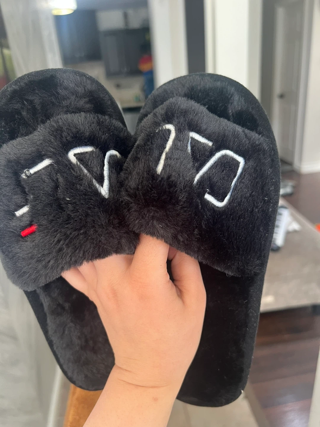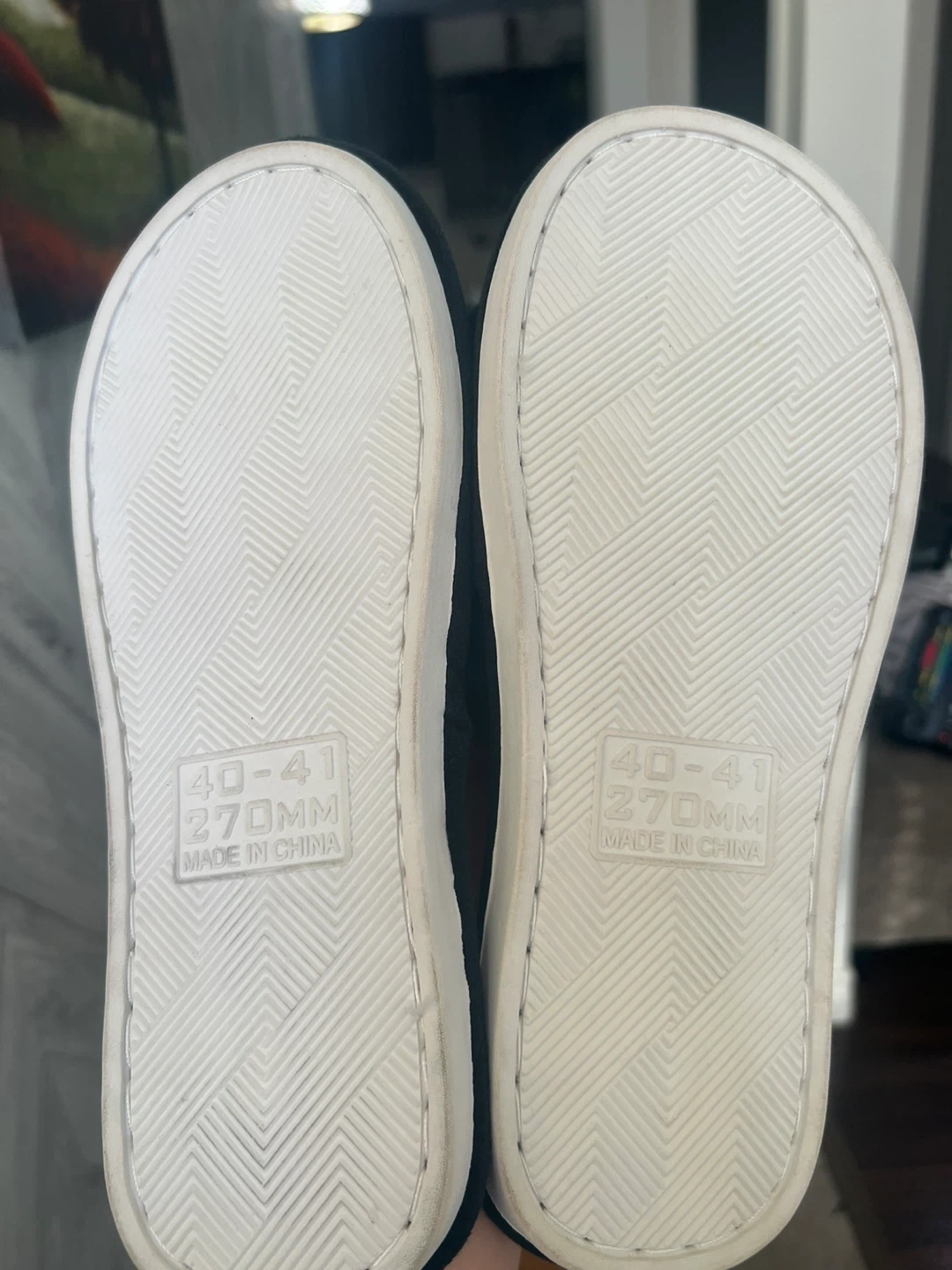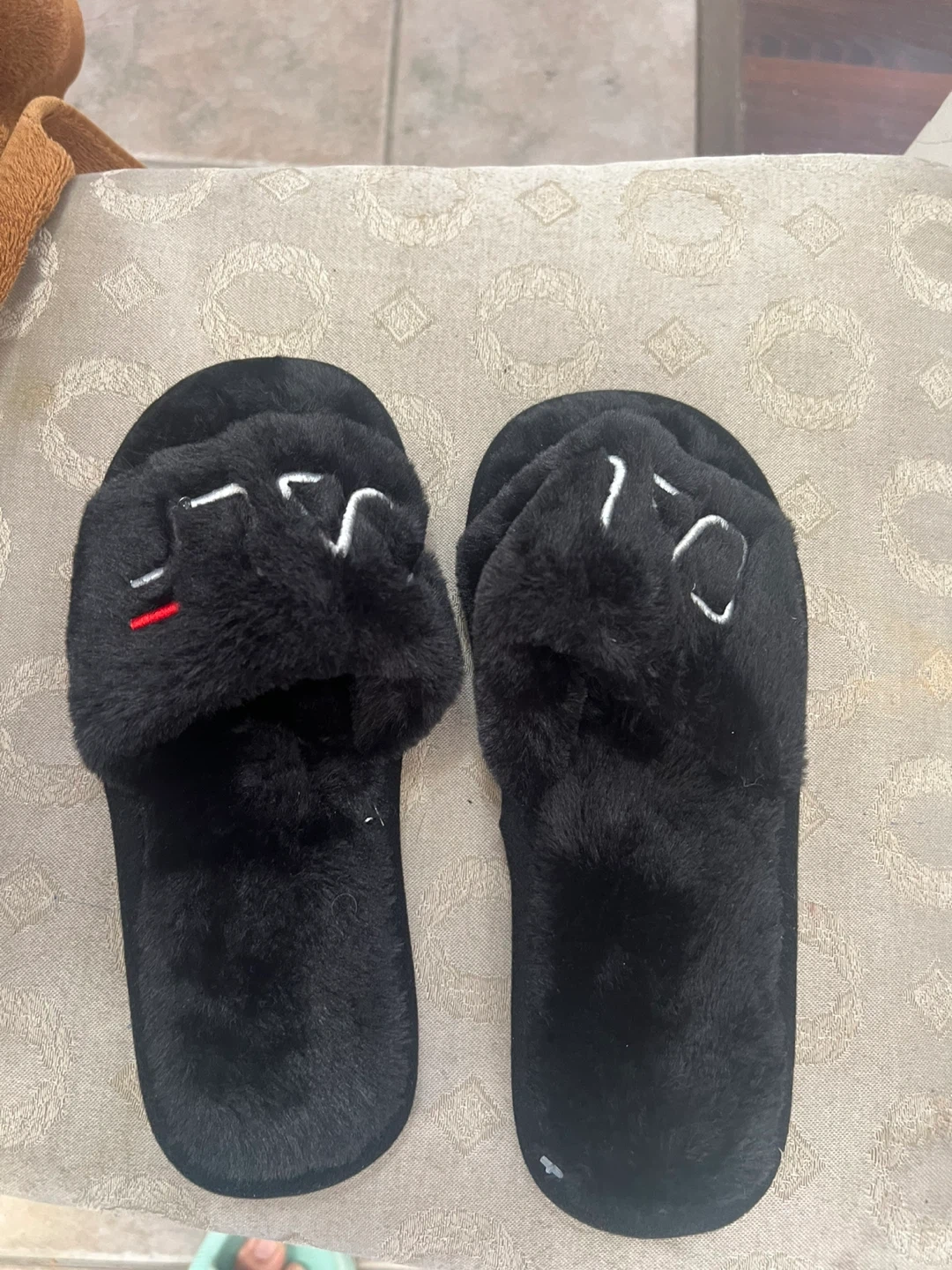 Selling a pair of Fila black furry slippers. They are size 40-41, which is 270mm. Perfect for keeping your feet warm and cozy!