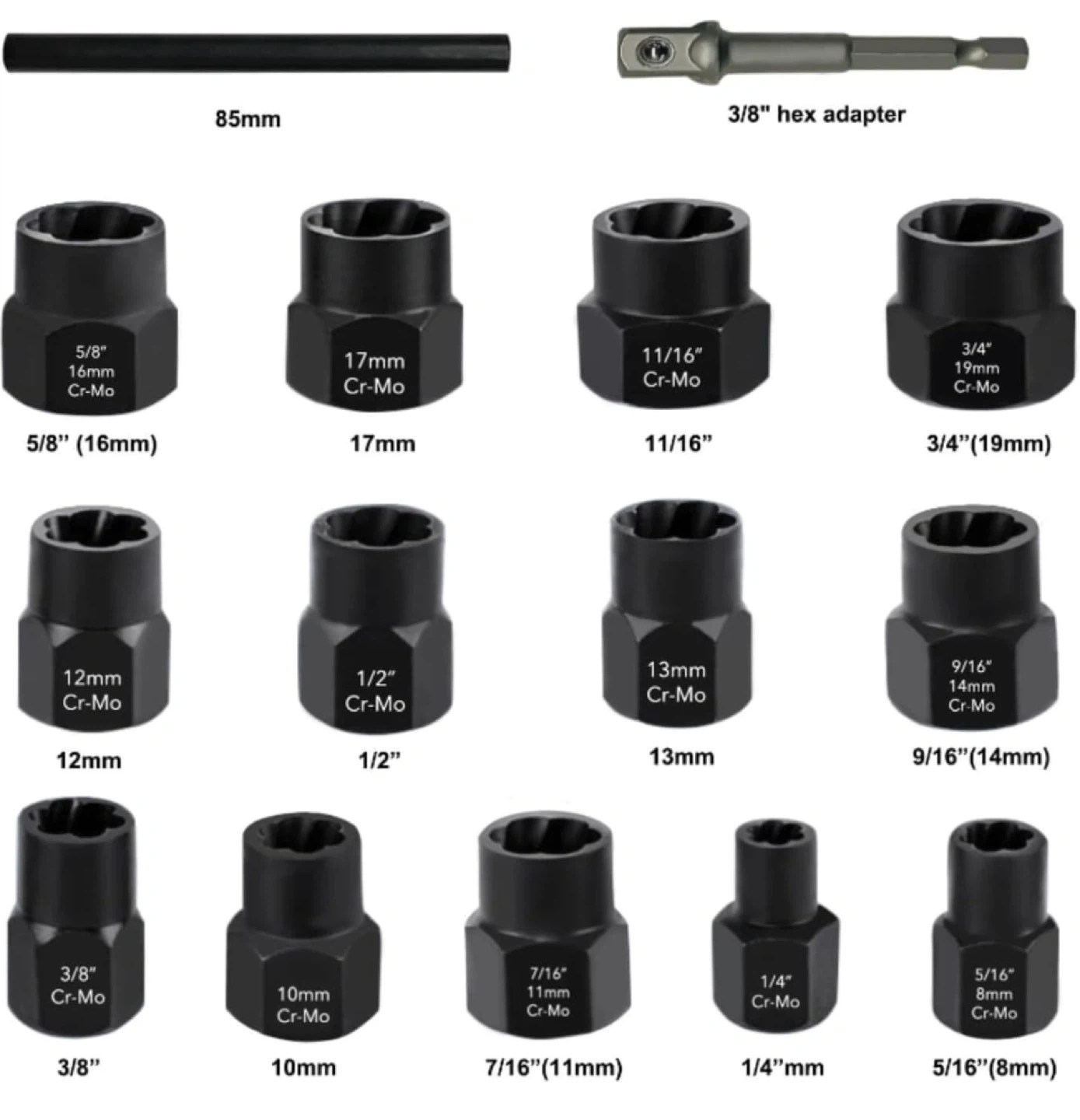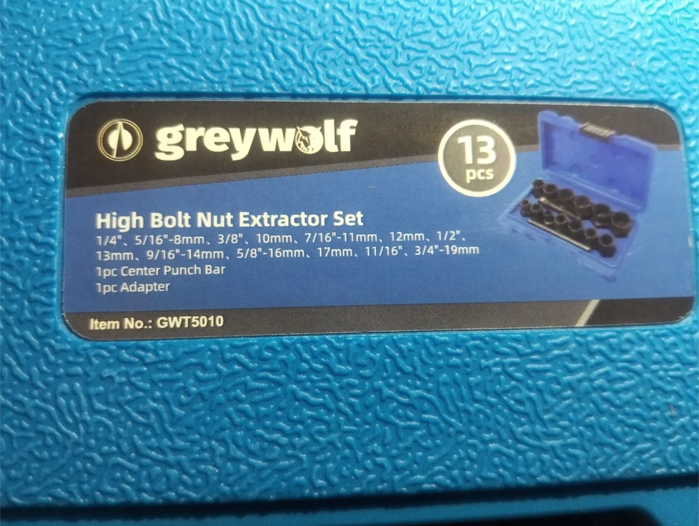 Selling a Greywolf High Bolt Nut Extractor Set. This set includes 13 pieces with sizes ranging from 1/4" to 3/4" (and metric equivalents). It also comes with a center punch bar and an adapter. Great for removing bolts and nuts!
