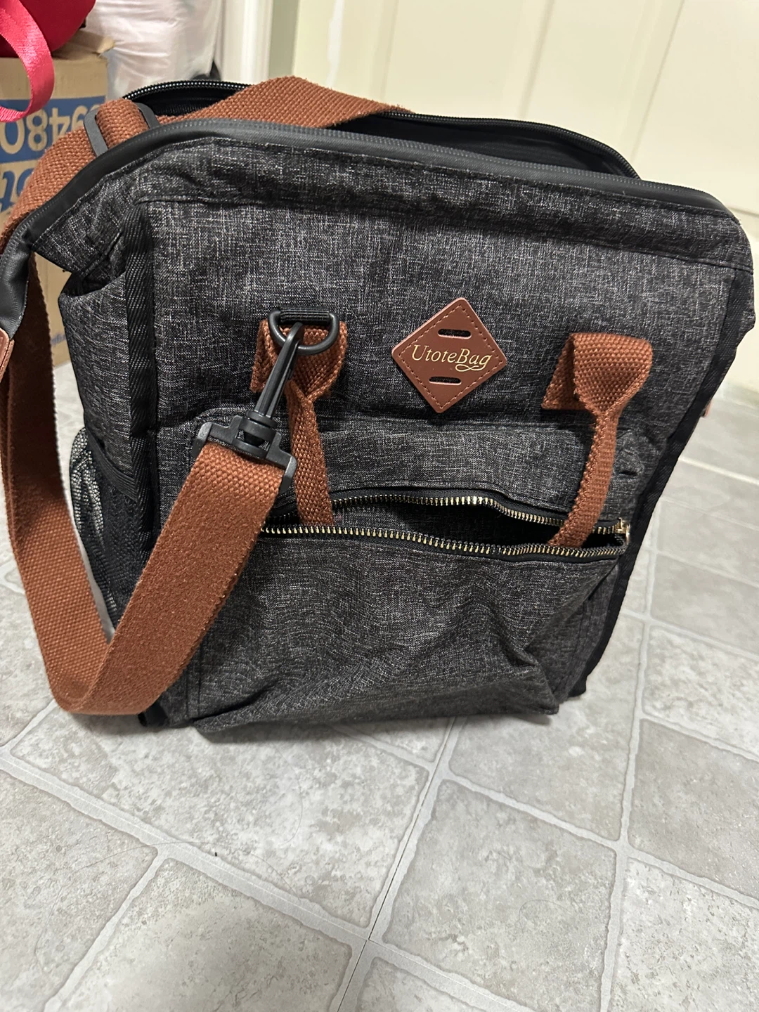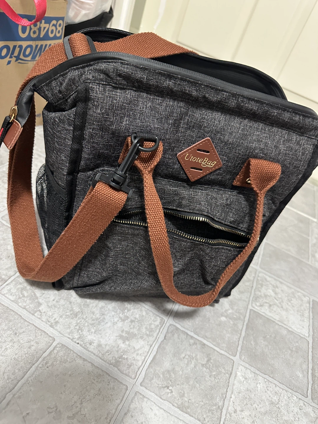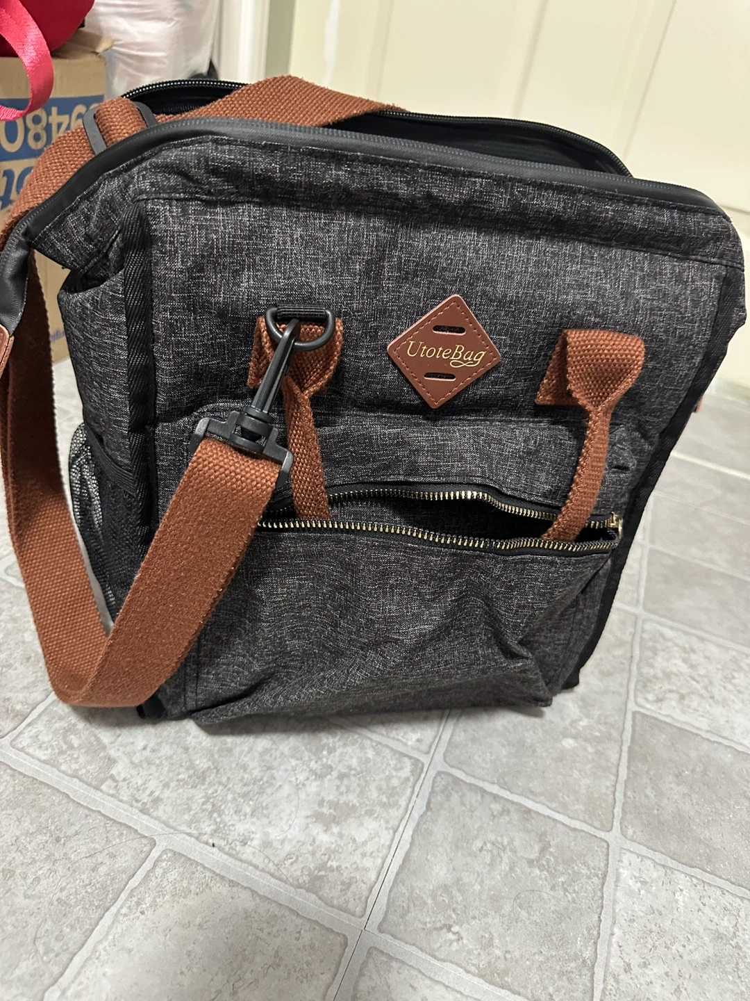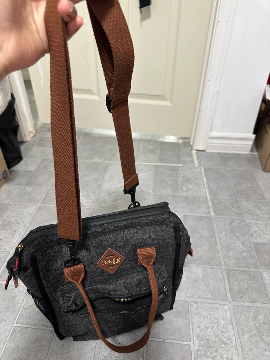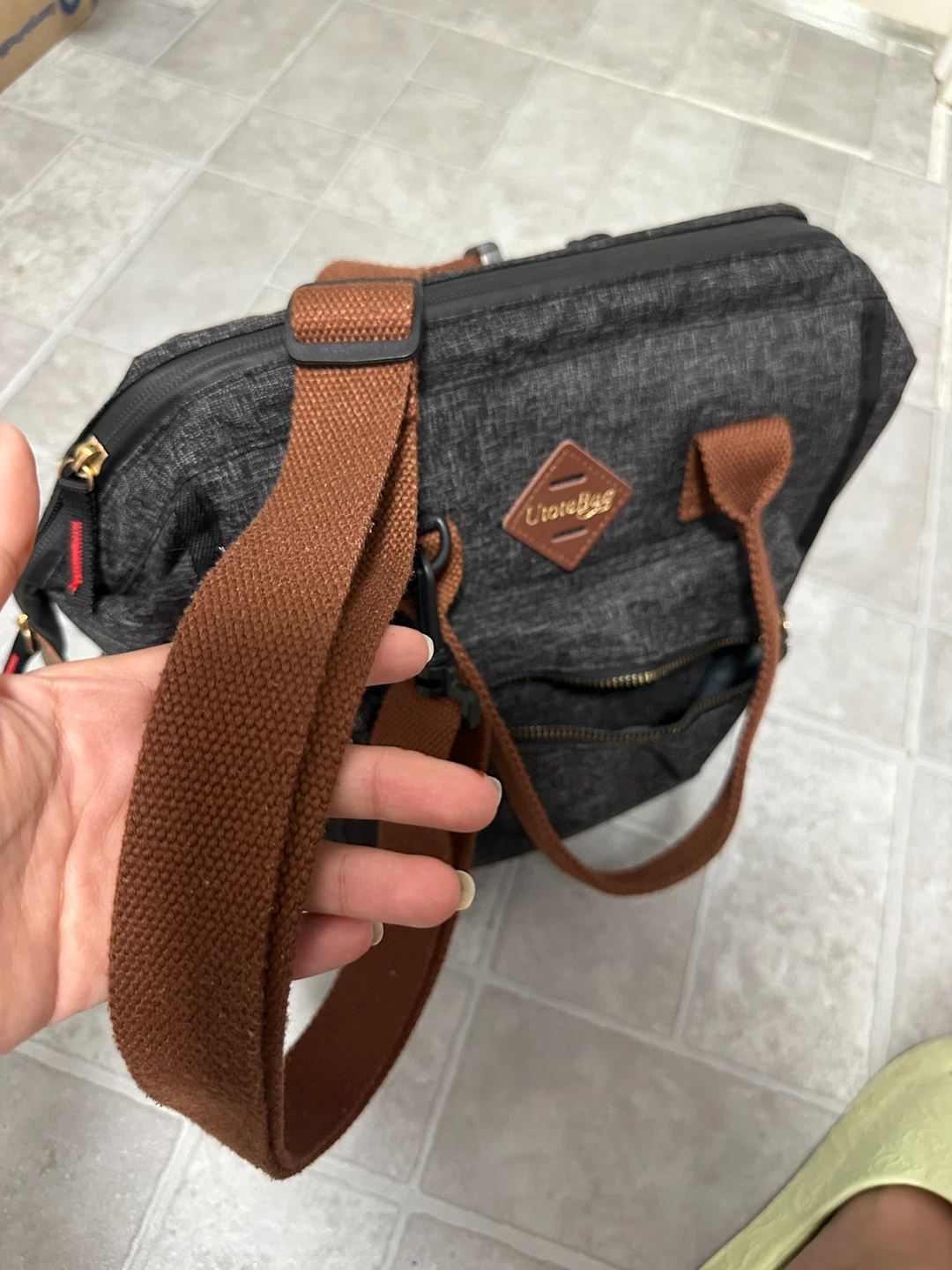 This is a U Tote Bag insulated lunch bag in a stylish grey and brown colour scheme. It's perfect for keeping your lunch cool and fresh, whether you're heading to work or going on a picnic. The bag features a durable construction and an insulated interior to maintain temperature. It also has a convenient shoulder strap for easy carrying.