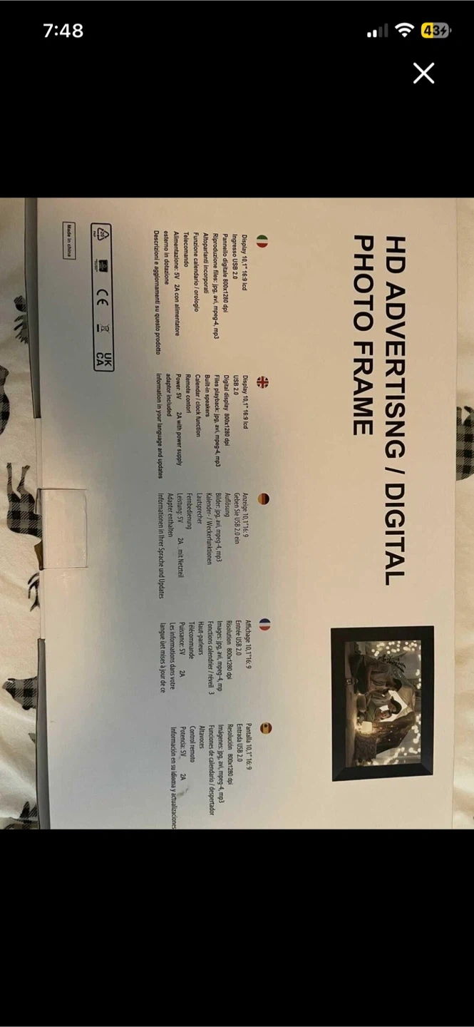 Selling a brand new HD Advertising Digital Photo Frame! It's still in its original box and has never been used. It features video player, MP3 player, calendar, SD & USB, and photo slideshow. Perfect for displaying your favourite memories!