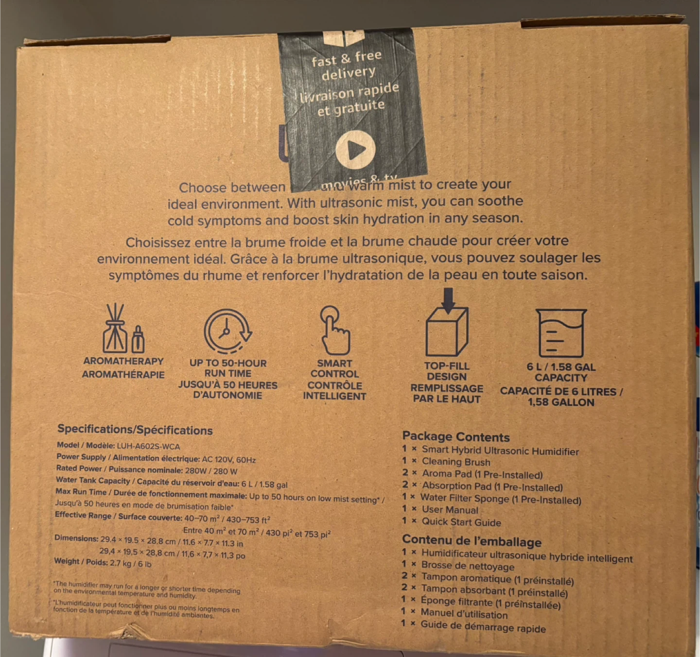 I'm selling a Levoit Smart Hybrid Ultrasonic Humidifier. It has a top-fill design and a 6L/1.58 Gal capacity. It can run for up to 50 hours. It also has smart control and aromatherapy features! Included in the package are:
