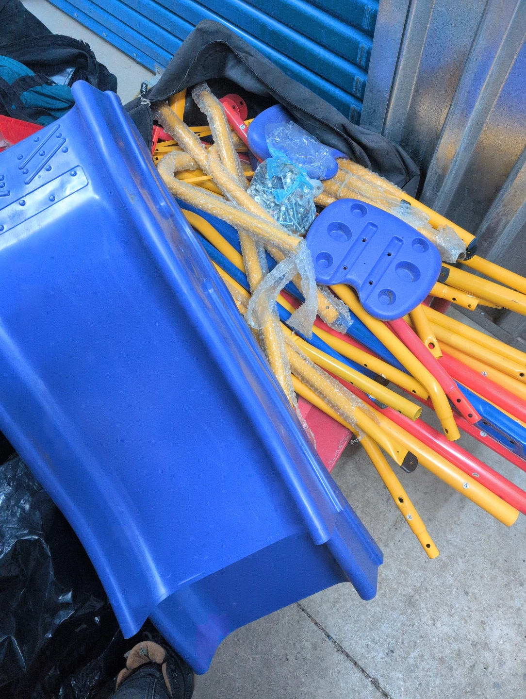 Selling a kids' swing set with a slide! It looks like all the parts are here, including the slide itself, the swing seats, and the frame pieces. Great for some outdoor fun for the little ones!