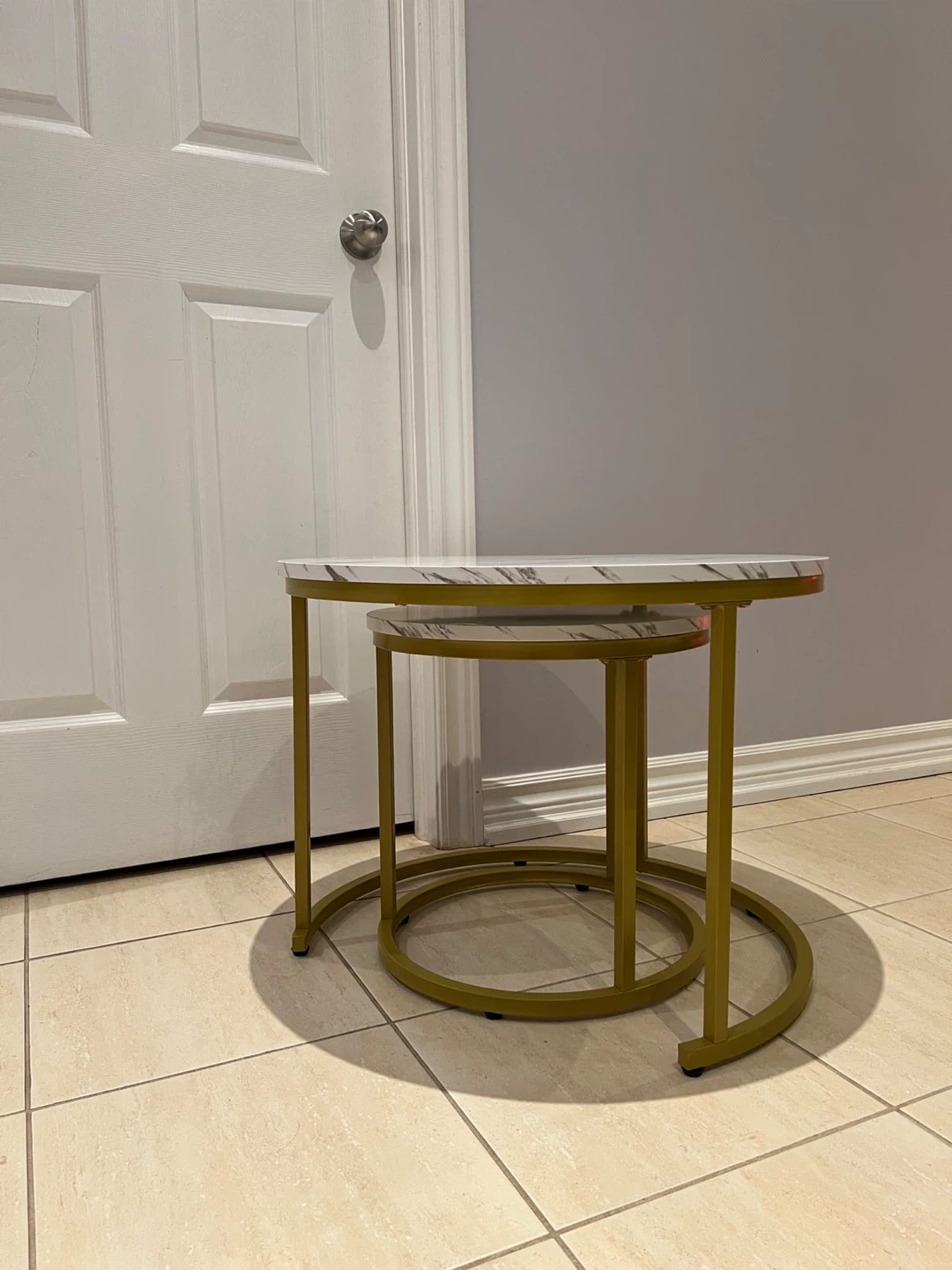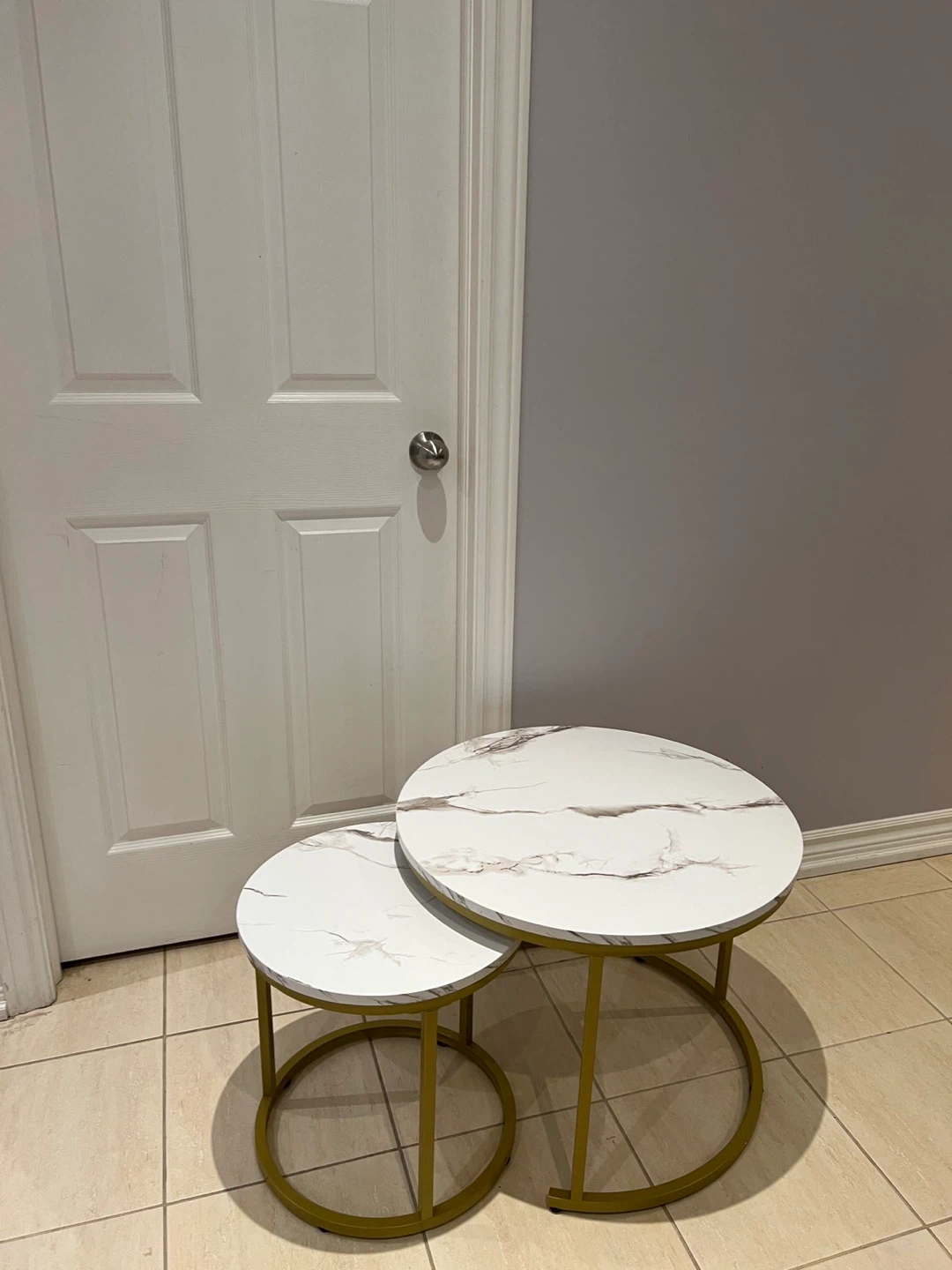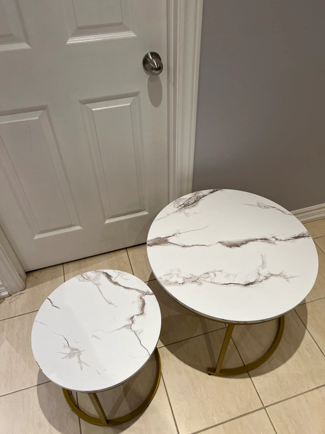 Selling a set of nesting coffee tables. They feature a stylish marble-patterned top and a gold-coloured frame. Perfect for adding a modern touch to your living space!