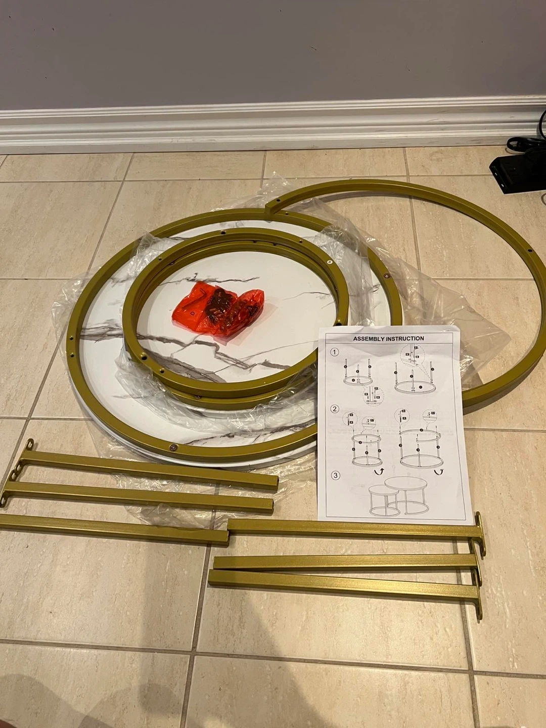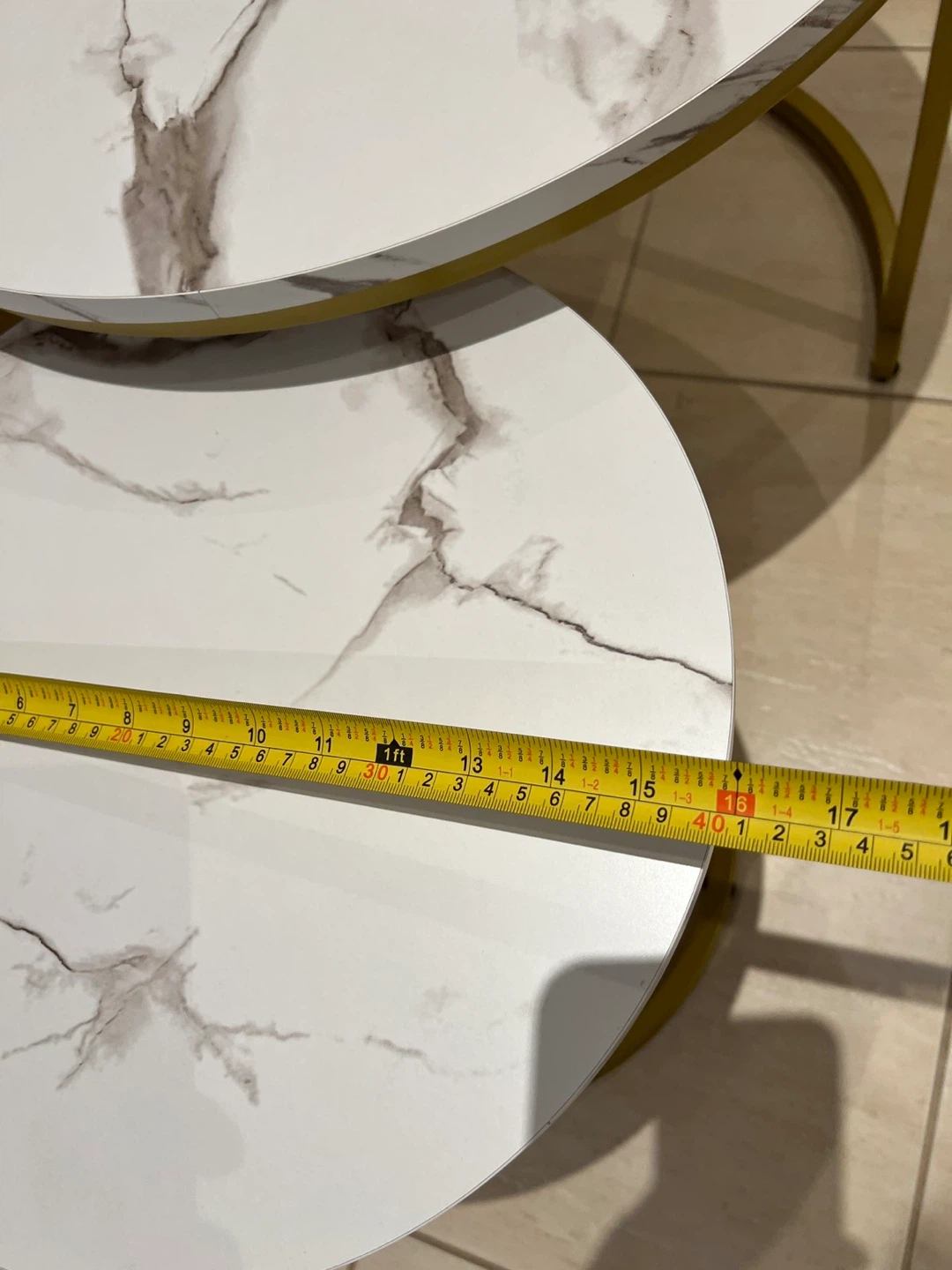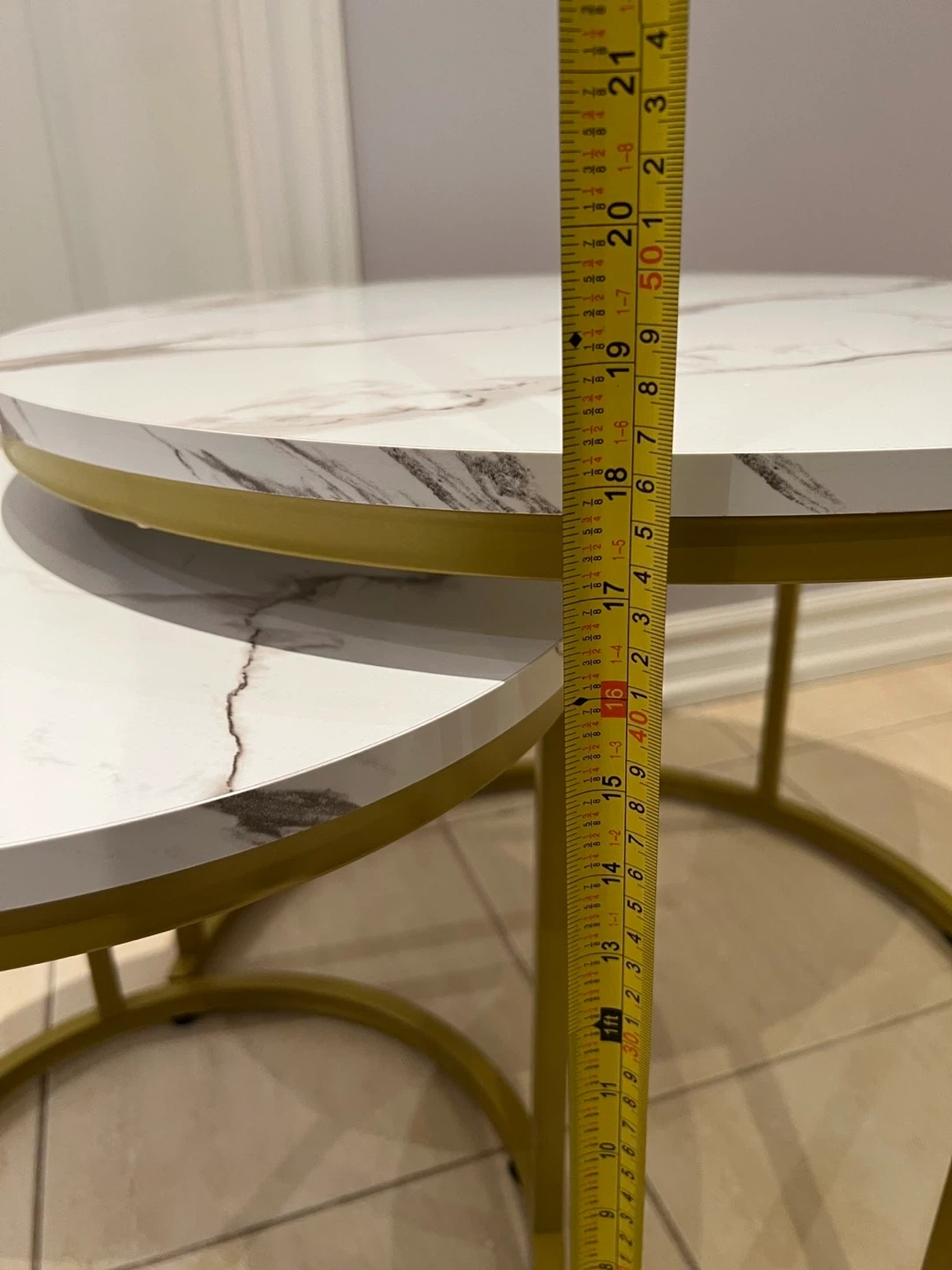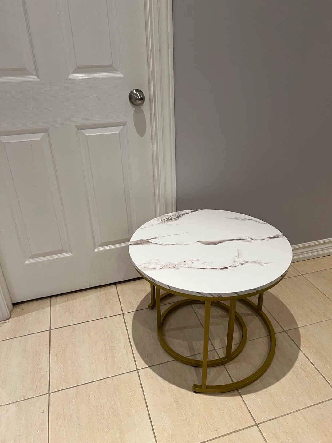 Selling a set of nesting coffee tables. They feature a stylish marble-patterned top and a gold-coloured frame. Perfect for adding a modern touch to your living space!