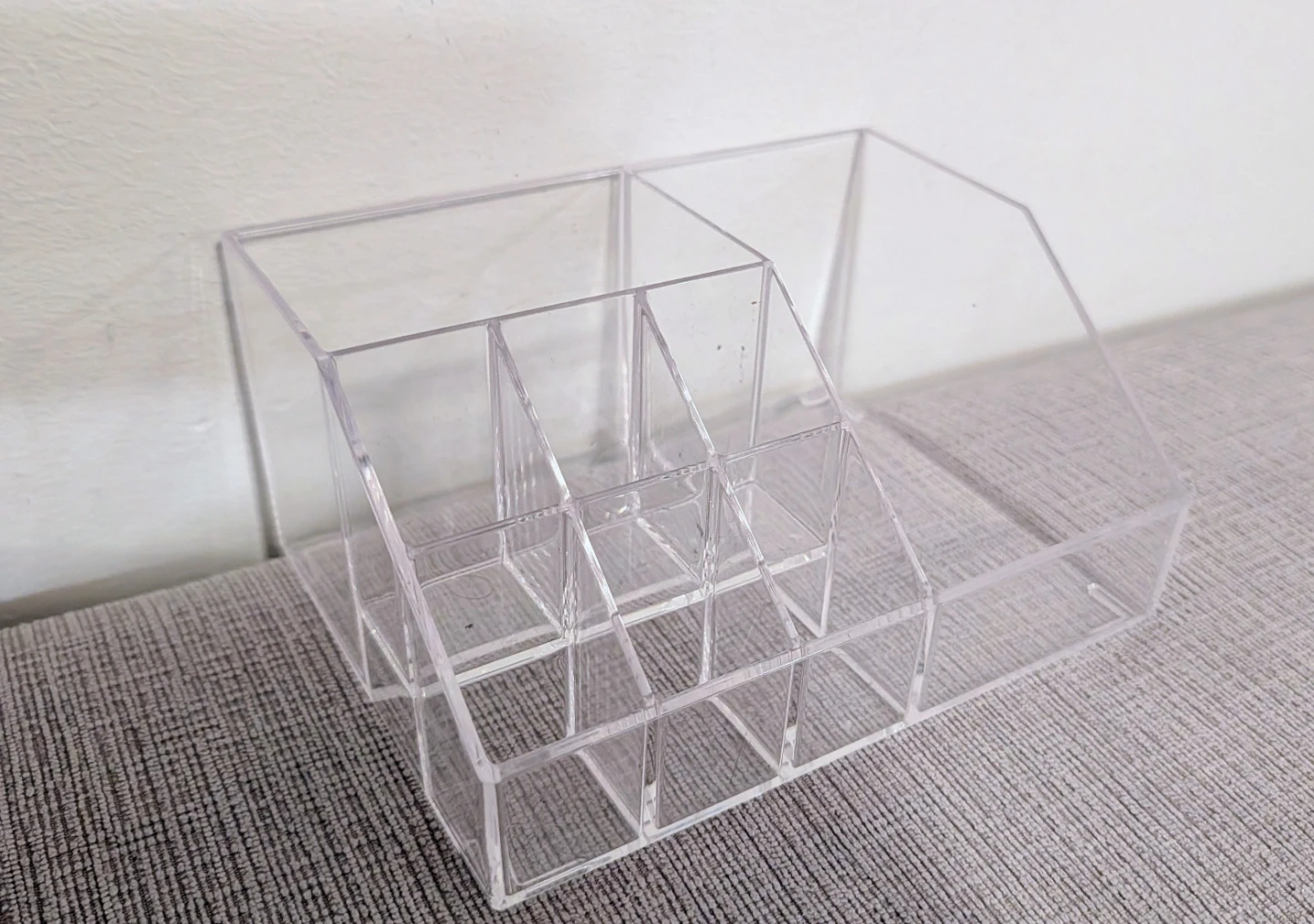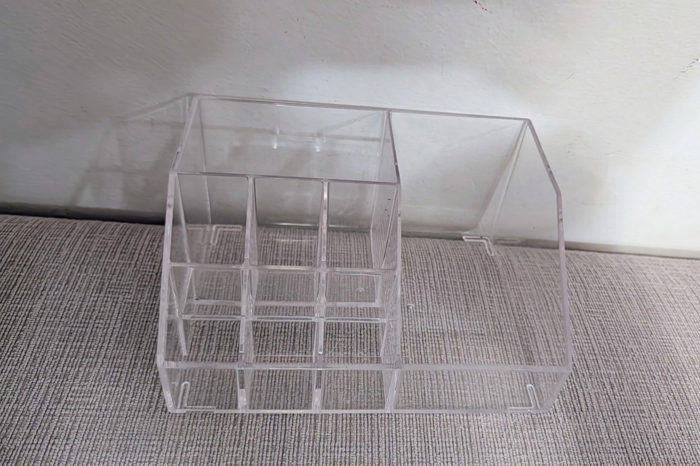 Selling a clear acrylic makeup organizer. It's perfect for keeping all your cosmetics neat and tidy! It has multiple compartments, so you can easily sort your makeup brushes, lipsticks, and other beauty essentials. It's in great condition and ready to use!