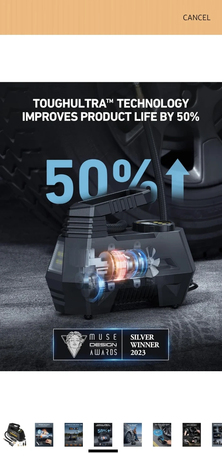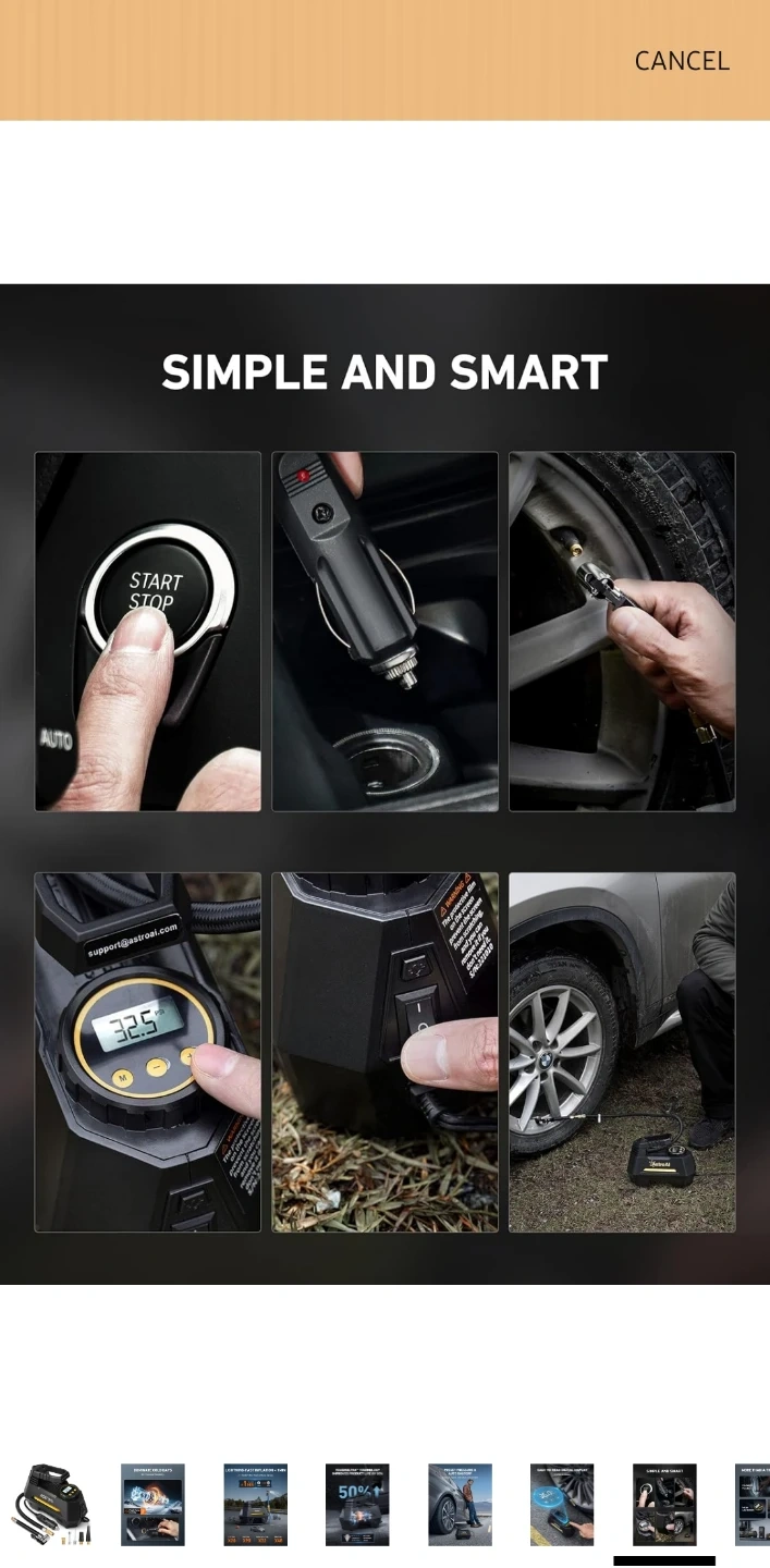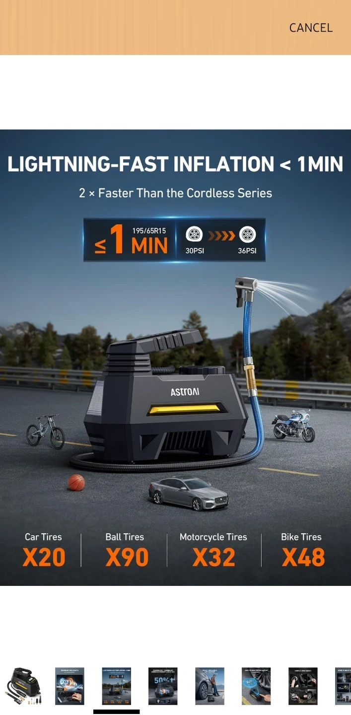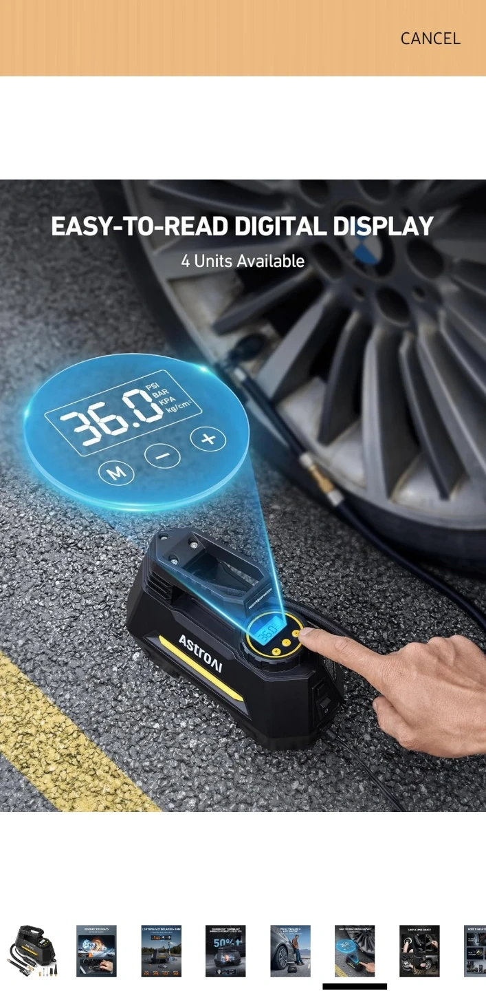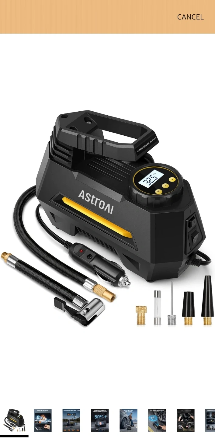 Selling an ASTROAI portable air compressor pump. It features lightning-fast inflation, inflating tires in under 1 minute. It's DC-powered for reliability on cold days and has a preset pressure with auto shutoff for convenience. The ToughUltra technology improves the product life by 50%. It can inflate car tires, ball tires, motorcycle tires, and bike tires.