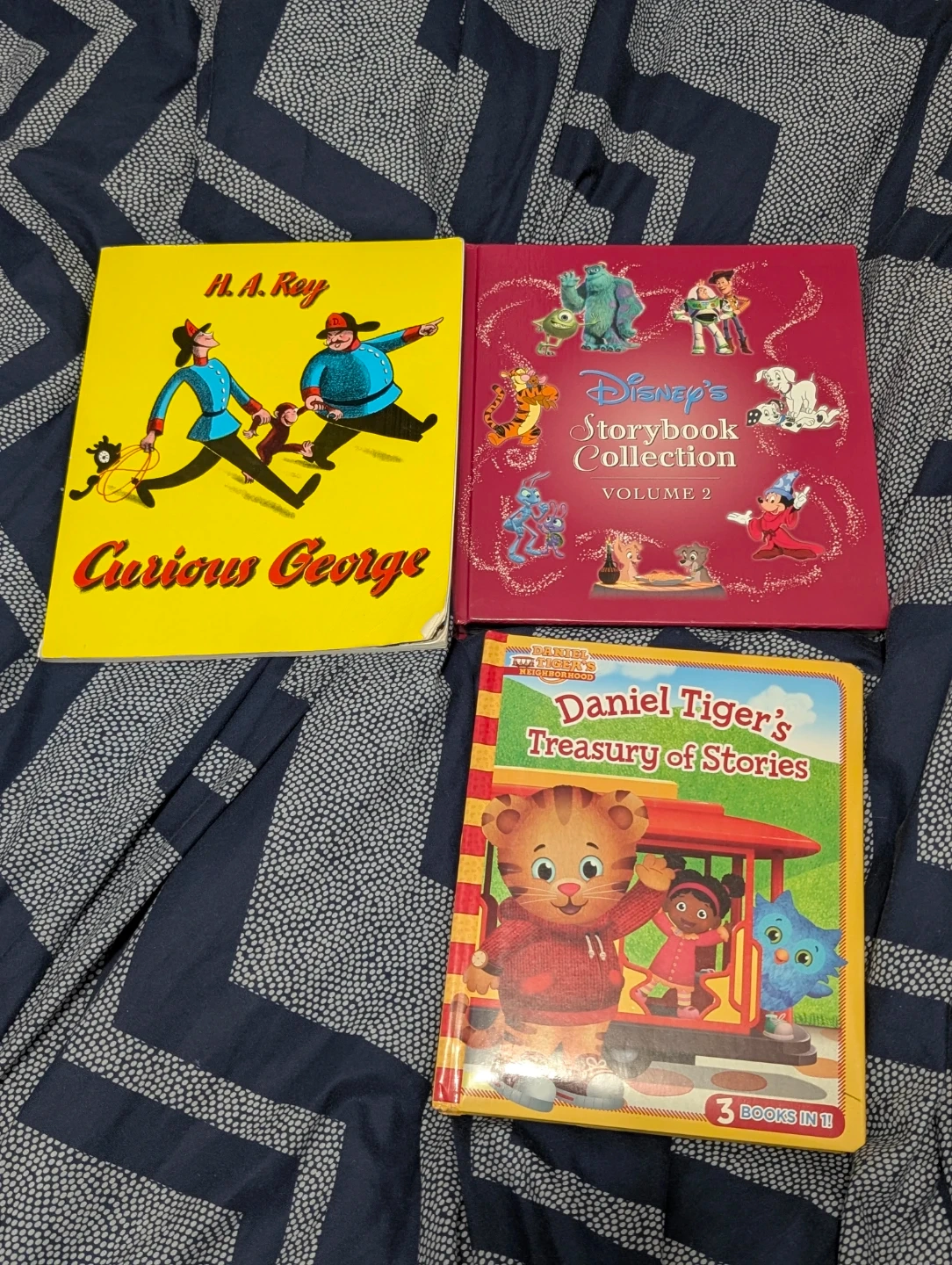 Selling a set of children's books including Curious George by H. A. Rey, Disney's Storybook Collection Volume 2, and Daniel Tiger's Treasury of Stories.