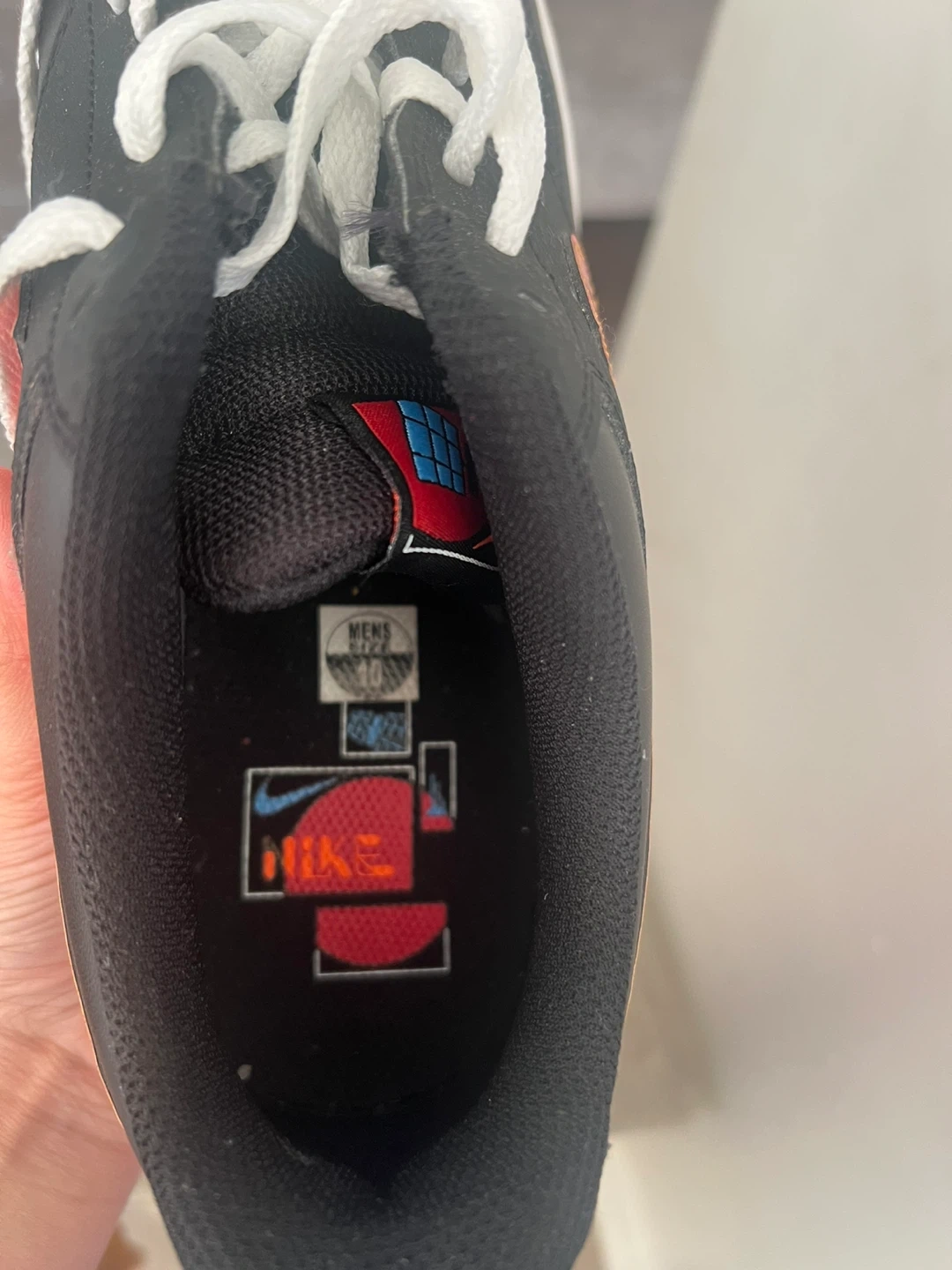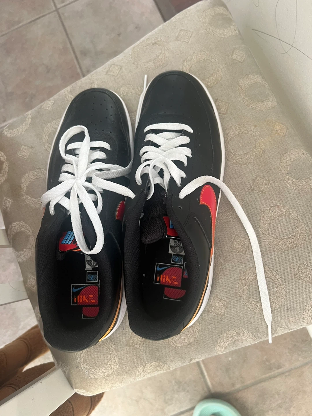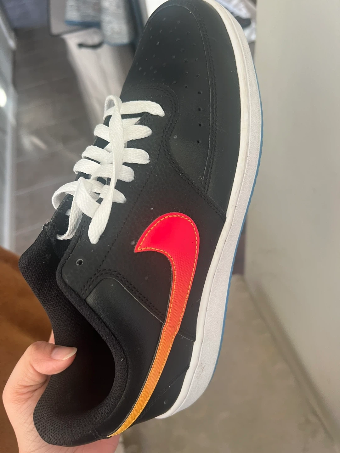 Selling a pair of Nike Court Vision Low Next Nature sneakers in black, size 10. They have a cool red and orange swoosh. Great for everyday wear!