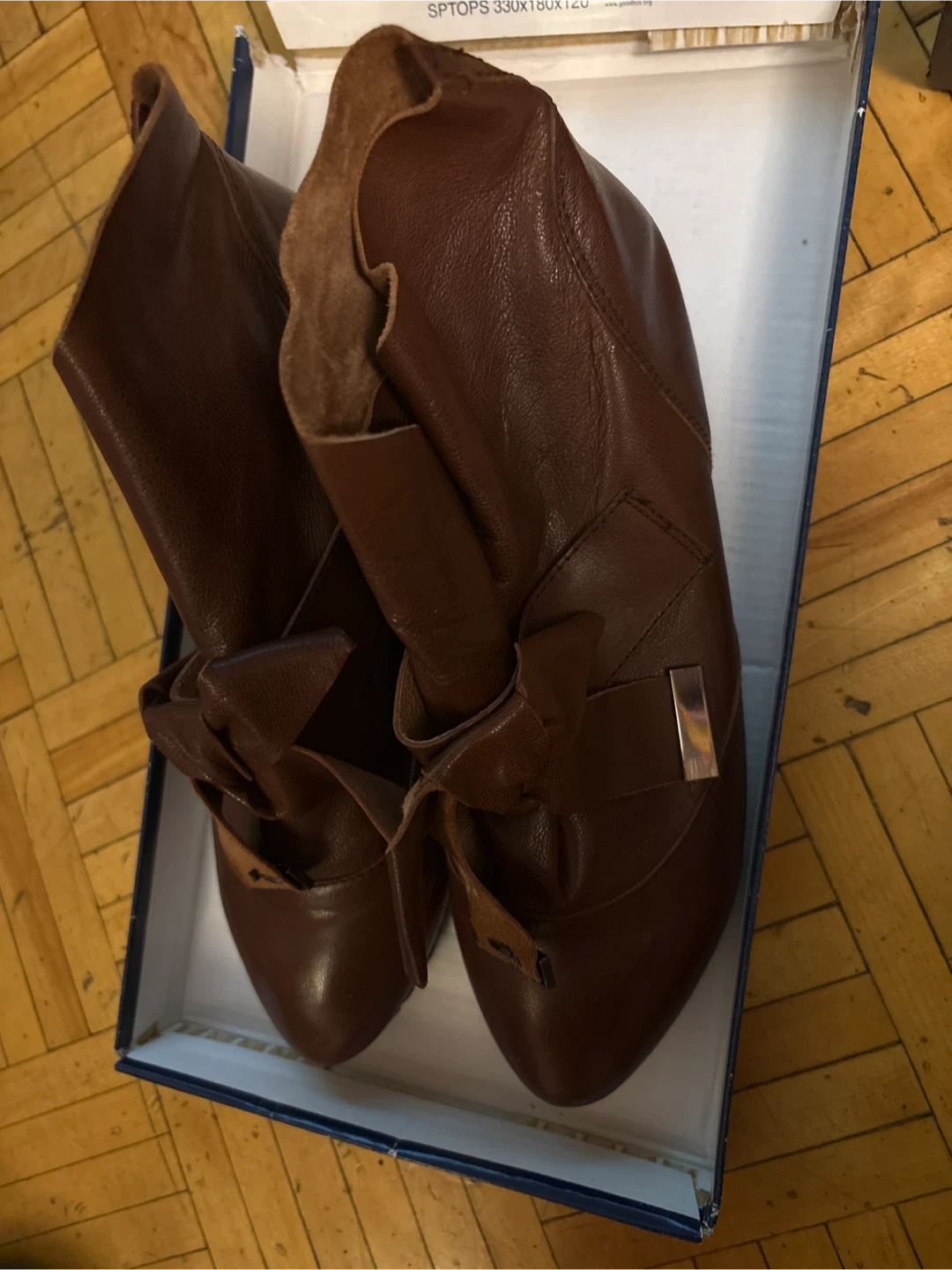 Here are some B & Co brown real leather ankle boots with hidden heel inside. They are pre-owned but still have a lot of life left in them! The boots feature a unique design with a bow detail. As you see the leather.