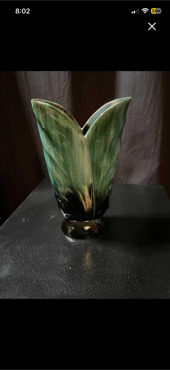 Selling a vintage green vase. It has a unique leaf-like design and a dark green to black gradient. It's in good condition and would look great as a decorative piece in your home