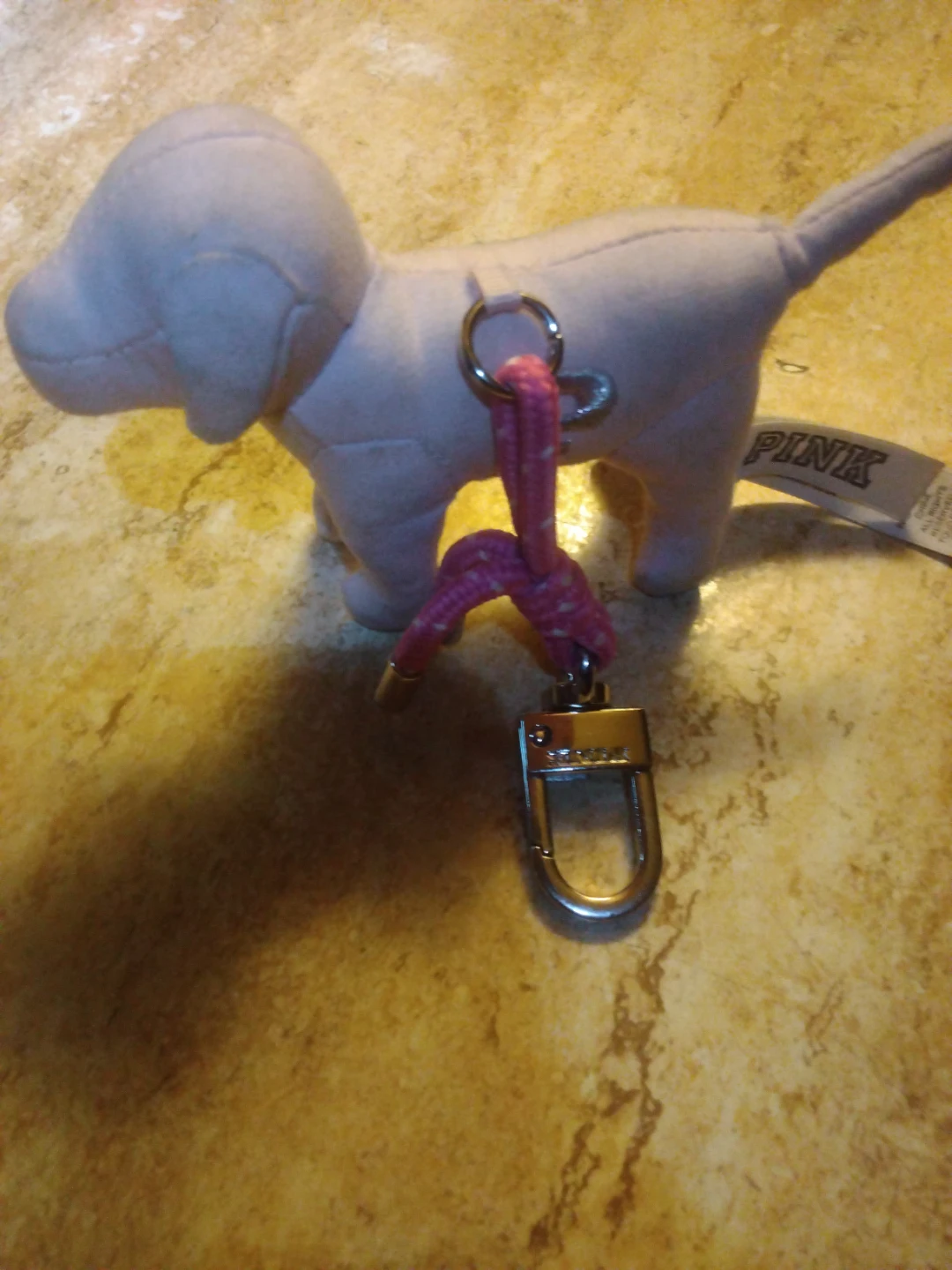 PINK dog keychain! It's in great condition and ready to add some flair to your keys or bag. The keychain features a pink dog design with a metal clasp and decorative rope.