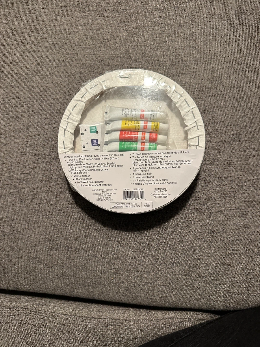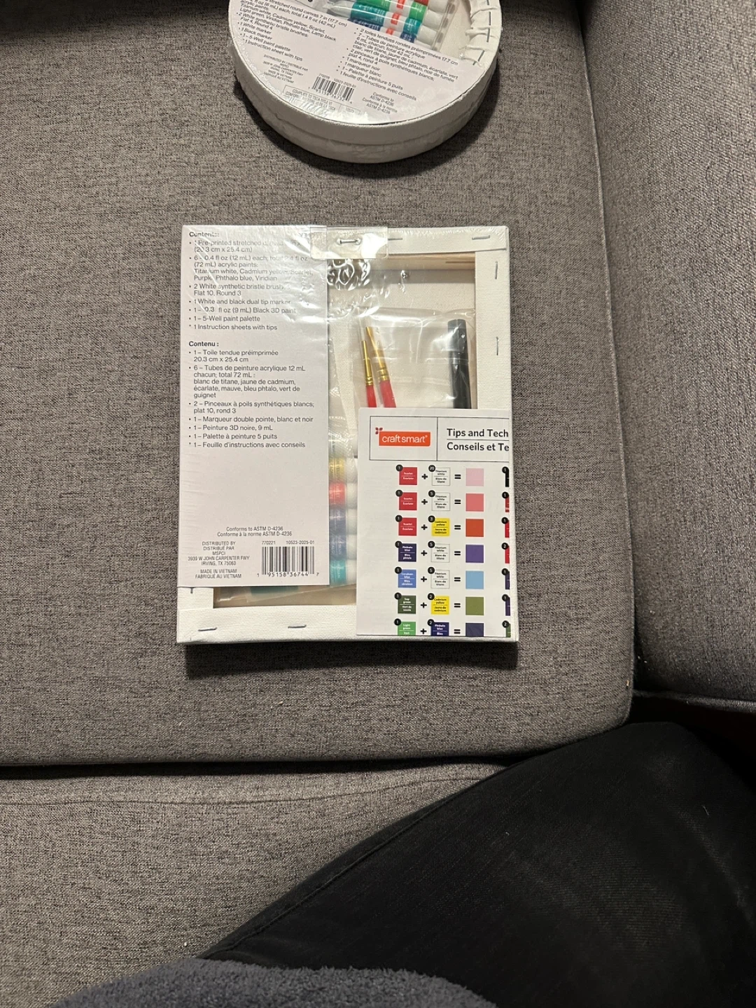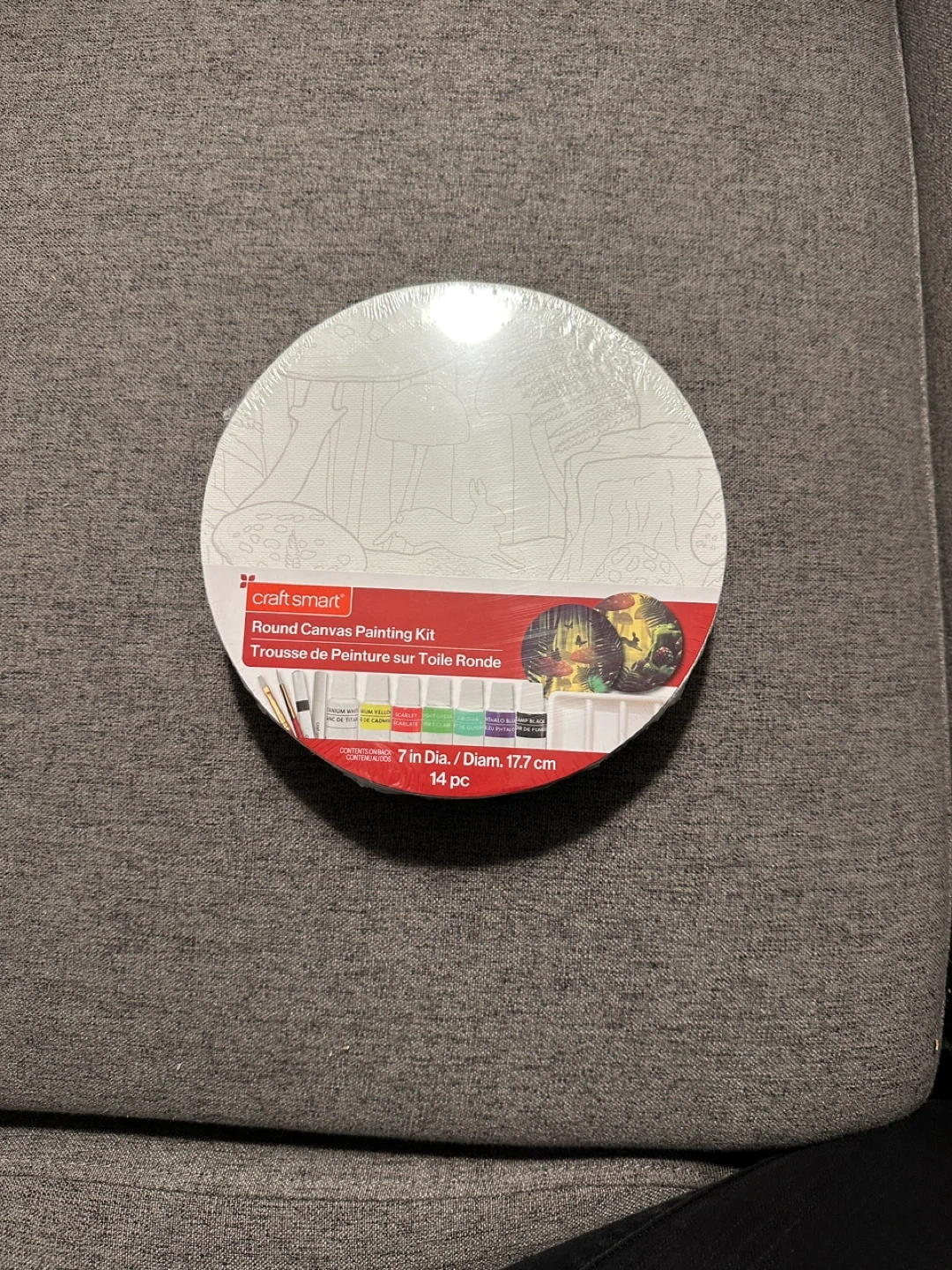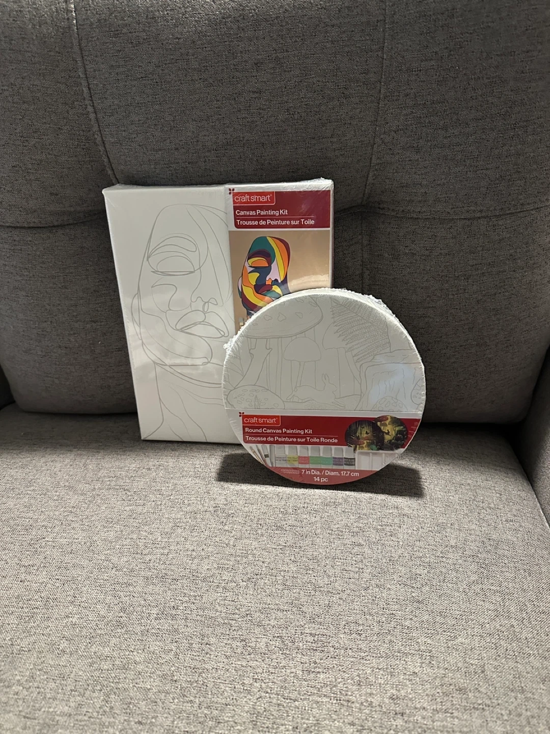 I have two brand new Craft Smart canvas painting kits for sale! One is a round canvas, 7 in diameter, with 14 pieces. The other is an 8x10 in canvas with 12 pieces. Both include pre-printed stretched canvas, acrylic paints, synthetic bristle brushes, a white marker, and a paint palette