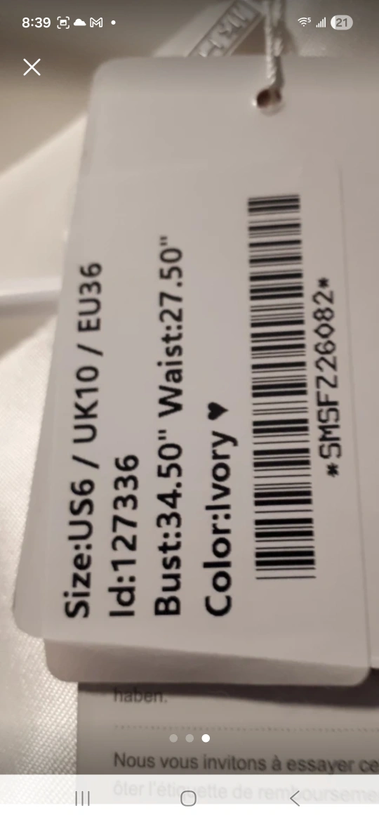 Selling an ivory dress in US size 6, UK size 10, or EU size 36. The bust measures 34.5 inches and the waist is 27.5 inches. It's a beautiful dress!