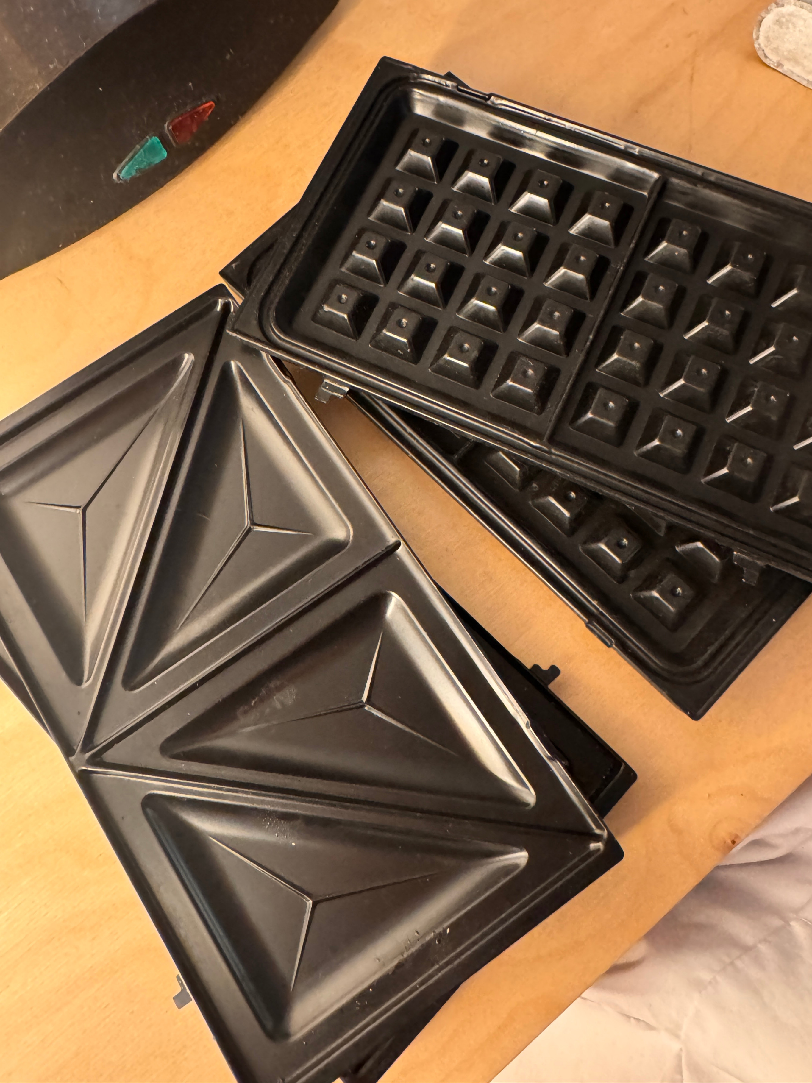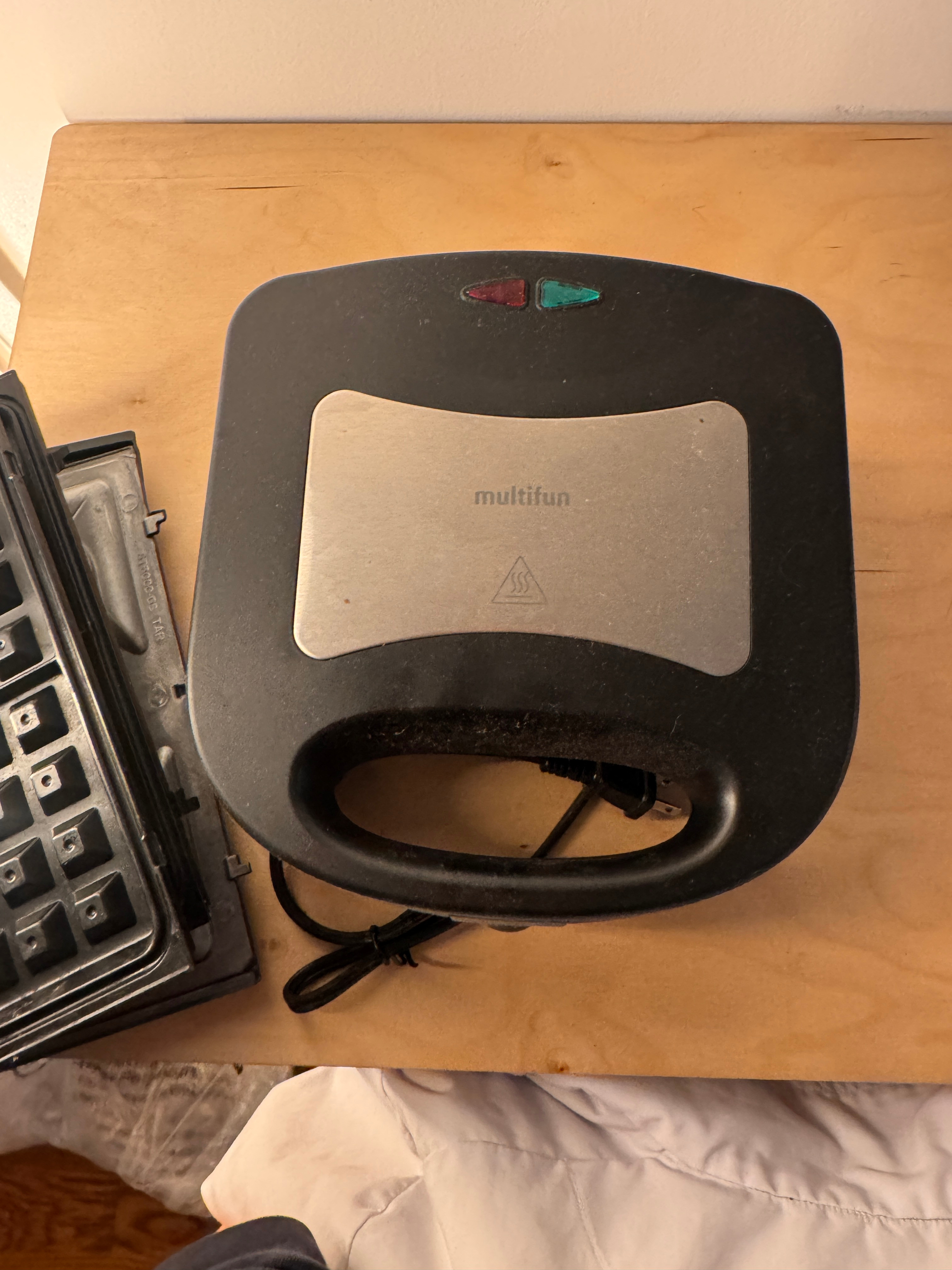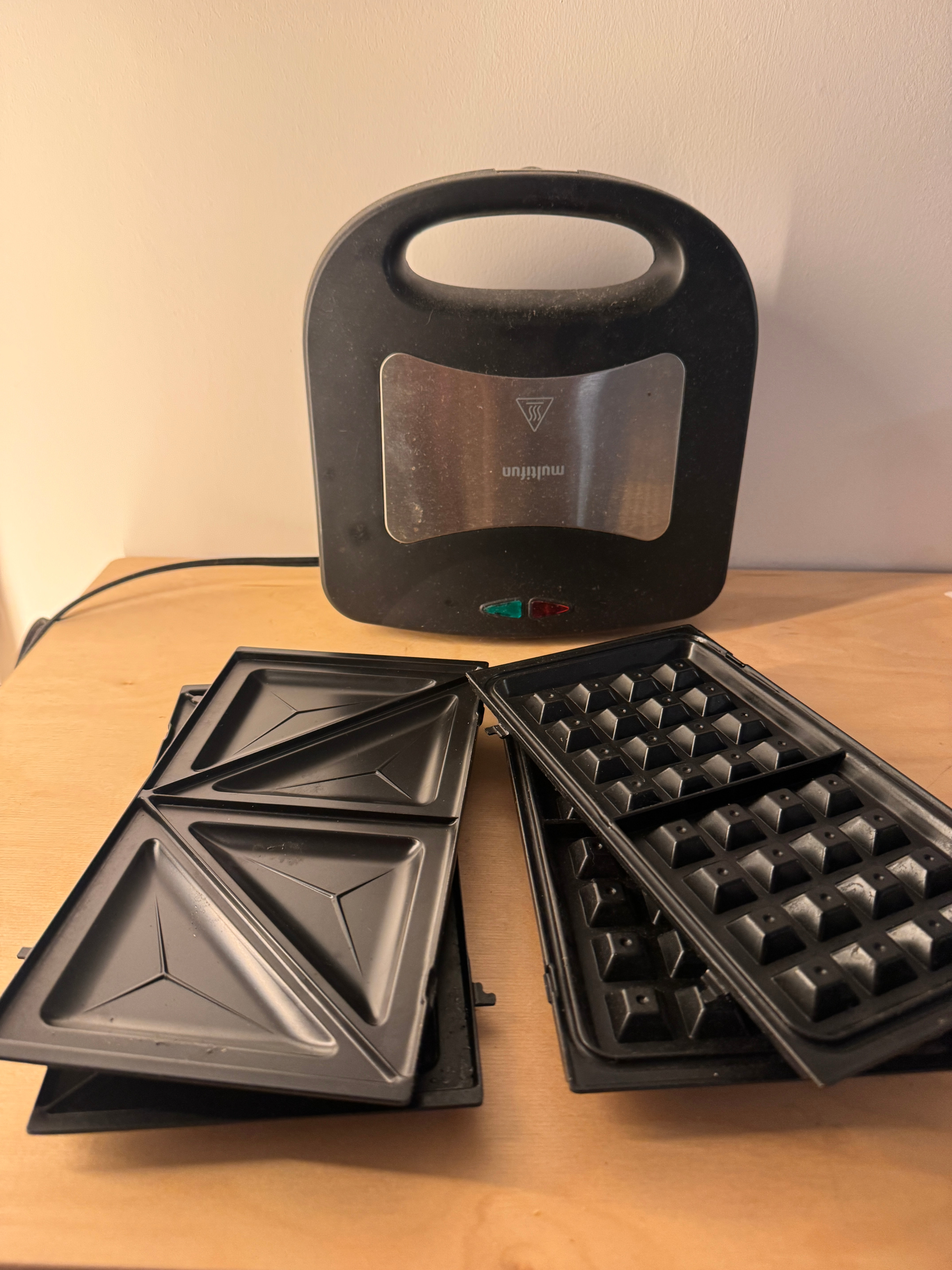 it is a Multifun waffle and sandwich maker. It comes with interchangeable plates for making both waffles and sandwiches.