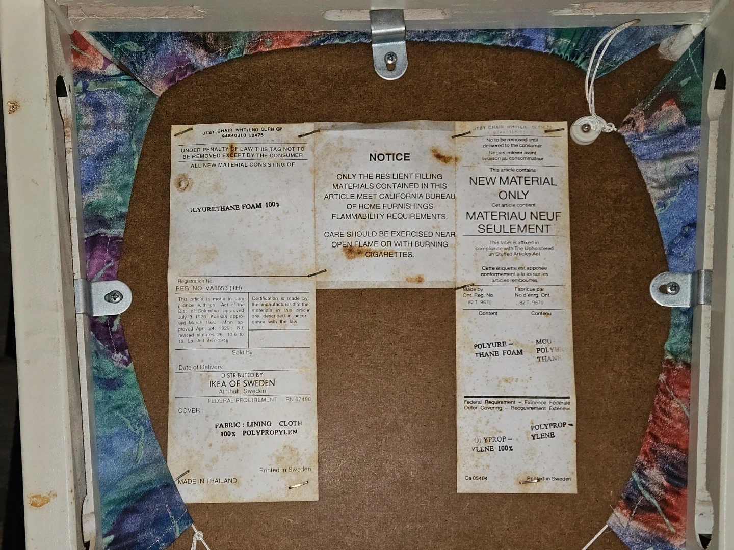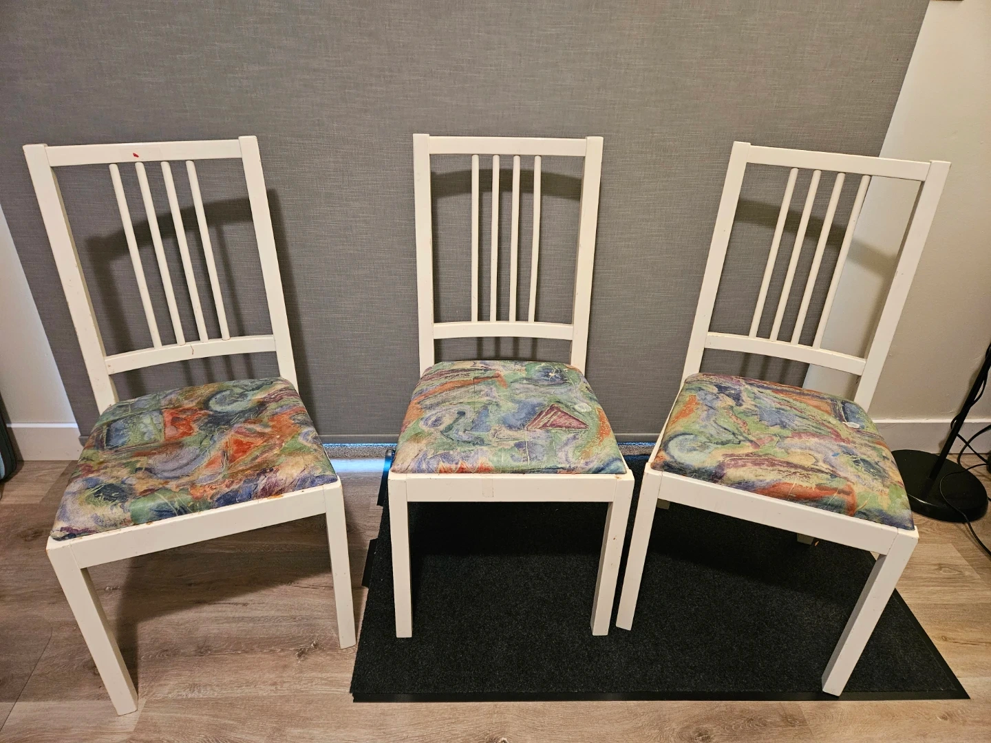 Selling a set of 3 white dining chairs from IKEA of Sweden! The chair has a colourful fabric seat.