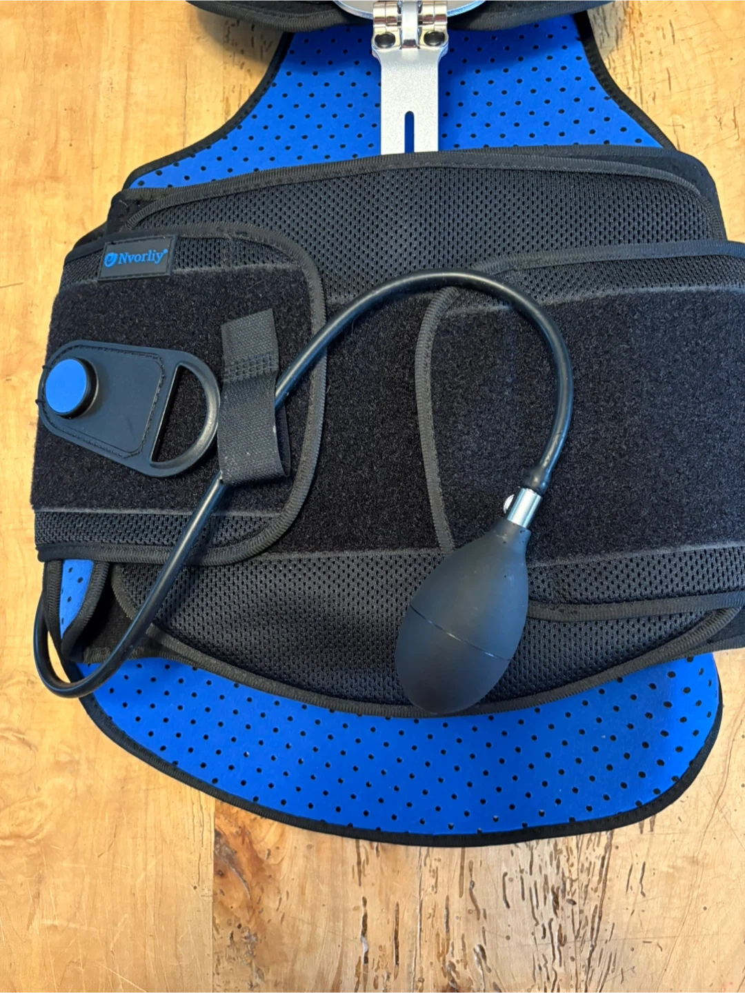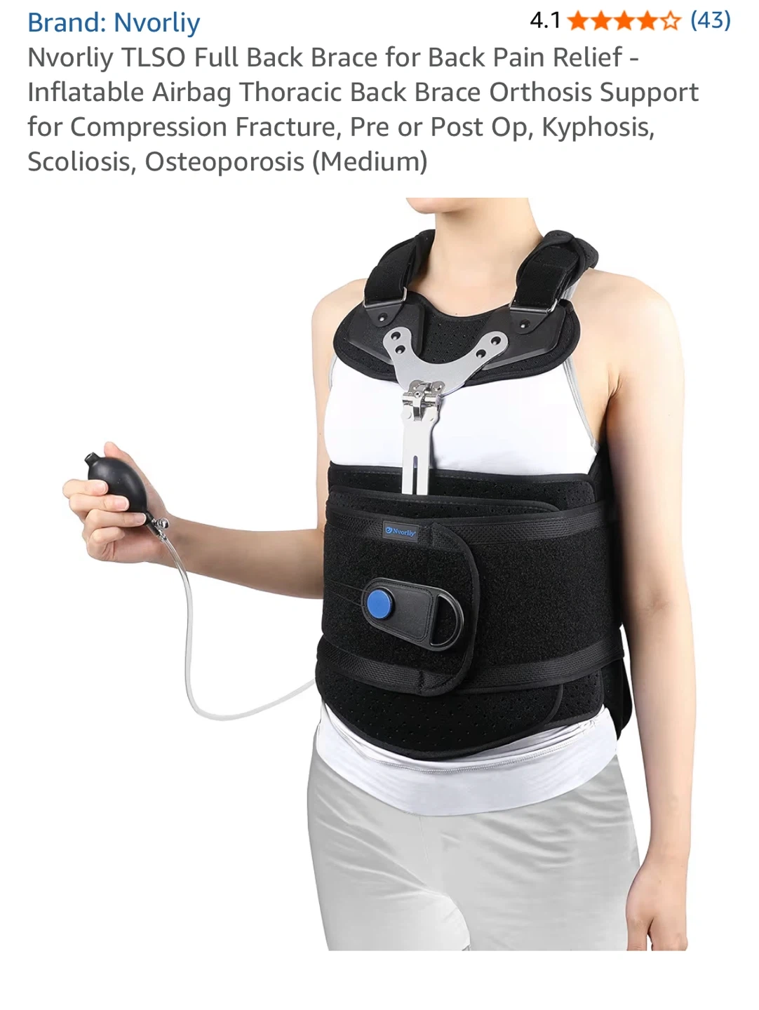 Selling a Nvorliy TLSO Full Back Brace in medium size. It's designed for back pain relief and provides inflatable support. This brace is suitable for various conditions, including scoliosis and osteoporosis.