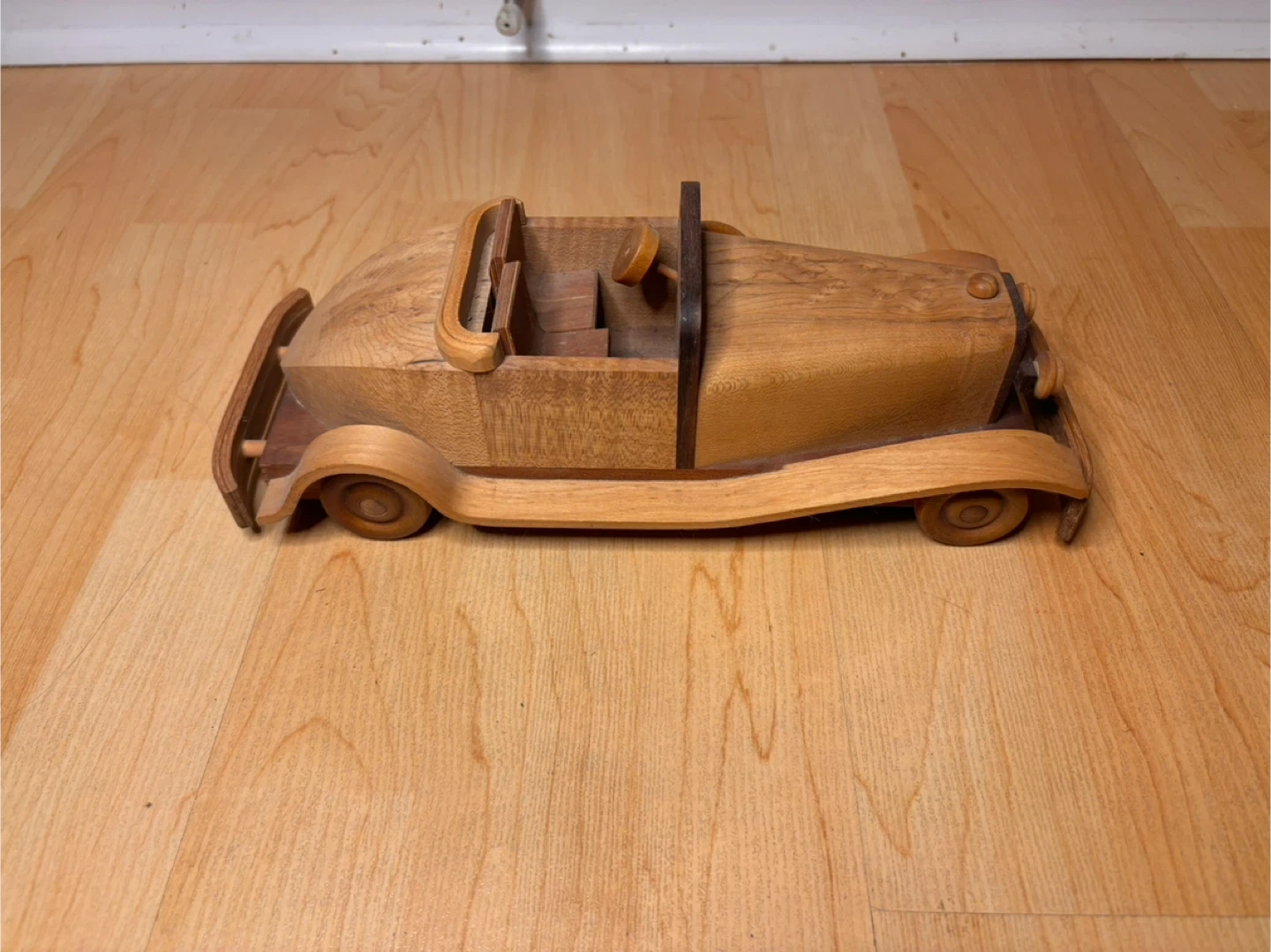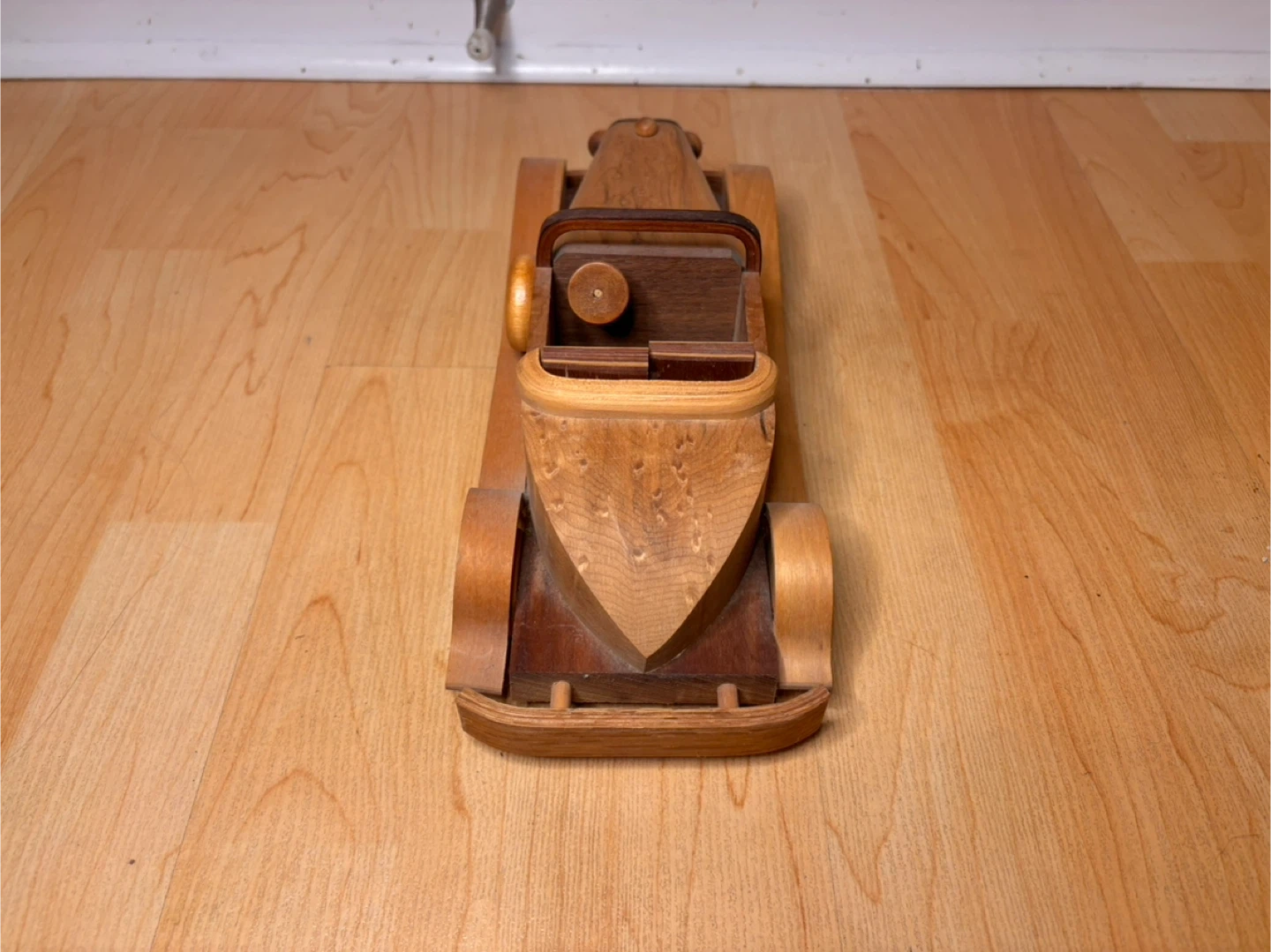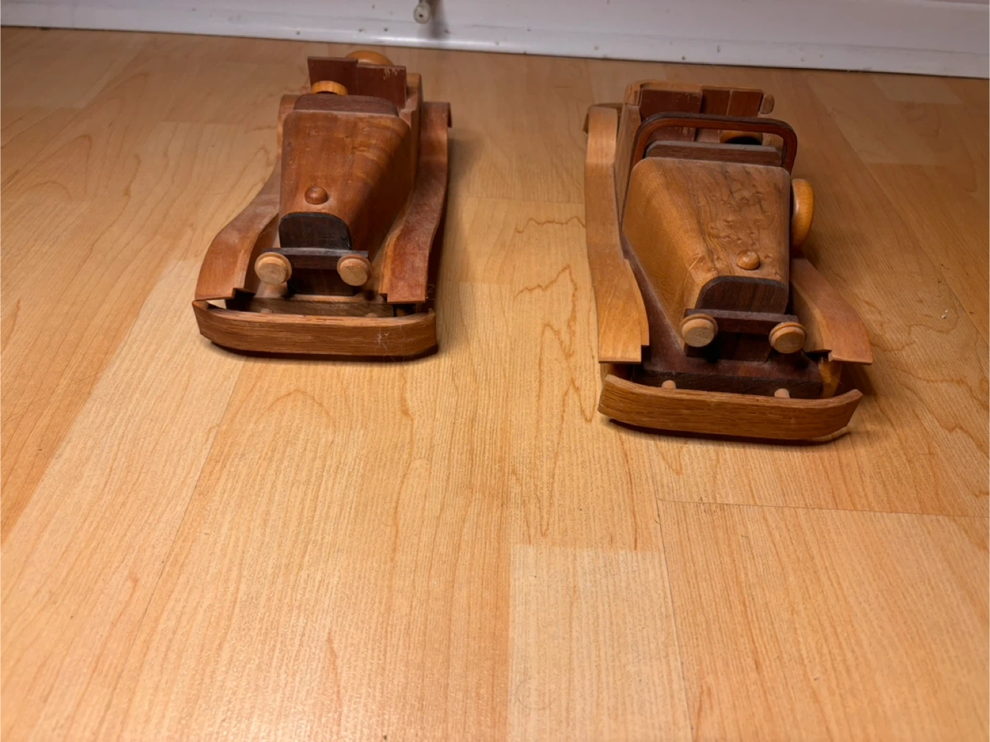 Beautiful hand-crafted wooden model cars inspired by classic early 20th-century automobiles. Made from solid hardwood with layered wood detailing, smooth curved fenders, and turned wooden wheels. These are not mass-produced toys — they are artisan pieces with real weight and craftsmanship.