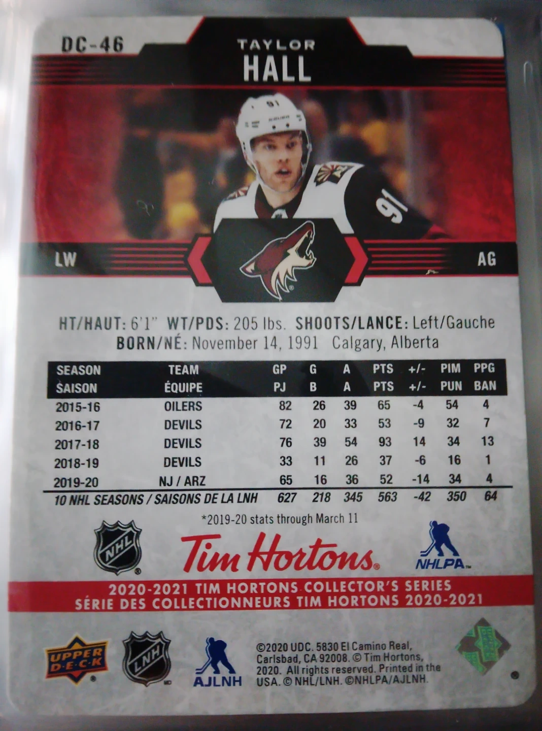Selling a Taylor Hall hockey card from the 2020-2021 Tim Hortons Collector's Series. Card features Taylor Hall in his Coyotes jersey. Great for any hockey card collector!