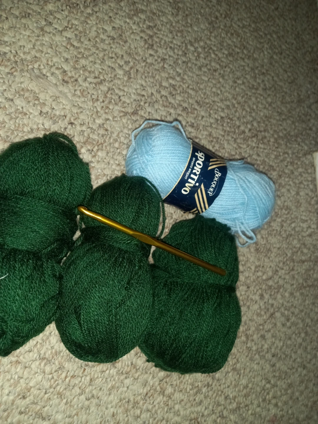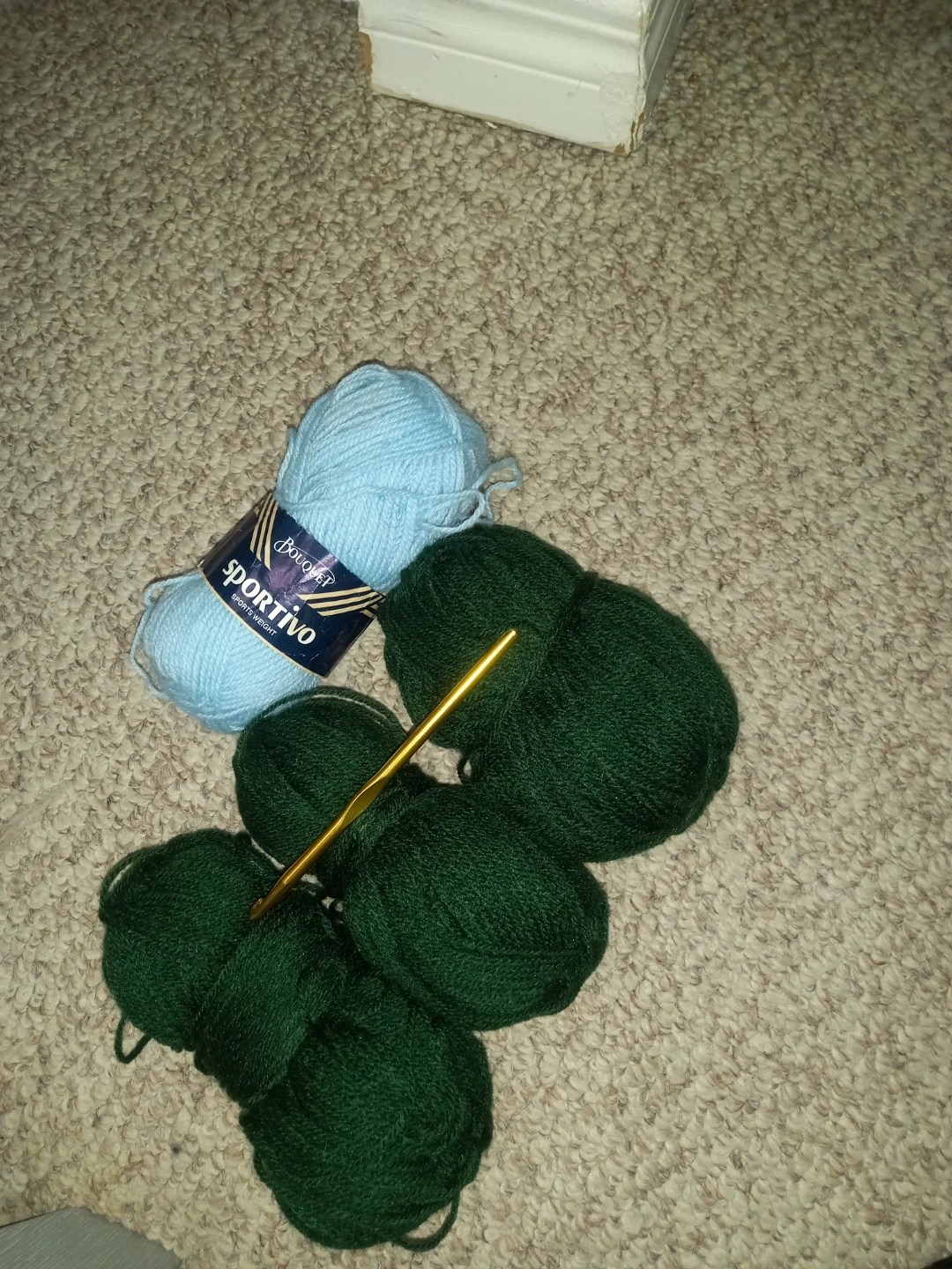 There are several balls of big dark green yarn and one ball of light blue yarn. Also included is a gold-coloured crochet hook. Perfect for your next knitting or crochet project!