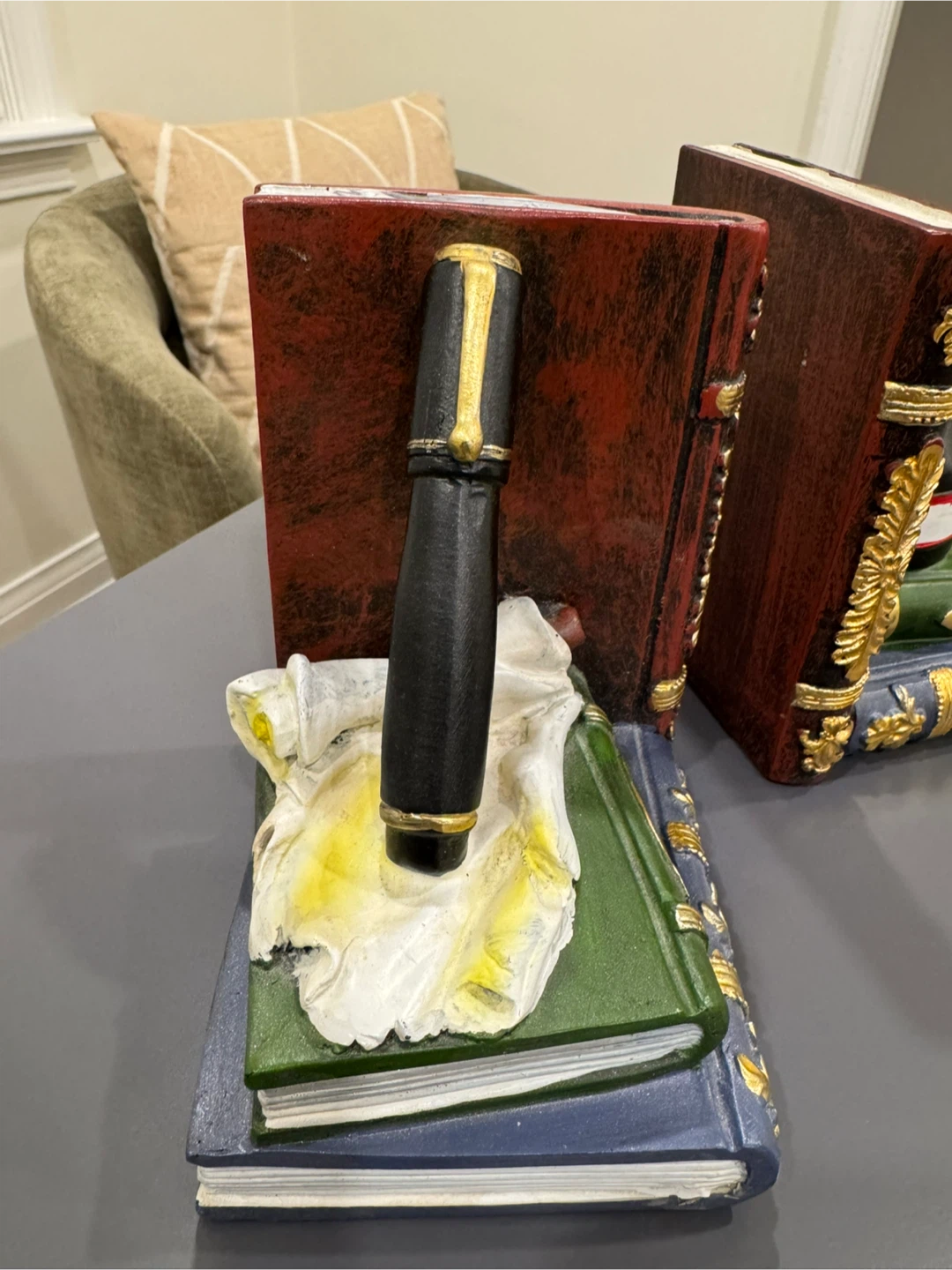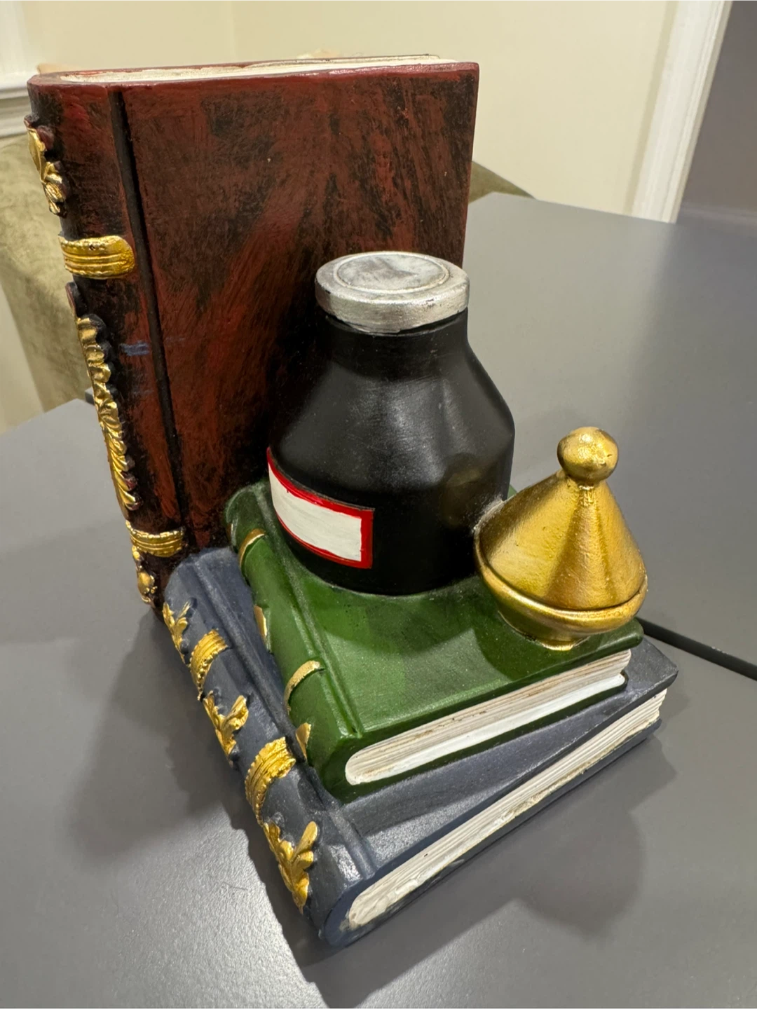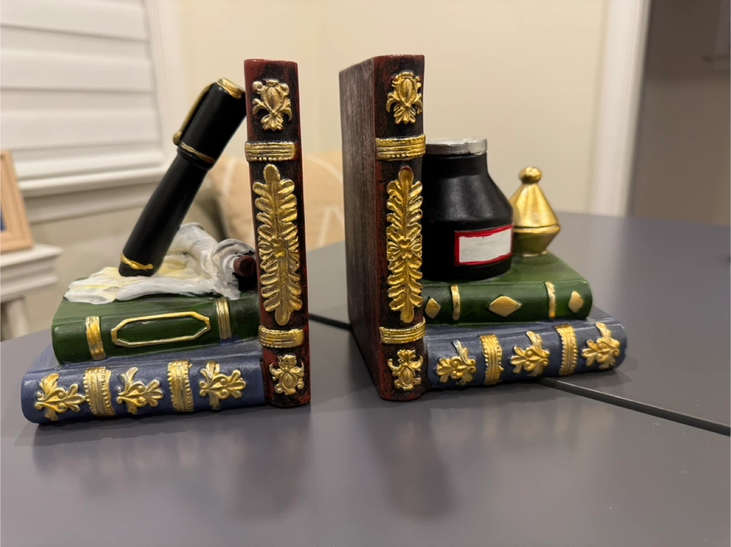 Here's a unique set of decorative bookends! They feature a stack of books, an inkwell, and a quill design. They add a touch of vintage charm to any bookshelf or desk