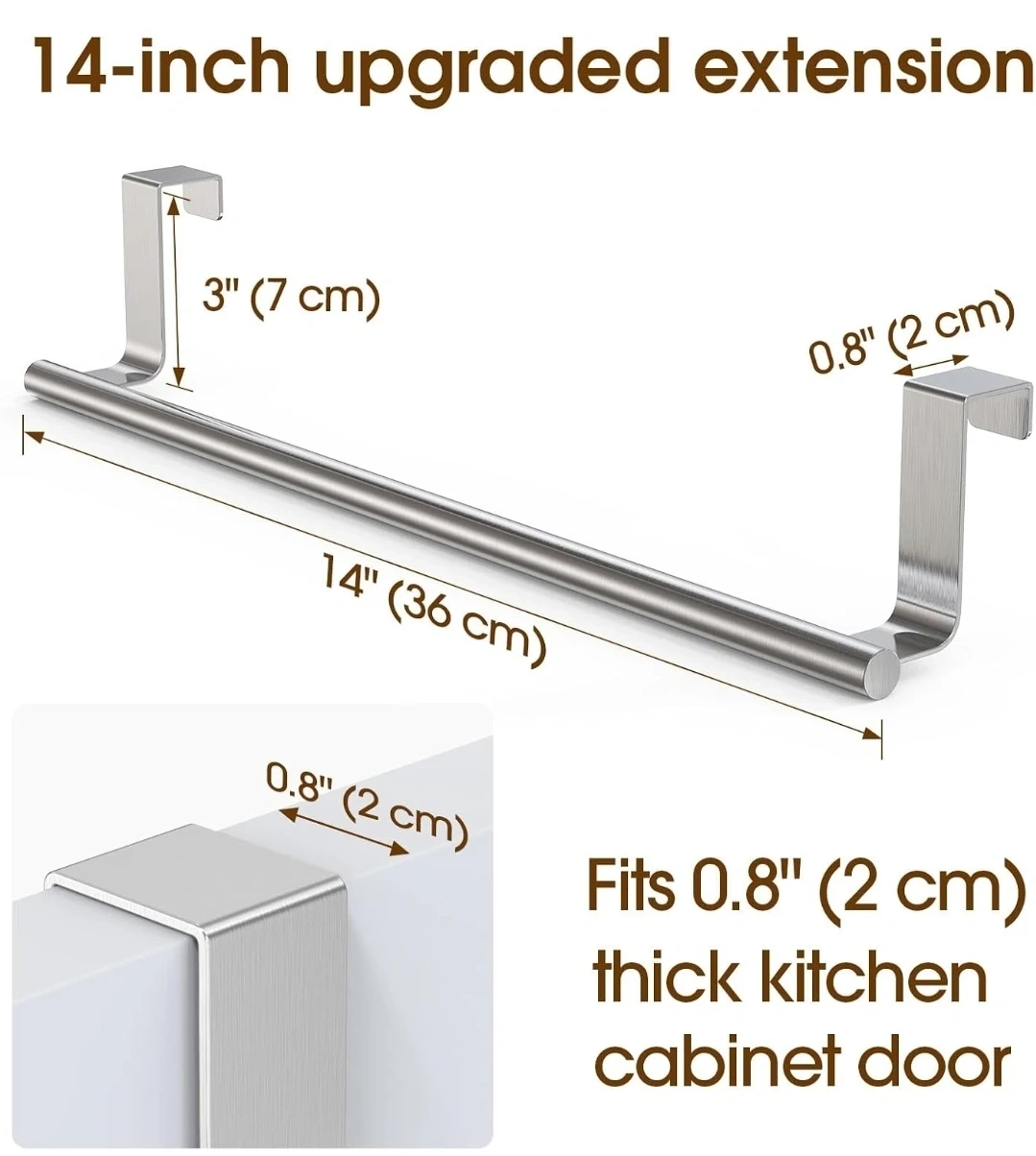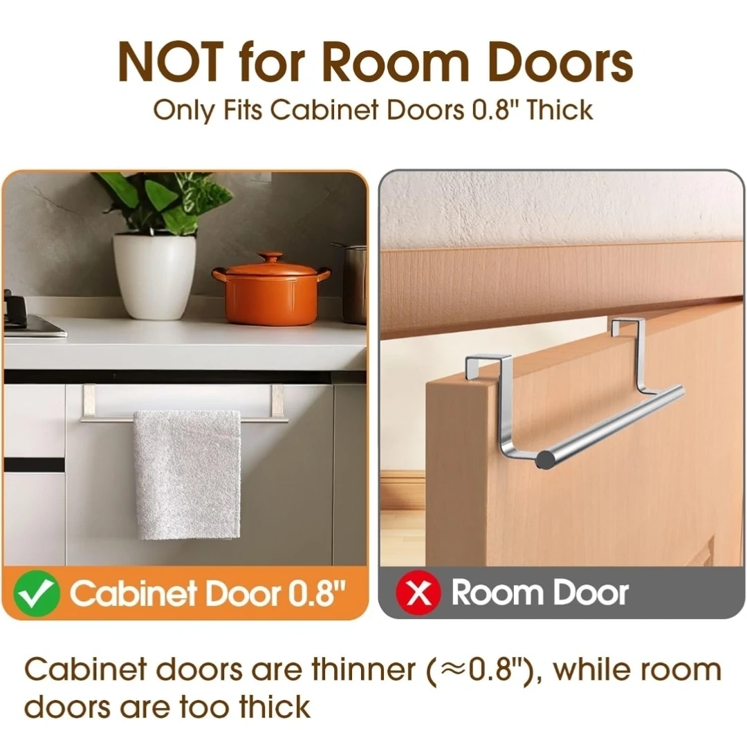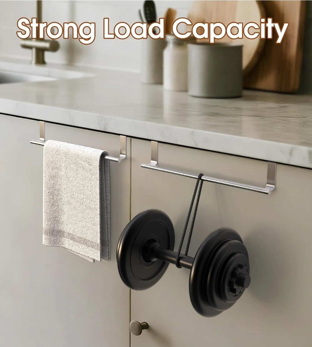 This is a CHAUNCEY HOME over-cabinet door towel rack. It's a 14-inch extra-wide stainless steel bar, perfect for kitchen and bathroom cabinets. It fits cabinet/wardrobe doors up to 0.8 inches thick. It's designed to hang towels freely and made with a one-piece top for seamless molding.