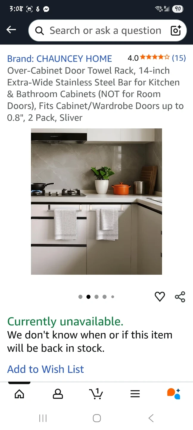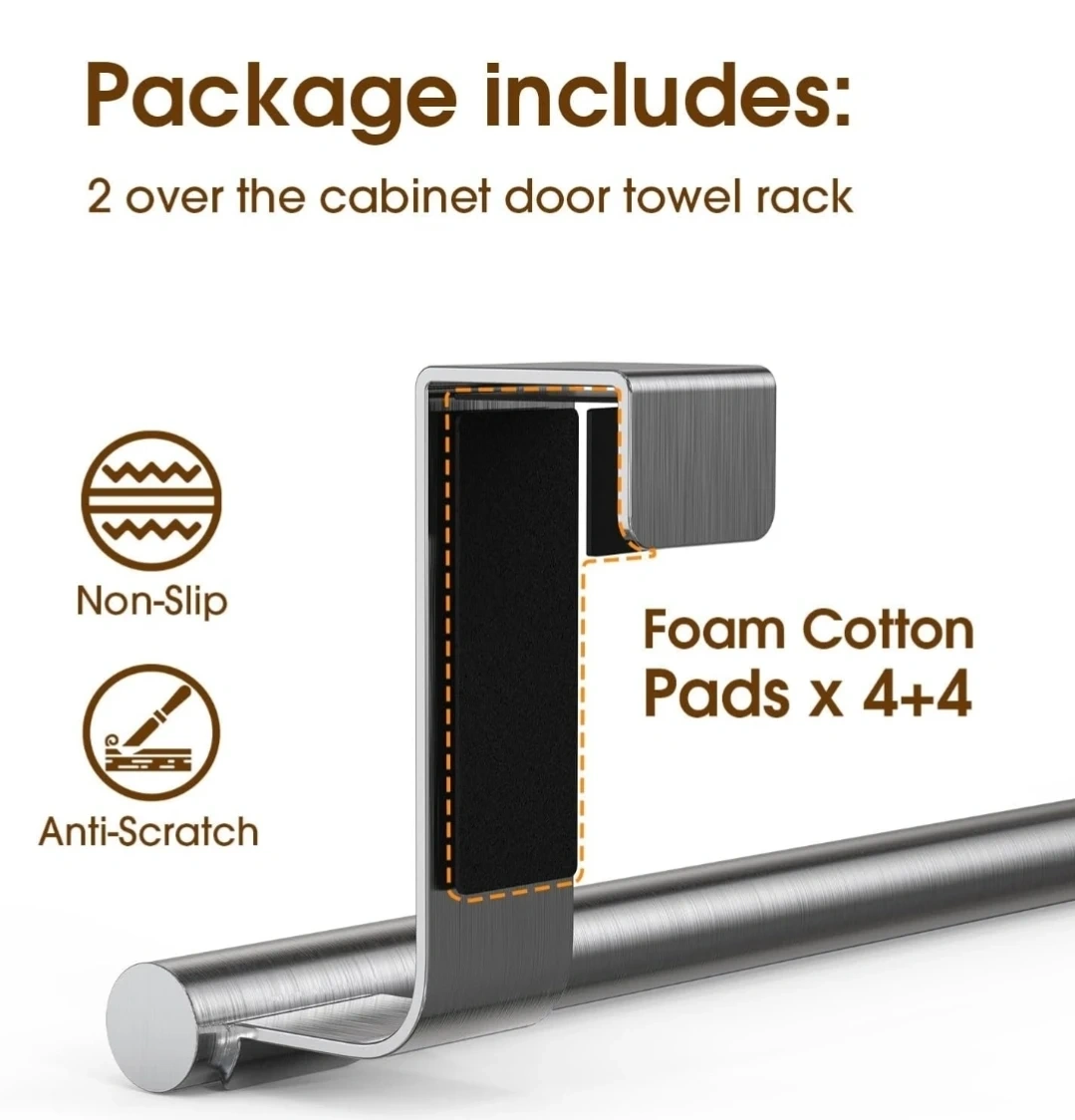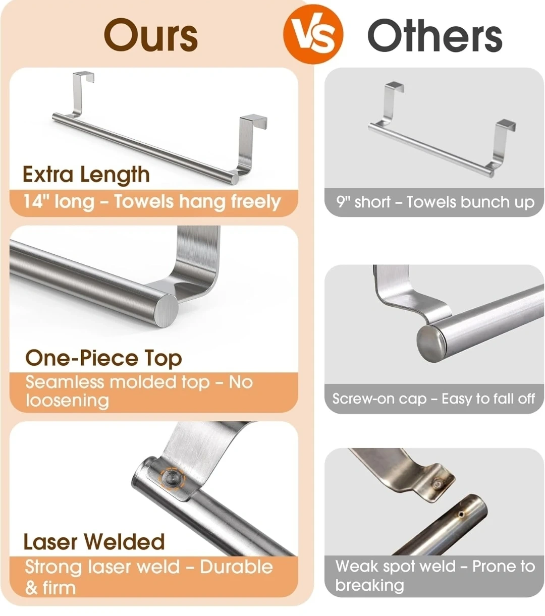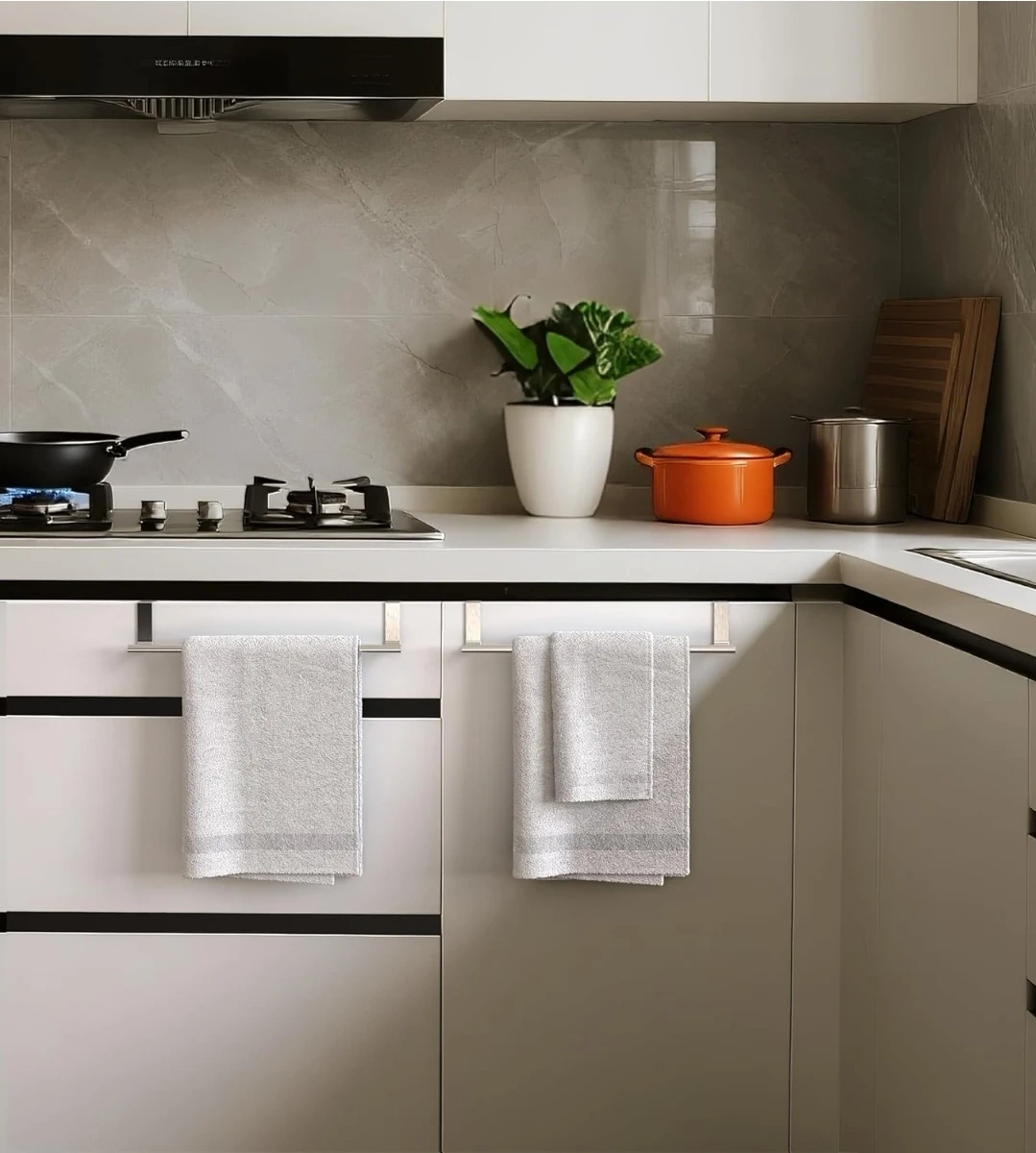 This is a CHAUNCEY HOME over-cabinet door towel rack. It's a 14-inch extra-wide stainless steel bar, perfect for kitchen and bathroom cabinets. It fits cabinet/wardrobe doors up to 0.8 inches thick. It's designed to hang towels freely and made with a one-piece top for seamless molding.