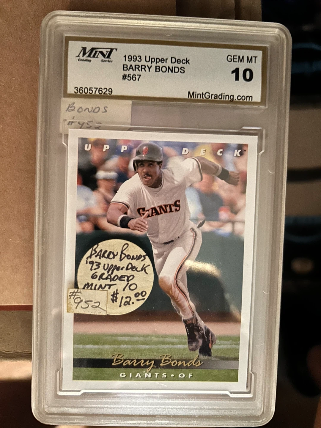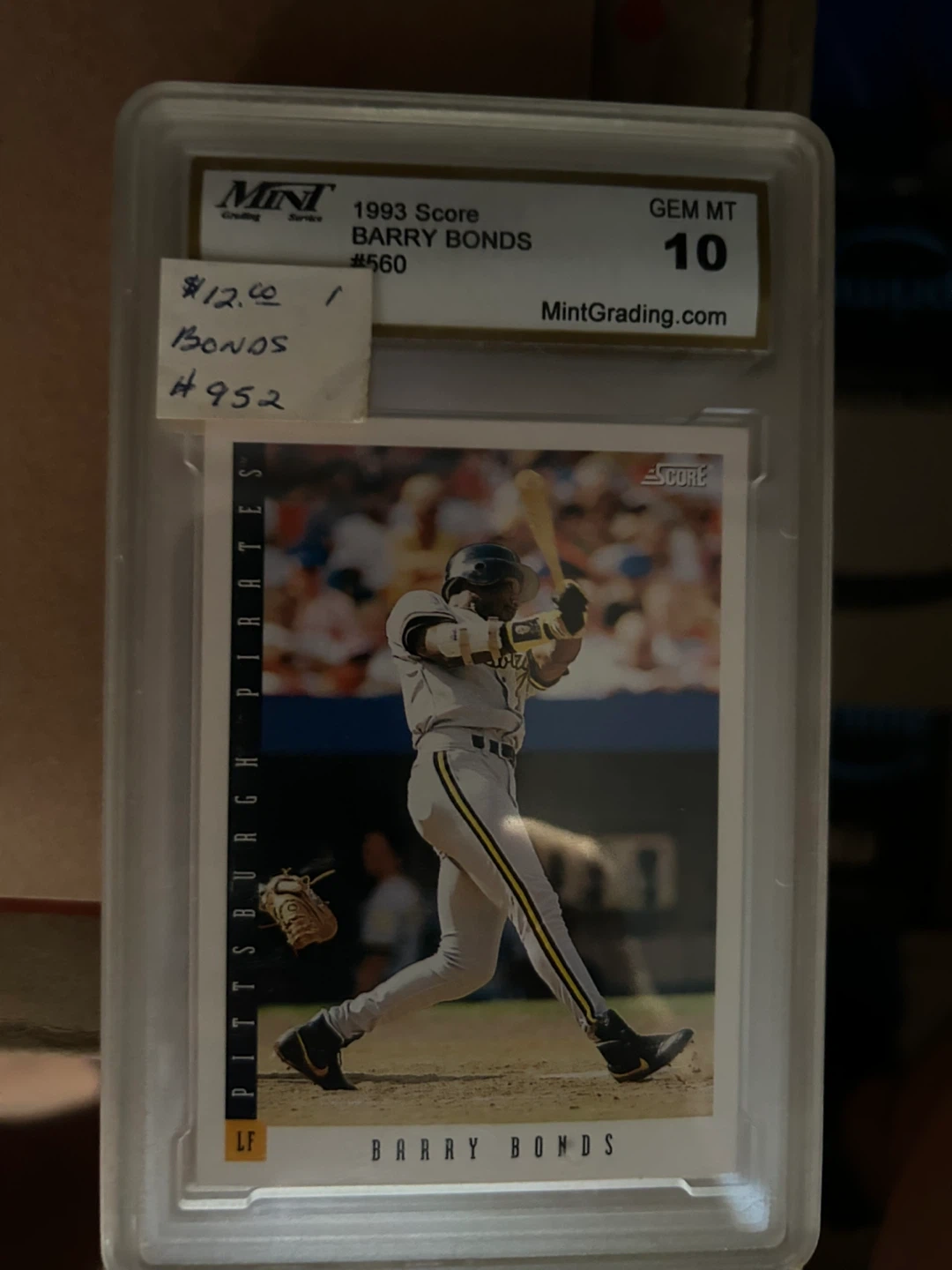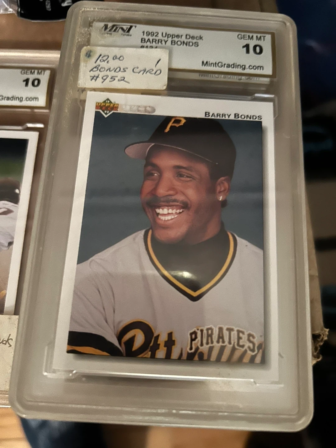 Selling a collection of Barry Bonds baseball cards, all graded GEM MT 10 by Mint Grading. These cards are from the early 1990s, including Topps, Score, and Upper Deck editions. Each card is encased and in excellent condition, perfect for any baseball card collector