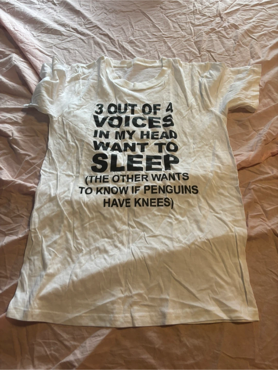 Here's a white t-shirt with the funny saying '3 Out Of 4 Voices In My Head Want To Sleep (The Other Wants To Know If Penguins Have Knees)'