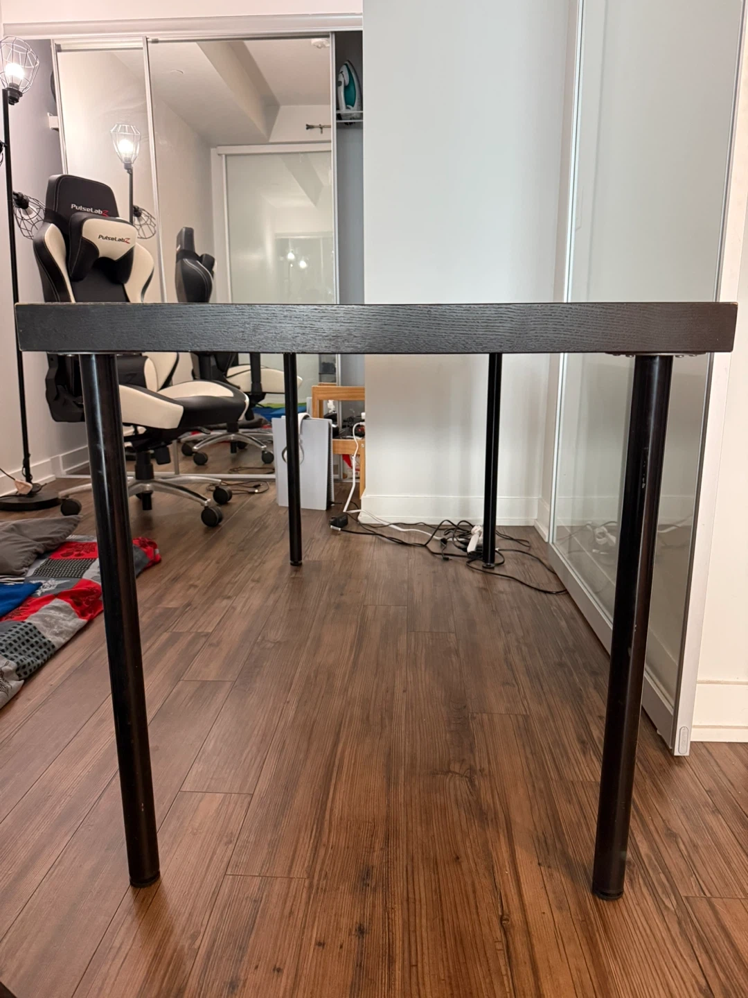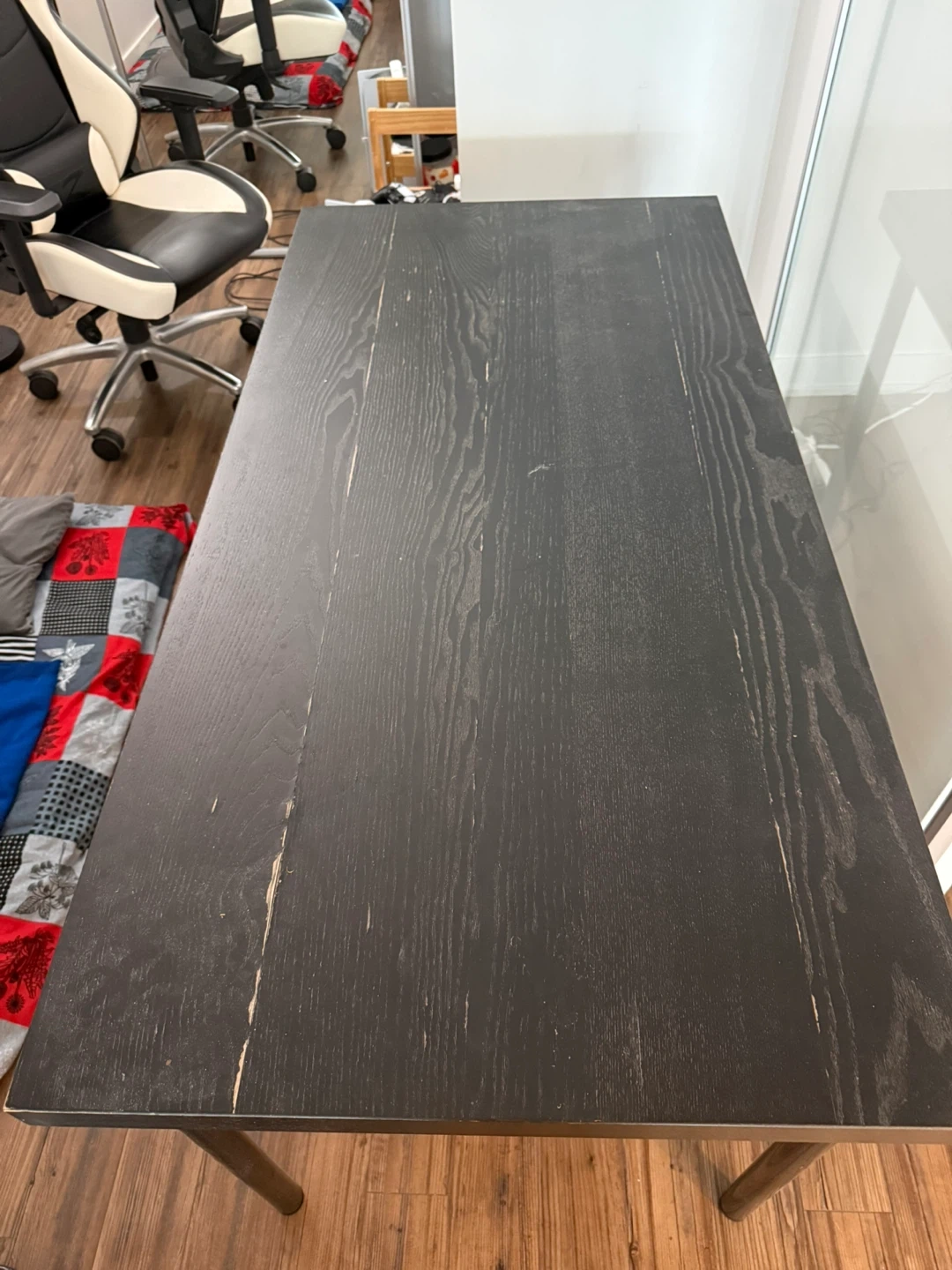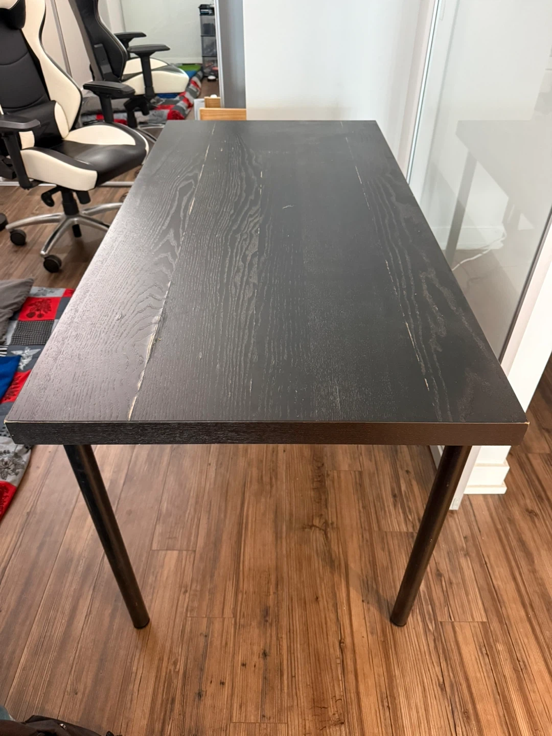 Selling a simple black wood desk. It's in good condition and would be great for a home office or study space. The desk has a clean and minimalist design, perfect for any room! There are some minor signs of wear, but overall it's sturdy and ready to use