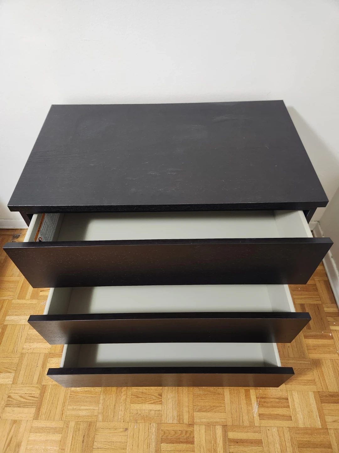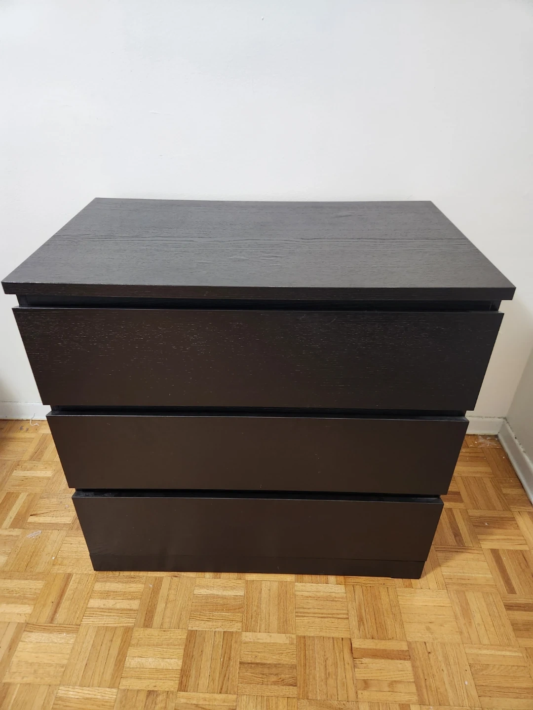 Selling a gently used IKEA 3-drawer dresser in black-brown. It's a great piece for adding storage to any room. The drawers slide smoothly, and it's in good condition. Ready for a new home!