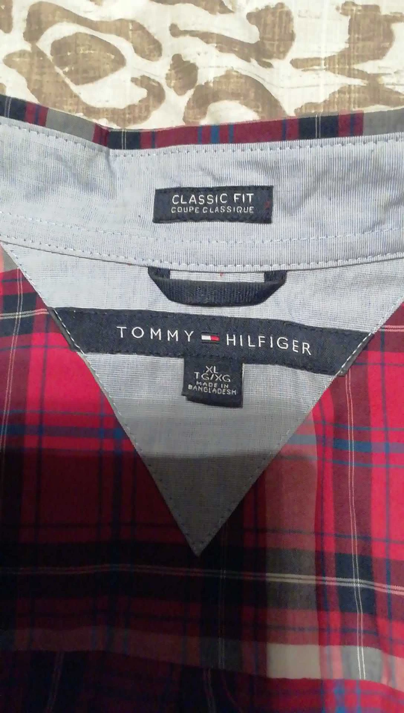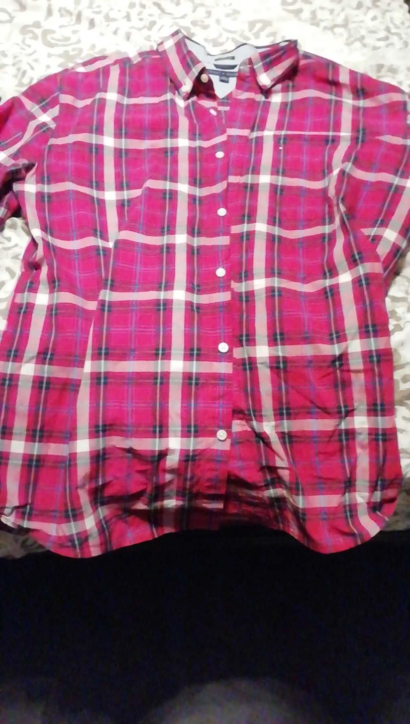 Tommy Hilfiger classic fit shirt in size XL. The shirt features a red and pink plaid pattern. It's in good condition and ready for a new home!