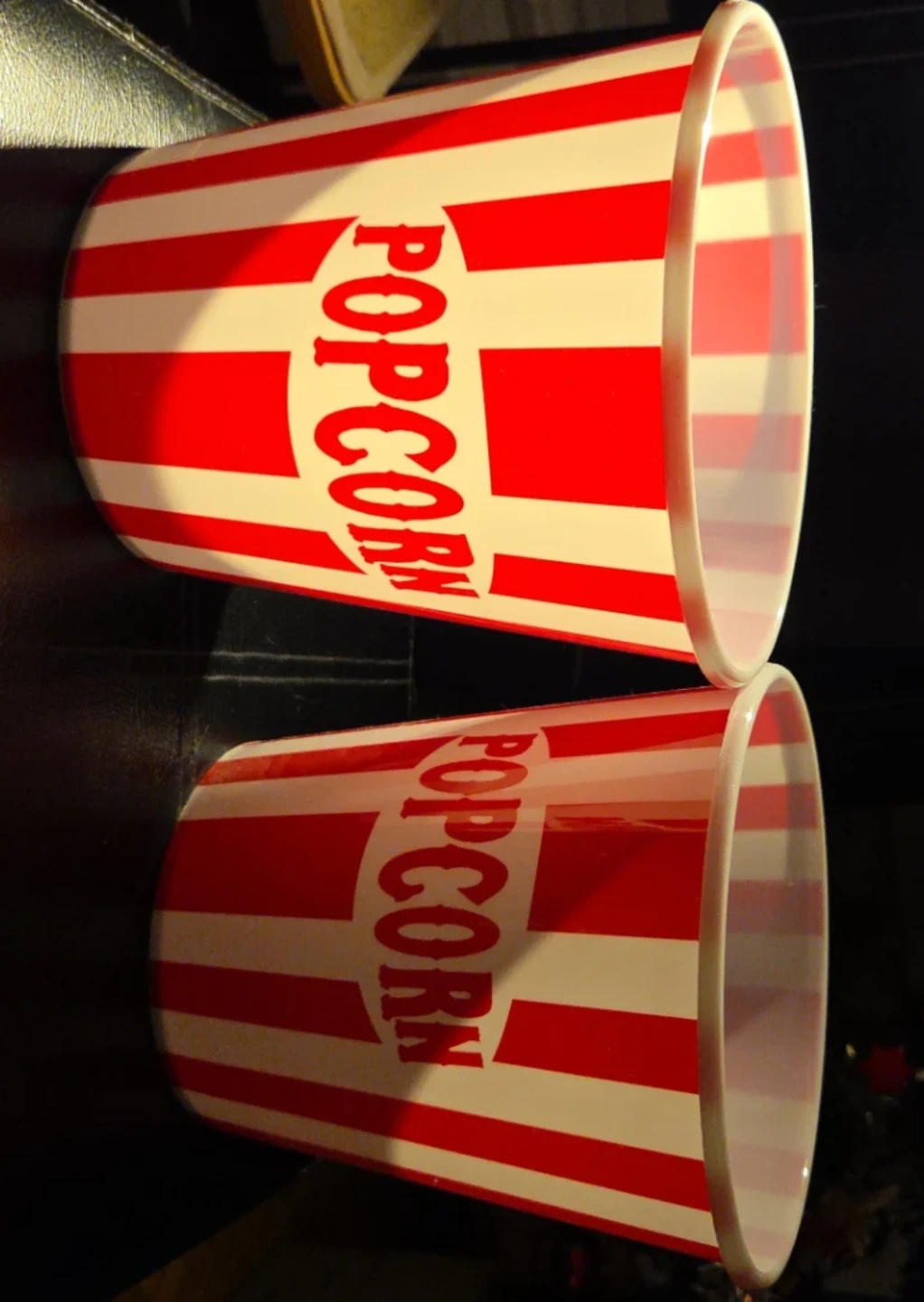 Selling a set of two popcorn buckets! They're red and white striped with the word 'Popcorn' printed on them. Perfect for movie nights at home!